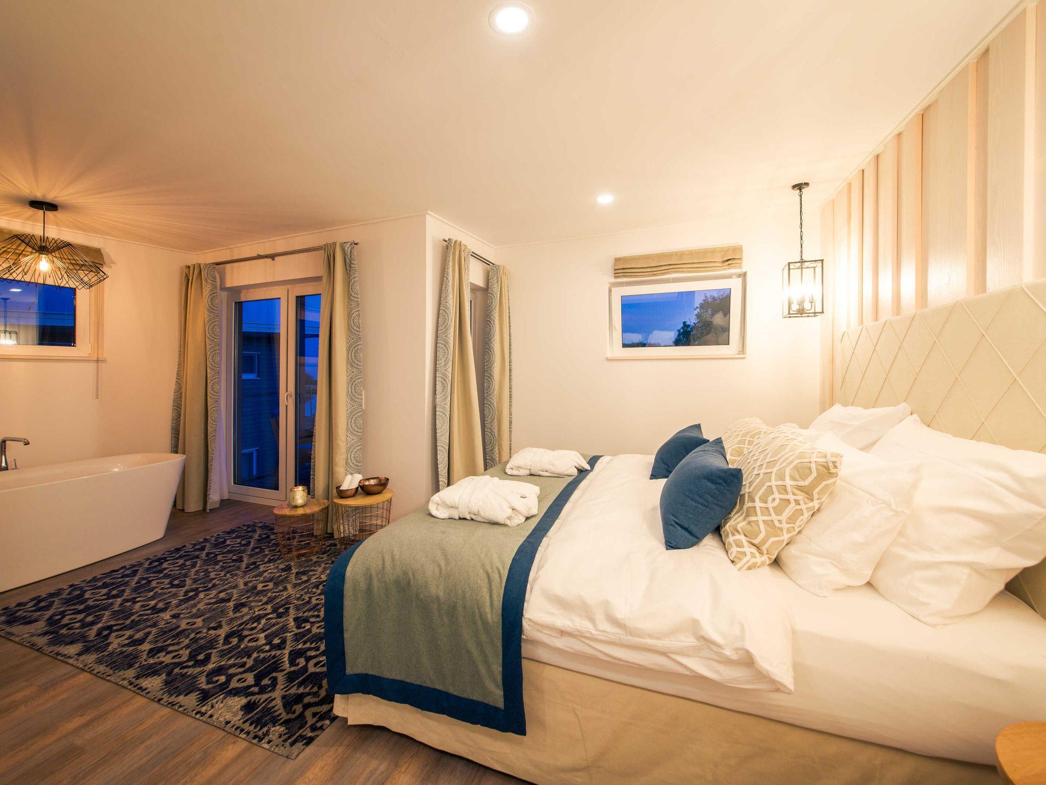 Tauchen Sie in die Welt der Entspannung und des Wohlbefindens. die freistehende Badewanne bietet einen wundervollen Blick auf das Wasser und den Schilfgürtel.