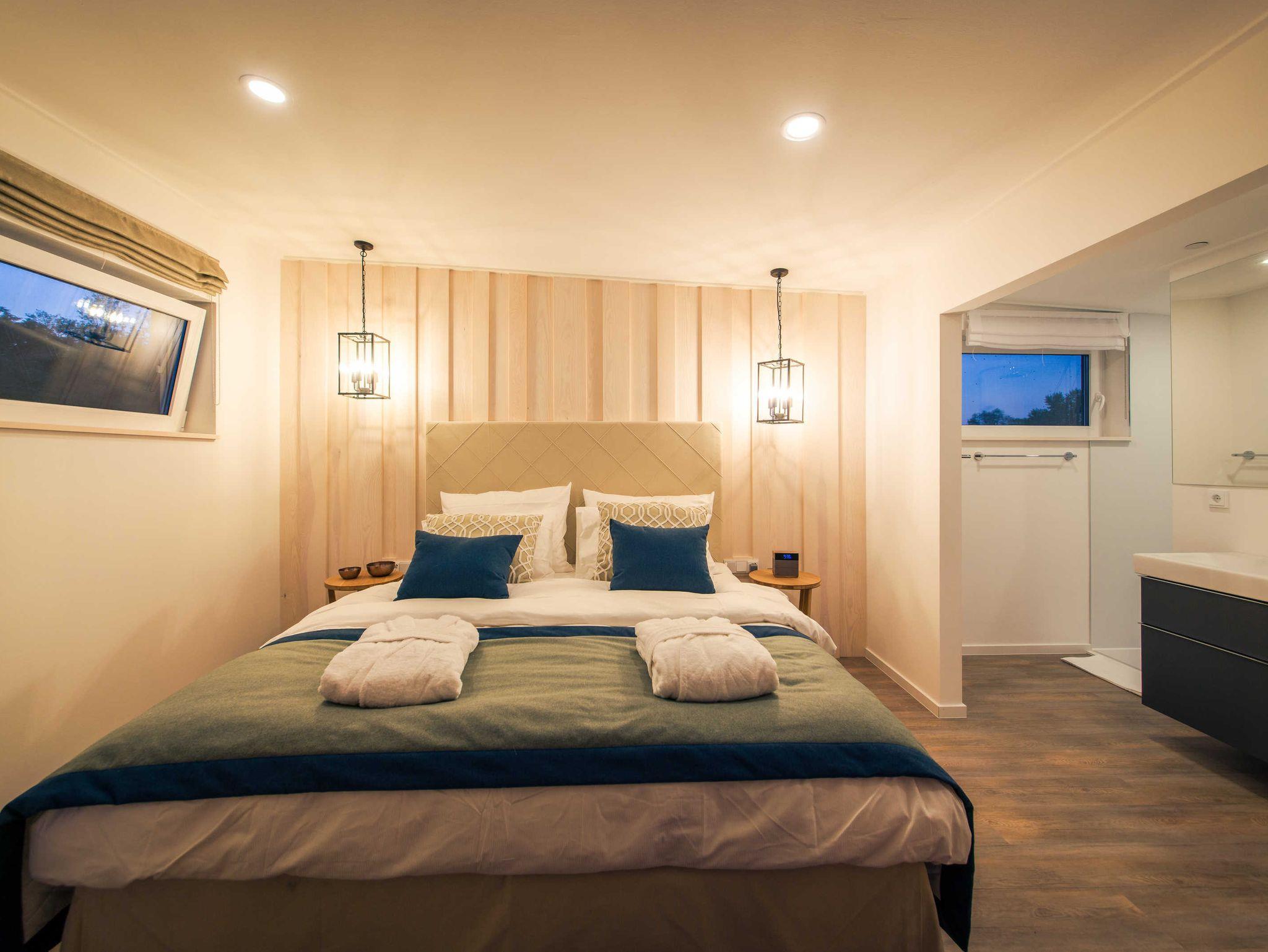 Viele Details und eine exklusive Einrichtung sorgen für ein Wohlfühlen im Hausboot auf den ersten Blick. Morgens lächelt die Sonne durch die bodentiefen Fenster und lässt den Tag mit viel Sonnenschein beginnen. Abends lädt die Terrasse mit einem Panorama-Blick über die Krumminer Wiek zu einem Glas Wein und einen Blick in den Sternenhimmel ein.
