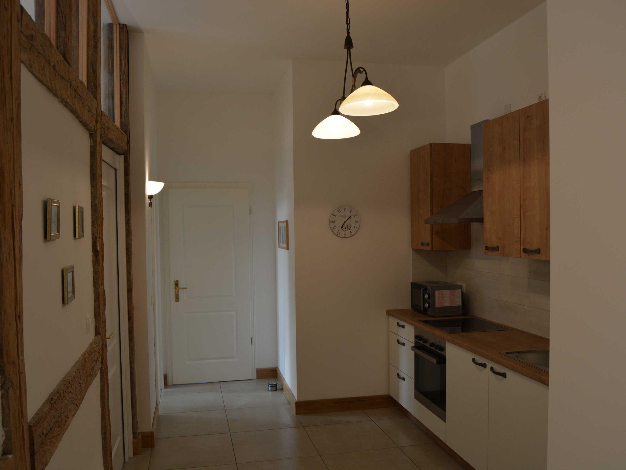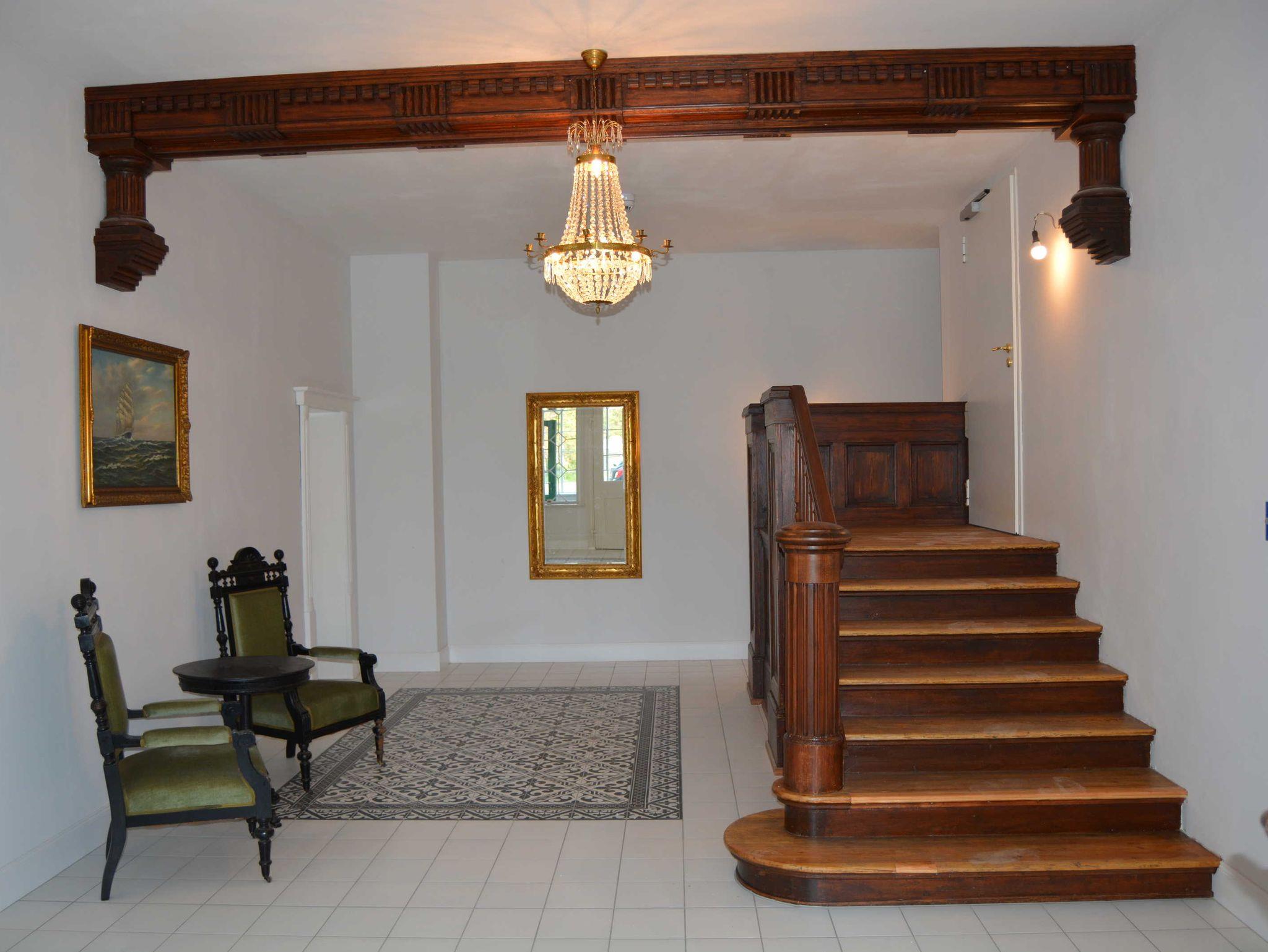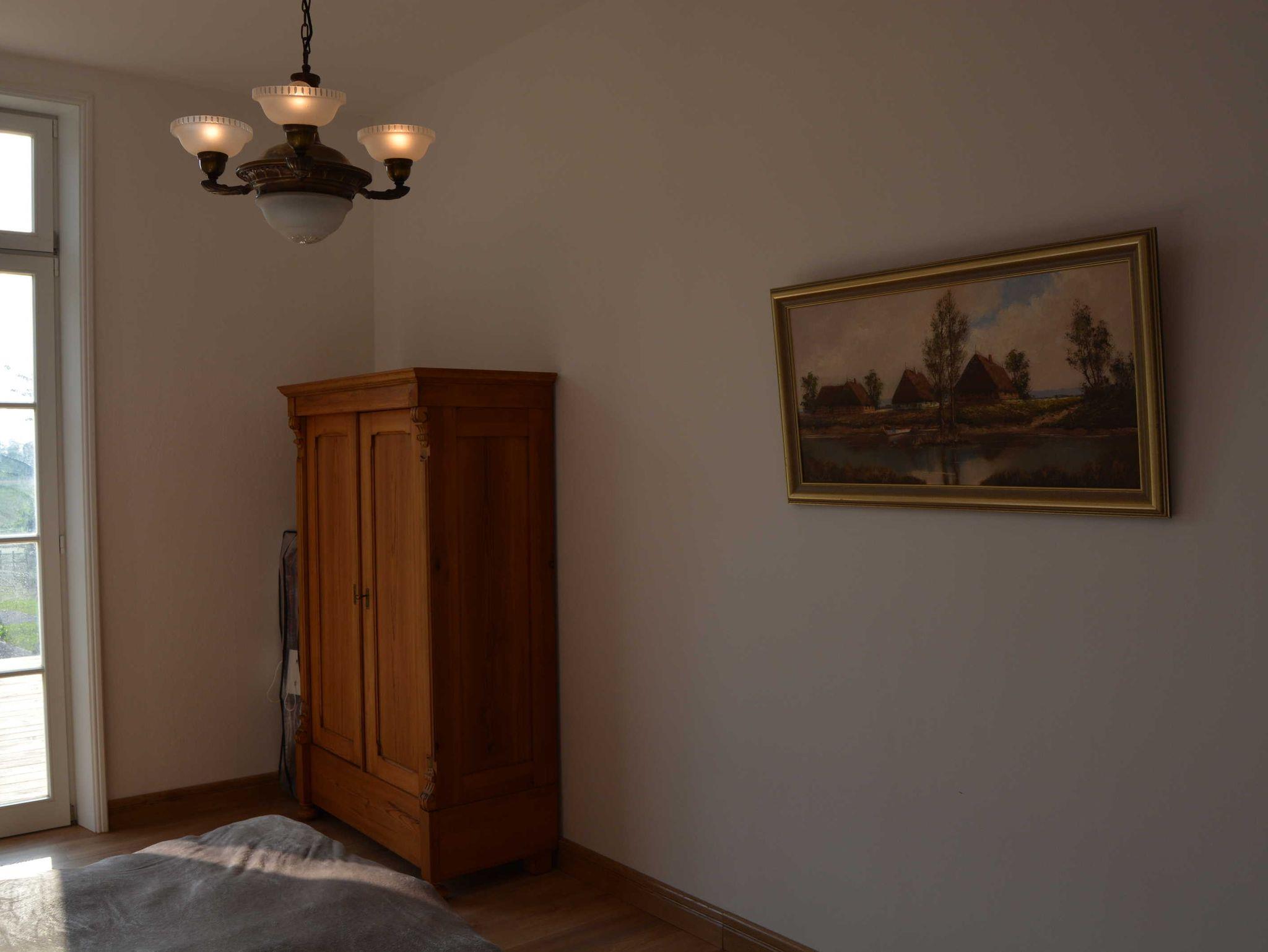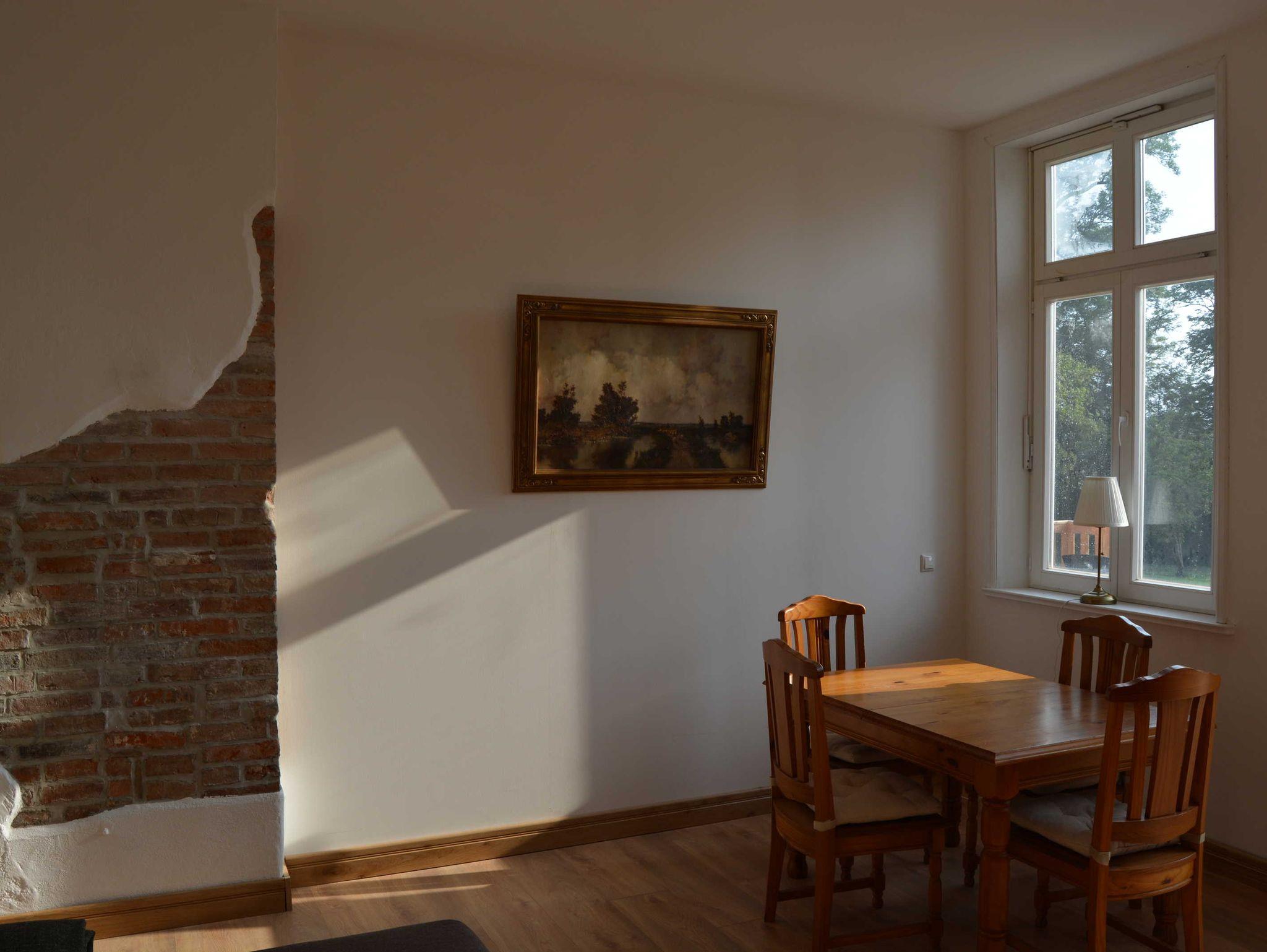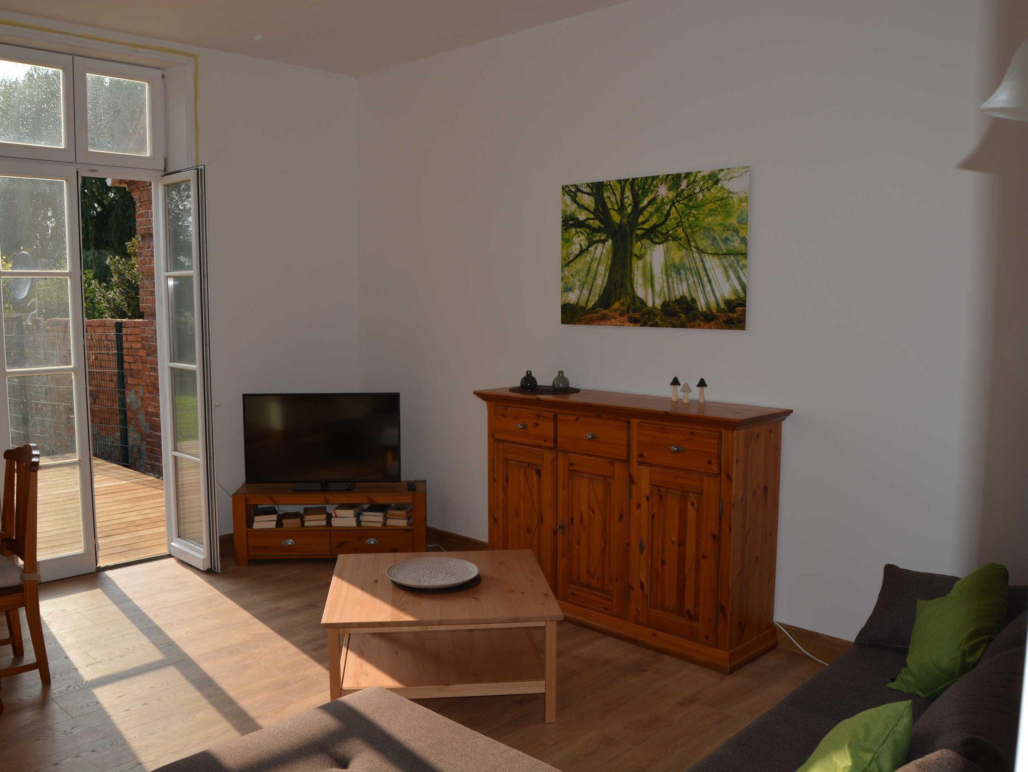 Die Ferienwohnung Hasengrube liegt im Erdgeschoss, ist ca. 71qm groß und wird ebenfalls über den vorgelagerten Wintergarten sowie die große Eingangshalle des Gutshauses erreicht.