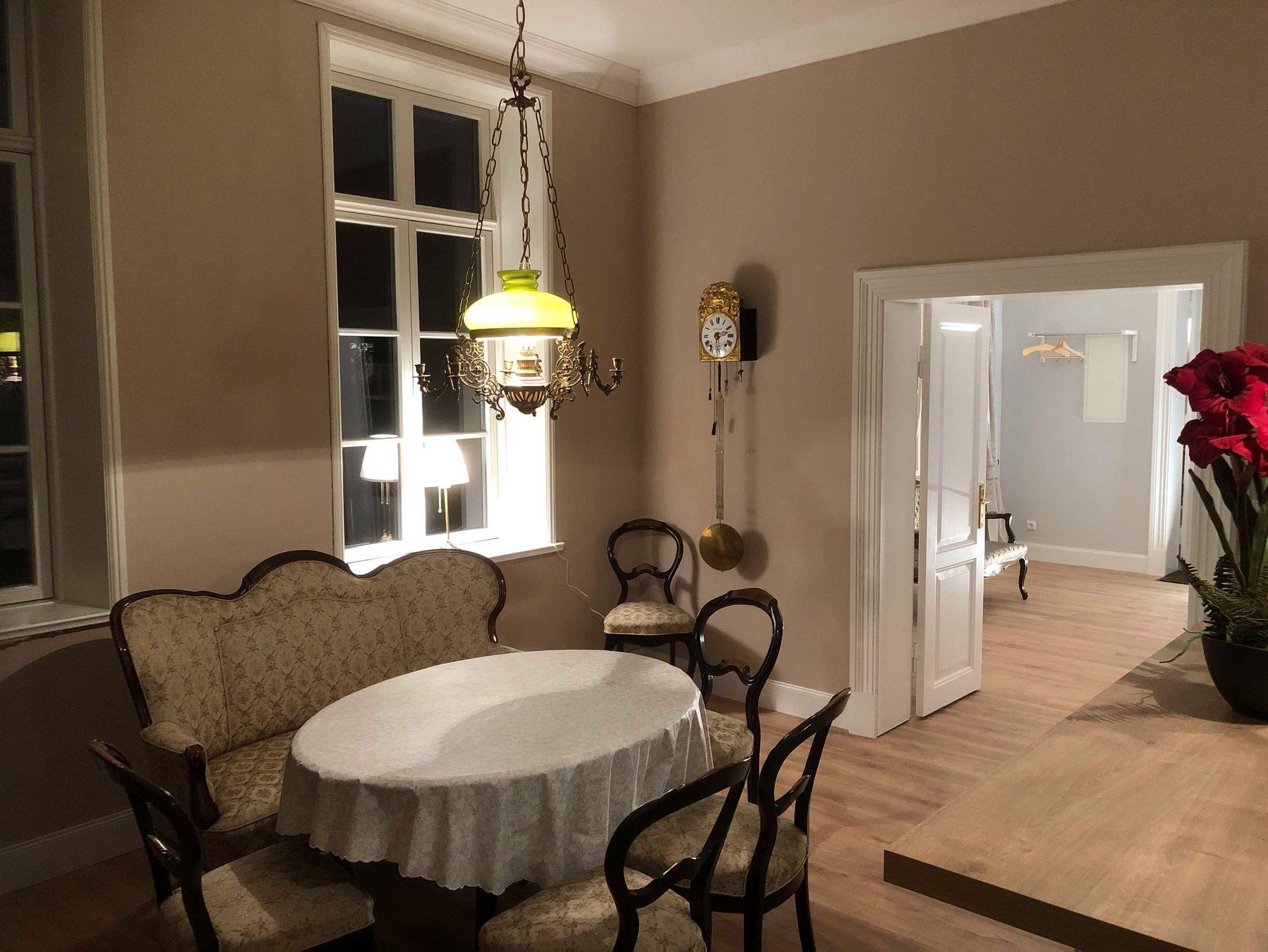 Die Ferienwohnung Hirschaue verfügt über 3 hohe Räume mit mehr als 70qm Gesamtfläche. Sie ist ebenfalls in ihrer Ausstattung klassisch-elegant kombiniert mit modernen Elementen angelegt. Die Aufbettungsmöglichkeiten im Wohnzimmer machen eine Nutzung für bis zu 4 Personen möglich.
