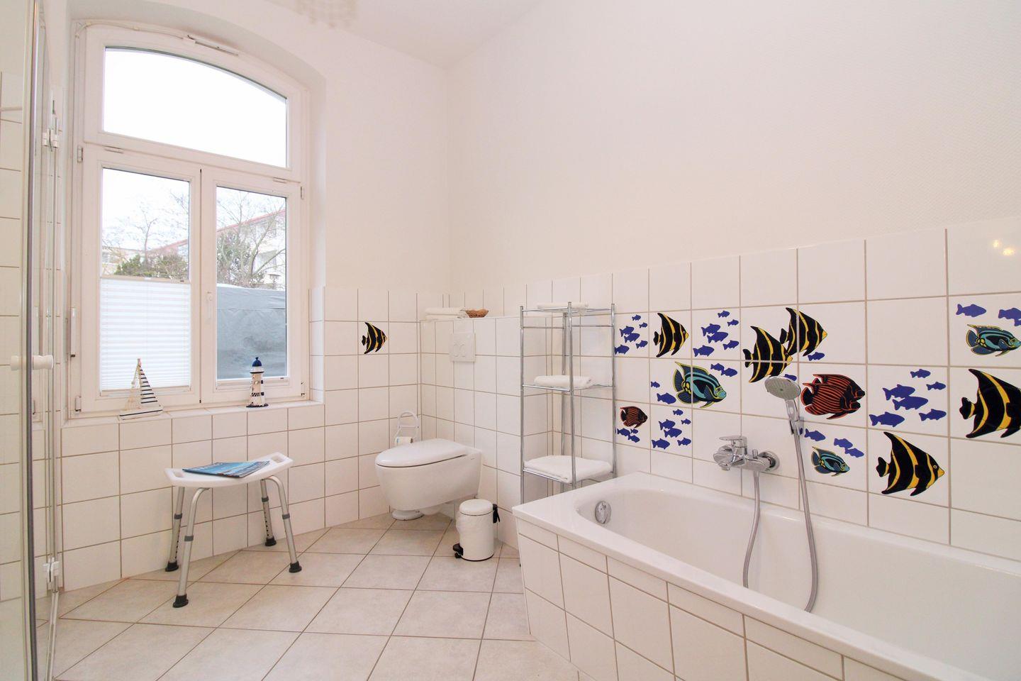 Das moderne und mit farbenfrohen, maritimen Dekorfliesen ausgestattete Badezimmer (mit Tageslicht / Fenster) verfügt über eine Dusche mit ebenerdigem Einstieg (seniorenfreundlich!) und Echtglas-Duschabtrennung, eine zusätzliche Badewanne, Waschbecken, WC, einen Badezimmer-Schrank, ein Regal, einen Föhn sowie ausreichend Ablagemöglichkeiten.