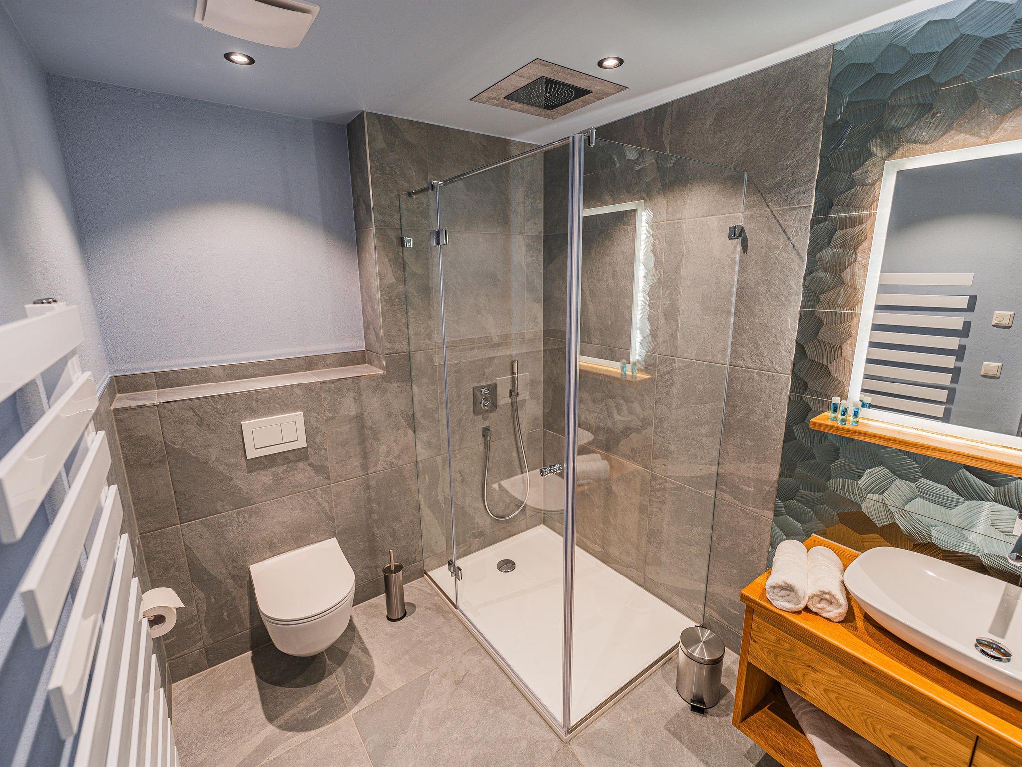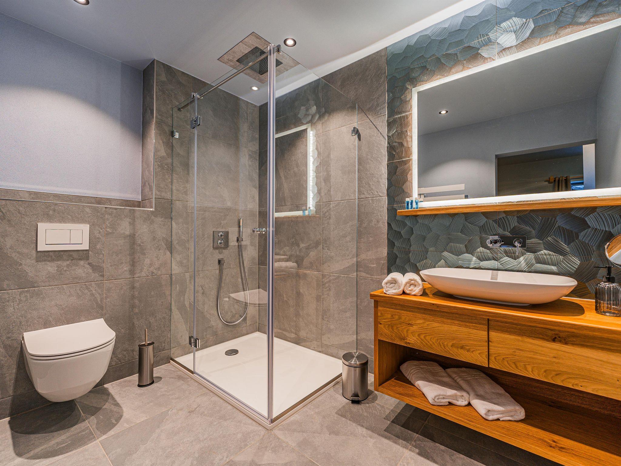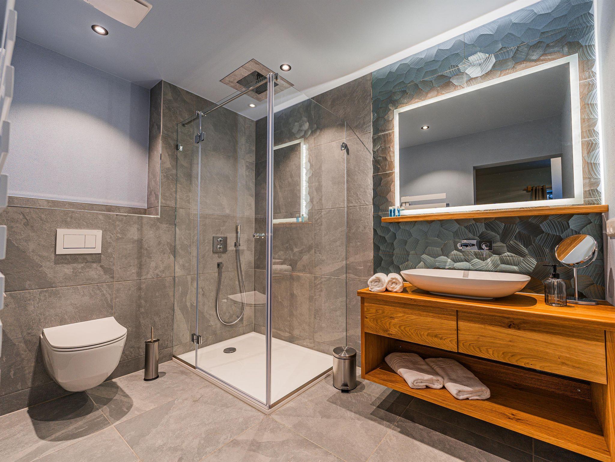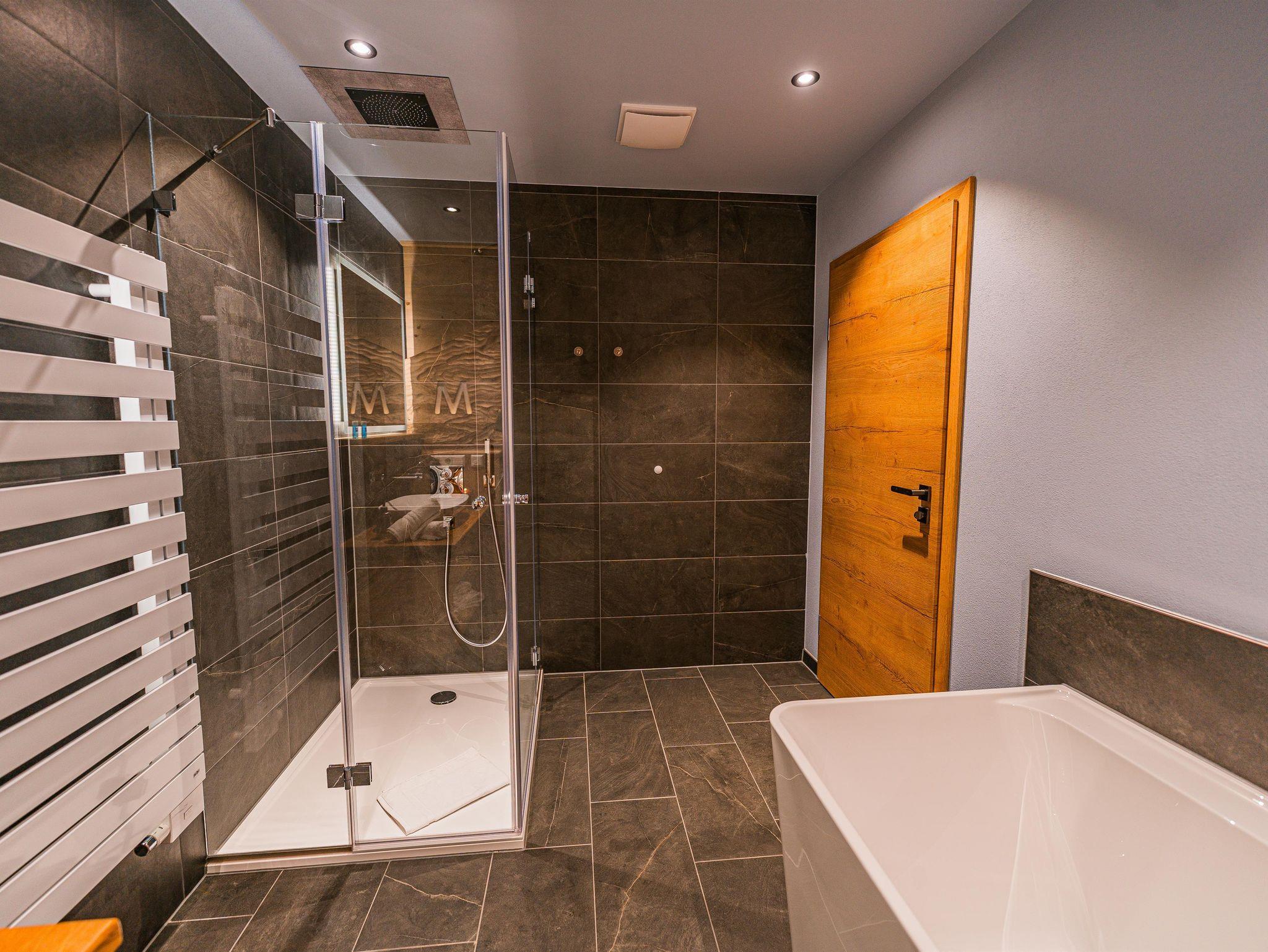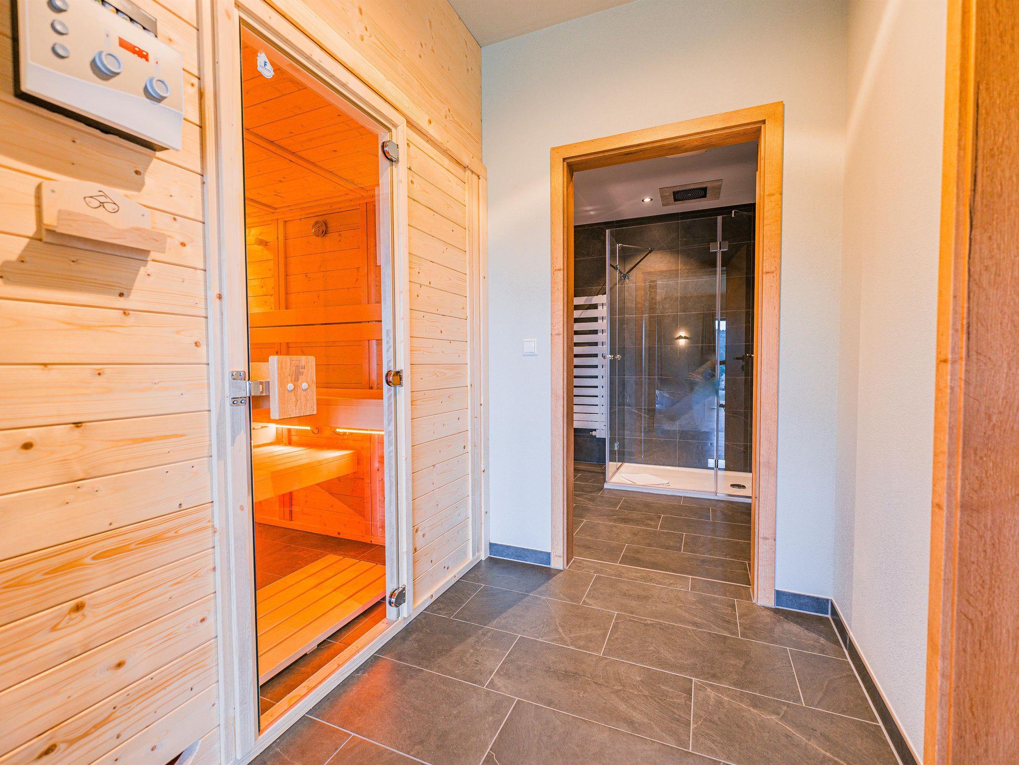 Die Privatsauna und das separate Bad mit Regendusche, Waschbecken und Badewanne lädt zur Entspannung ein.