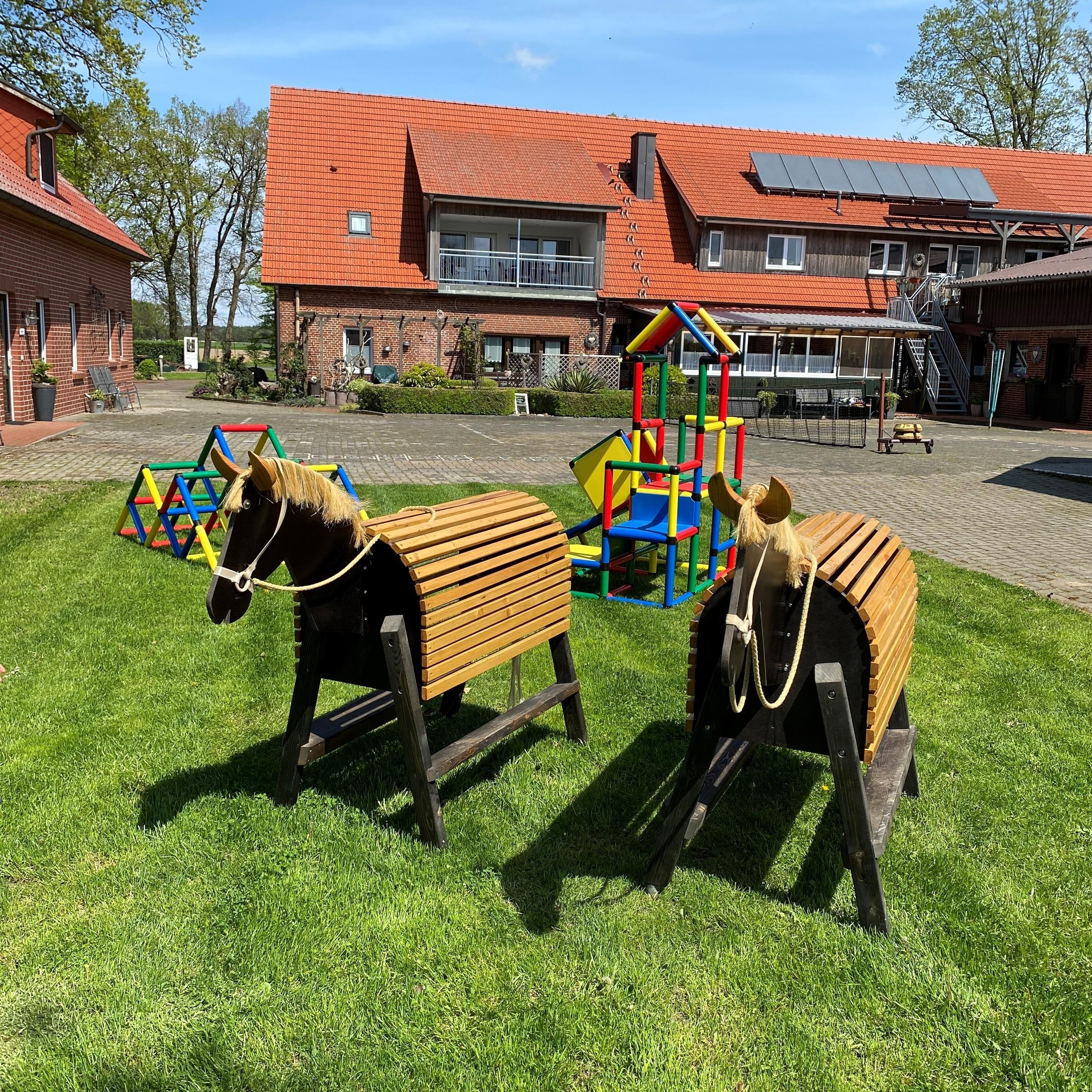 Kletterwand, Spielscheune, Großes Trampolin, viele Fahrzeuge für Kinder, großer Sandkasten und viele andere Spielmöglichkeiten, sowohl Innen als auch Außen.