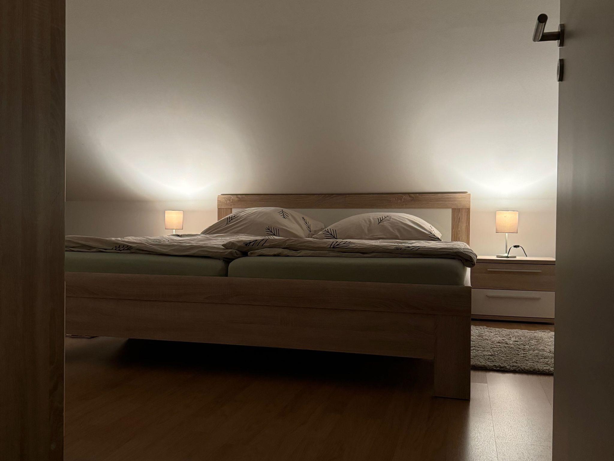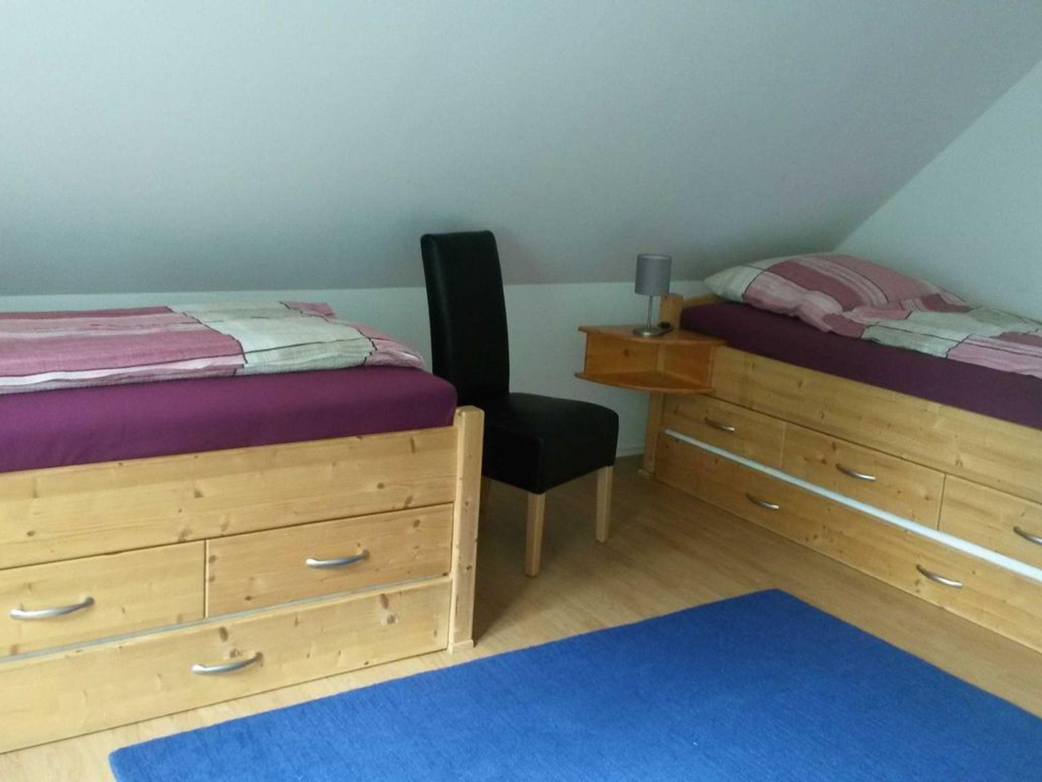 Die Ferienwohnung Holzmichel bietet Platz für bis zu 4 Personen in einem Doppelzimmer und einem Zimmer mit Einzelbetten. Die offene Küche im Erdgeschoss geht in einen Wohnbereich über, von dort aus gelangt man auf die Terrasse. Das Badezimmer im Erdgeschoss umfasst Dusche und WC, im ersten Stock befindet sich zwischen den Schlafzimmern ein Etagen-WC.