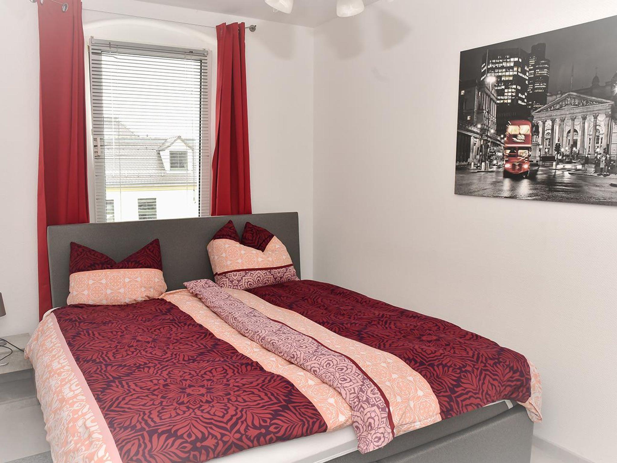 • 1 Schlafzimmer mit Doppelbett, Schrank für Garderobe und Spiegel