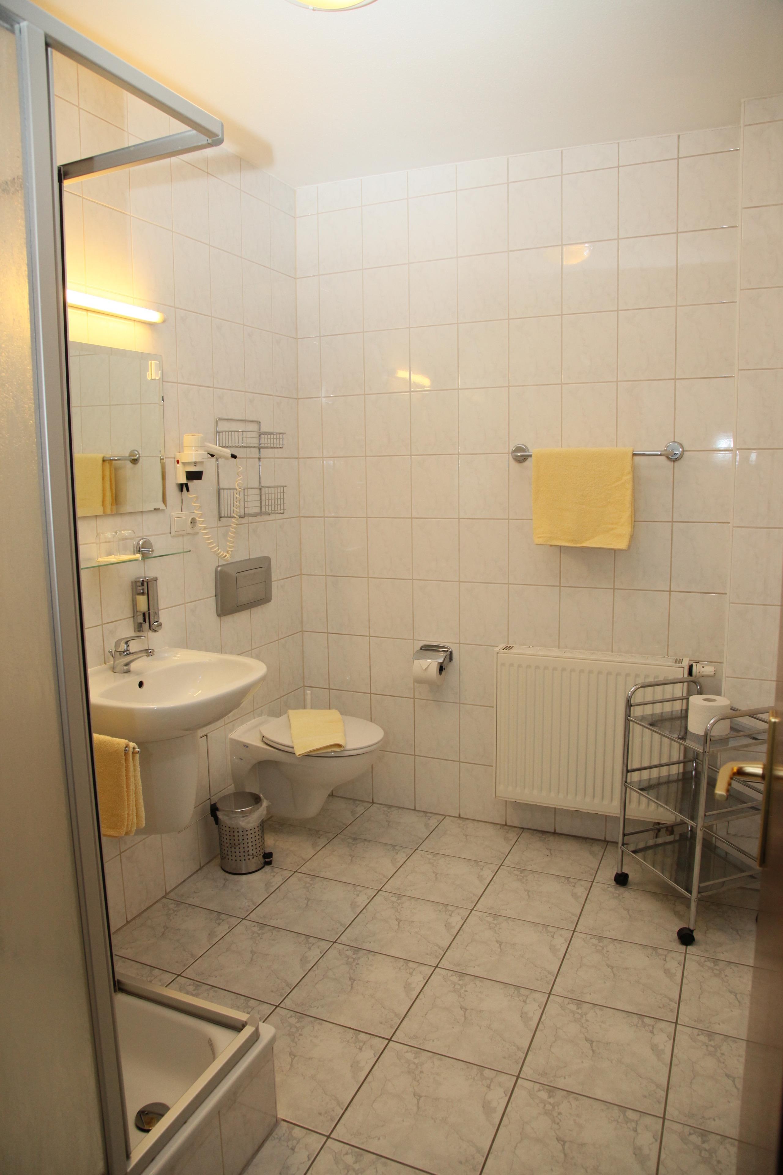 Das Bad ist mit einer Dusche und Föhn ausgestattet.
