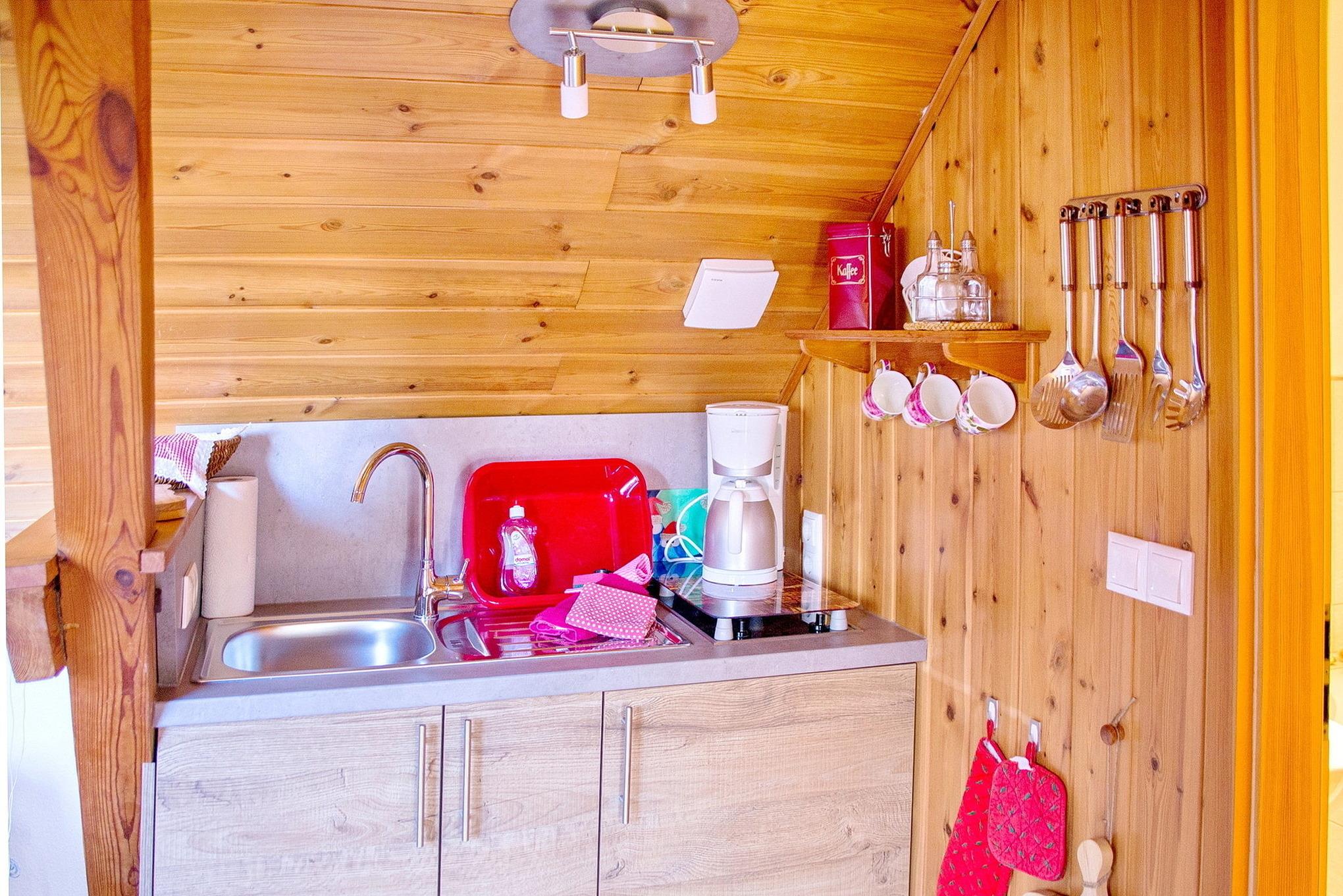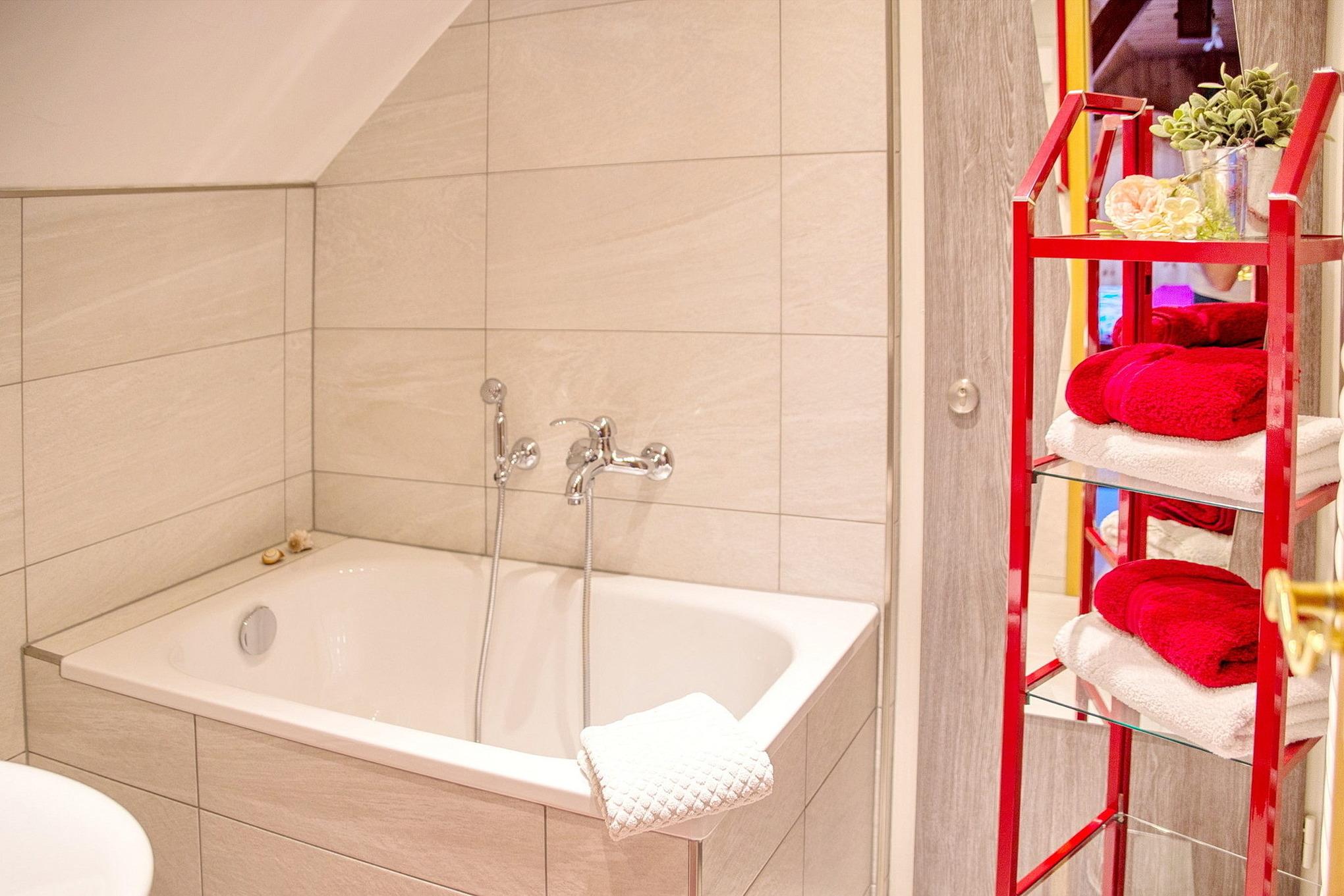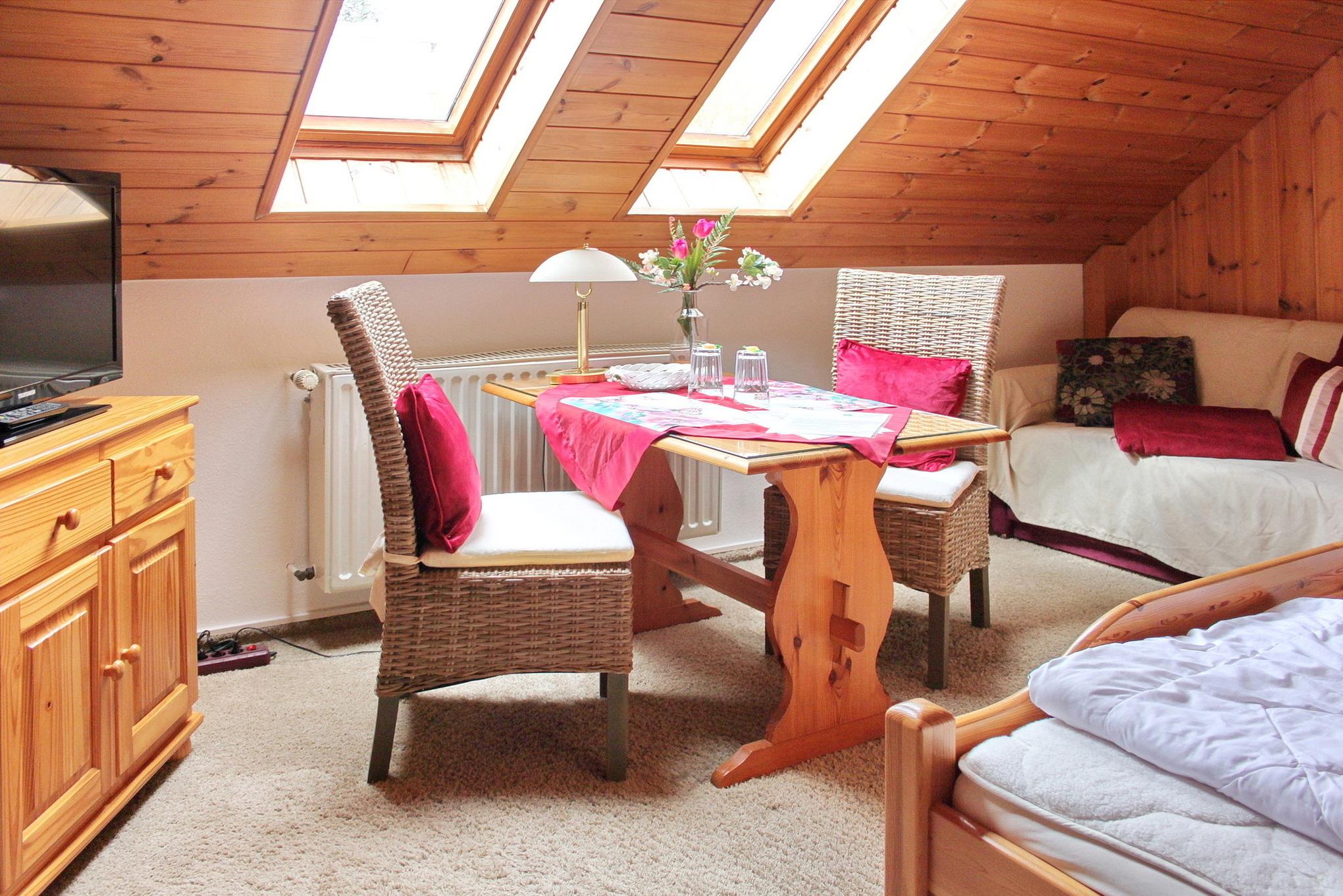 Die 25 qm große 1-Raum-Wohnung ist ideal ausgestattet für zwei Personen. Sie ist hochwertig und mit Liebe zum Detail romantisch eingerichtet, die warmen Farben erschaffen eine Atmosphäre zum Wohlfühlen. Die Pantryküche befindet sich unter einer Dachschräge und ist ausgestattet mit einer Spüle, einem Ceran Herd mit zwei Platten, Kühlschrank mit Gefrierfach, Wasserkocher Toaster und Kaffeemaschine. Der Schlafraum bietet neben einem großzügigen Doppelbett (1,80 x 2,00 m), einem Kleiderschrank mit viel Stauraum auch einen Essbereich mit gemütlicher Sitzecke sowie einem Sofa. Zur Unterhaltung bietet die Wohnung einen Flachbild TV und eine Stereoanlage. Der Schlafraum verfügt über ausreichend Platz für ein Babyreisebett. Das moderne Bad mit Fliesen in Holzoptik ist mit einer Sitzbadewanne und einer Toilette ausgestattet. Über dem Waschbecken befindet sich ein großer beleuchteter Spiegel. Außerdem sind ein Föhn sowie Handtuchtrockner vorhanden. Aus Rücksicht auf andere Gäste ist das Rauchen in der Wohnung nicht gestattet. WLAN ist kostenfrei.