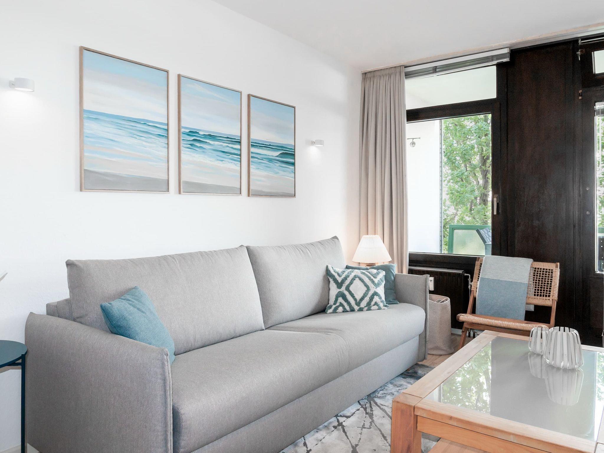 In strandnaher Lage, mit neuer moderniesierter Ausstattung lädt diese helle Wohnung zu einem erholsamen Urlaubsaufenthalt ein. Zu erreichen ist sie sowohl vom Hauseingang als auch von der Tiefgarage direkt mit dem Aufzug. Wohnraum, Küche und Bad gehen vom Flur ab. Das ansprechende Wohnzimmer mit Westbalkon zur Kaiserallee besteht aus einer gemütlichen Sitz-/Schlafcouch (180 x 200 cm) mit Tisch und einer Essecke. Vom Wohnzimmer erreichen Sie das großzügige Schlafzimmer mit seitlichem Meerblick vom Südbalkon. Ausgestattet ist es mit einem bequemen Boxspringbett (2x 100 cm x 200 cm), einer Sitz-/Schlafcouch (115 x 186 cm) sowie einem Kleiderschrank und einer Kommode. Das Duschbad ist hell und modern. Die Einbauküche lässt keine Wünsche. Rundum, eine schöne Wohnung zum Wohlfühlen für die ganze Familie.