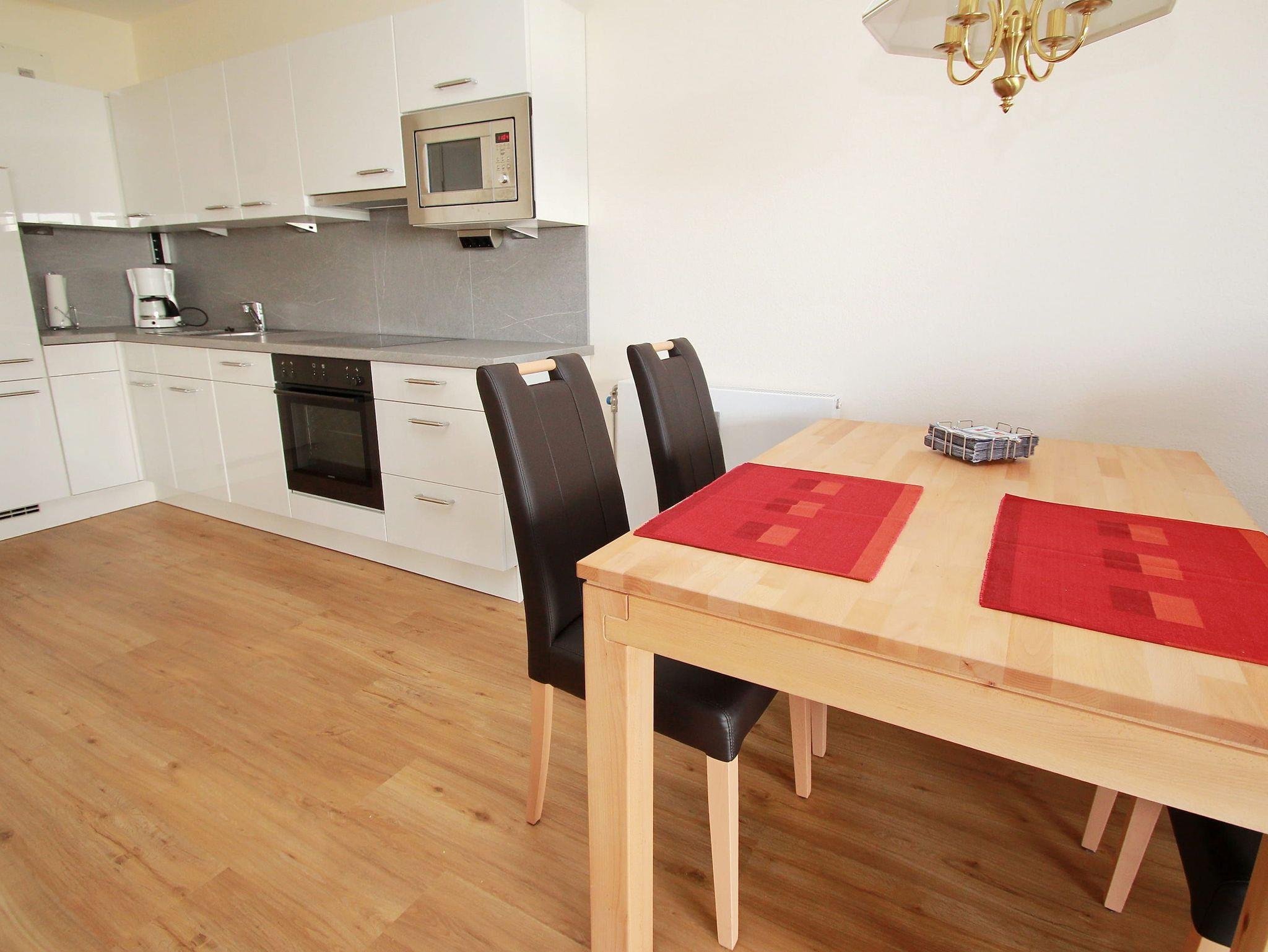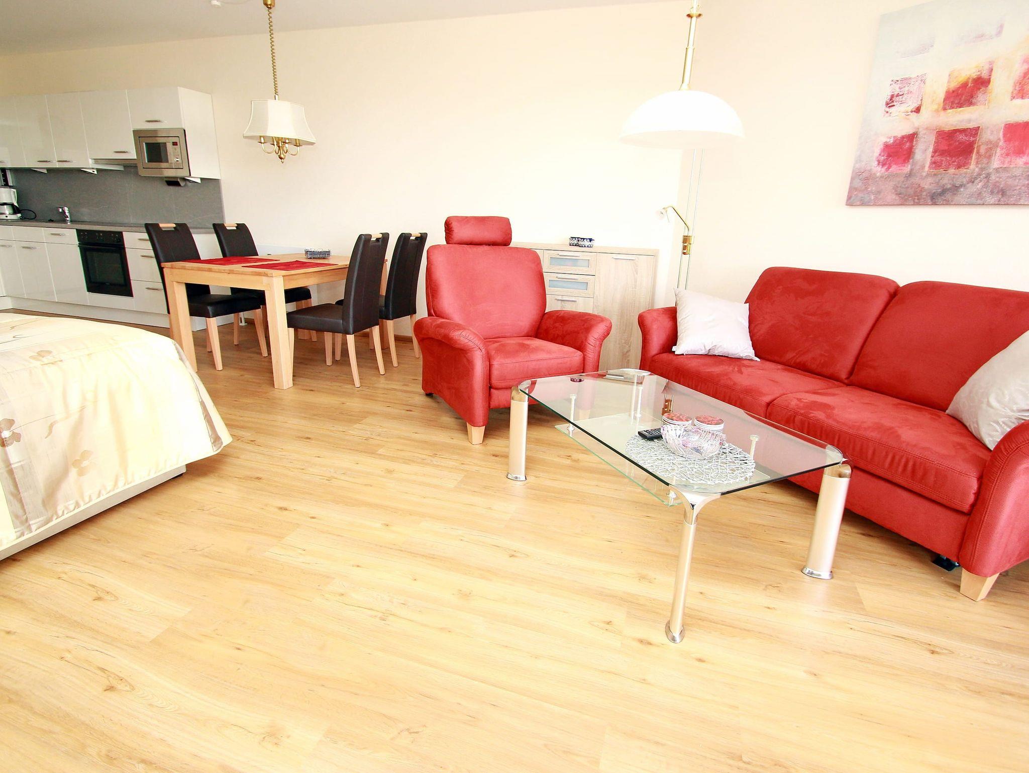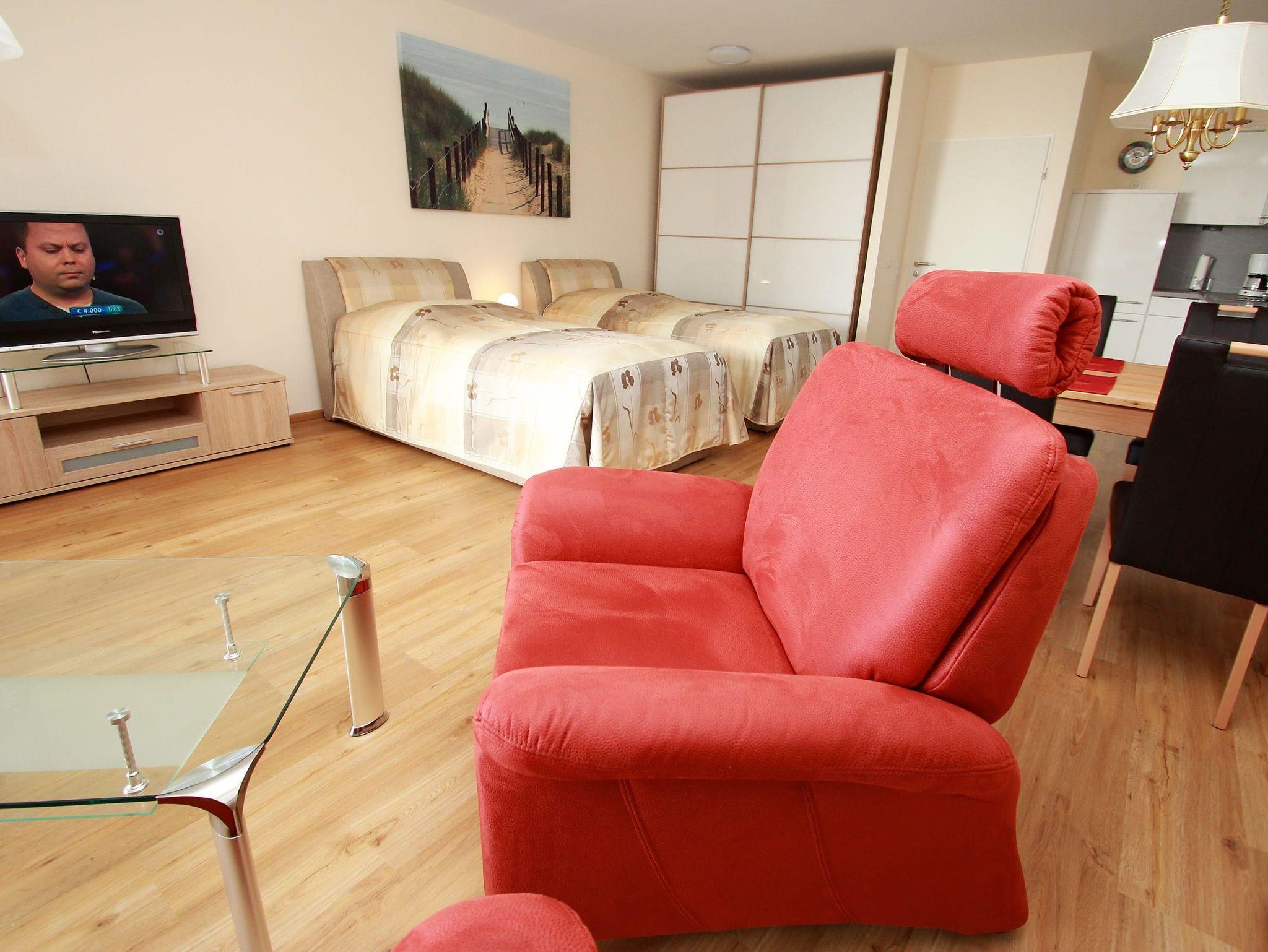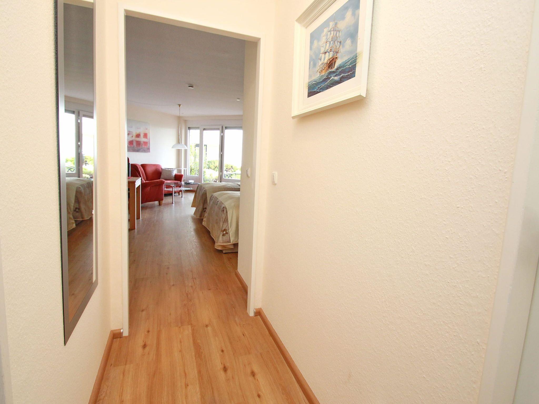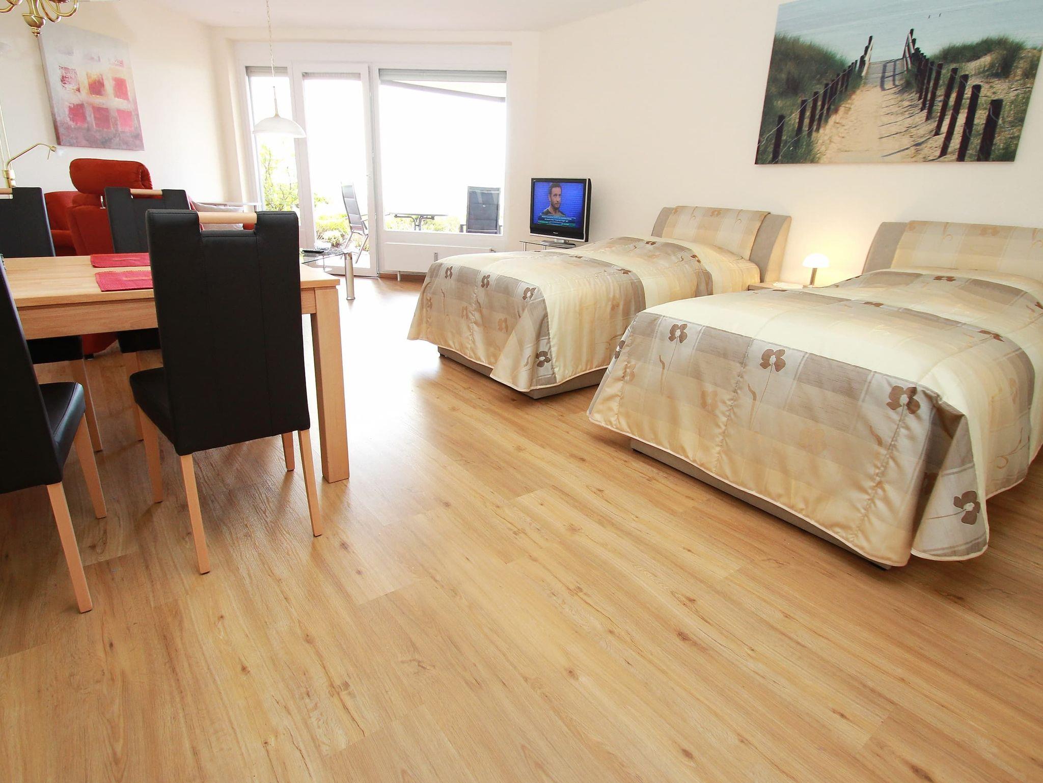 Dieses empfehlenswerte, hochwertige Appartement mit günstigen Übernachtungspreisen hat eine exklusive Ausstattung und lädt von Anfang an zum Wohlfühlen ein. Vom Wohnungseingang gelangen Sie in den Flur mit Garderobe, vom dem das helle, moderne Duschbad abgeht. Weiter geht es zum gemütlichen Wohnraum, wo Sie links eine offene Küche und eine Essecke vorfinden. Des Weiteren stehen im Wohnraum eine bequeme zweiteilige Couchgarnitur mit Tisch sowie zwei schöne Einzelbetten (je 100 cm x 200 cm) und ein Kleiderschrank. Auf der Terrasse genießen Sie zu jeder Jahreszeit den herrlichen Meerblick und können das beschauliche Spiel der Segelboote im Wind beobachten.