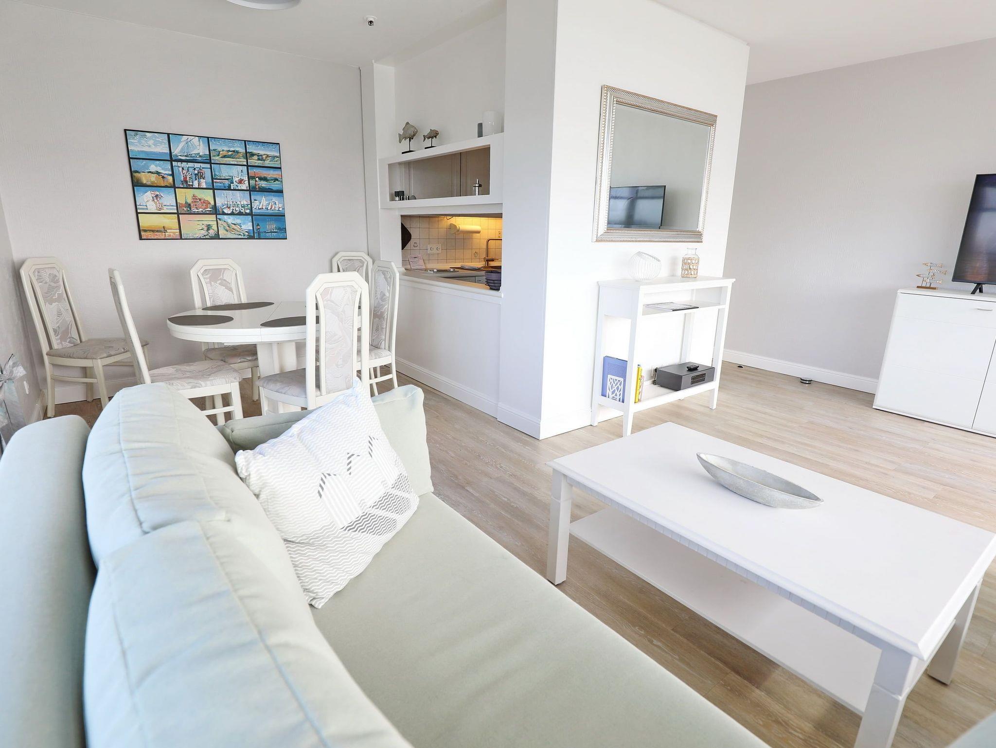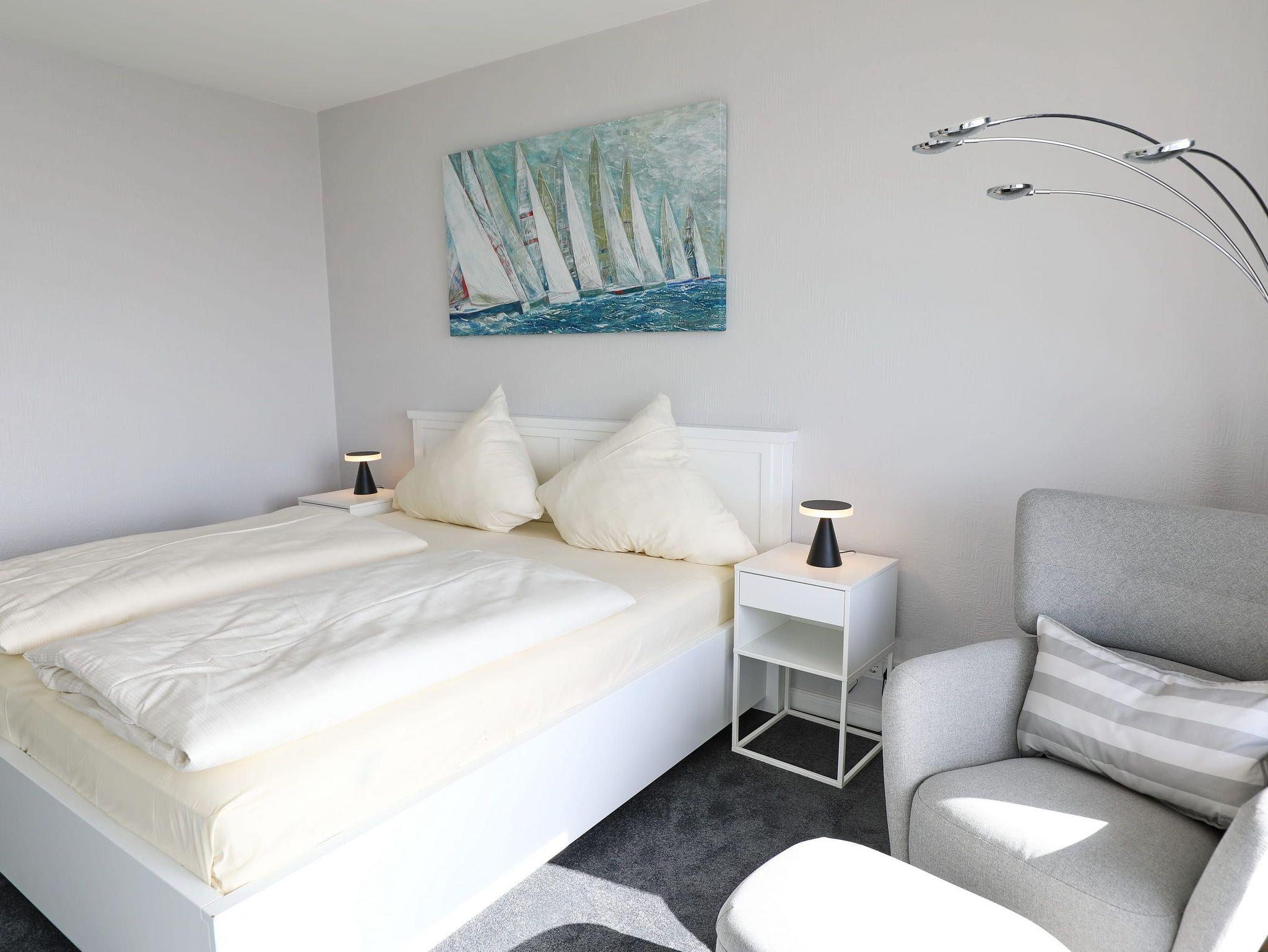 Dieses elegante und komfortable Appartement bietet für höchste Ansprüche ein Wohnfühlerlebnis zum Entspannen fern des Alltags. In dieser großzügigen hellen Wohneinheit, mit großer Fensterfront im Wohnzimmer stehen zwei bequeme Couchgarnituren mit passendem Couchtisch sowie ein schicker Esstisch mit Stühlen. Die moderne Küche, mit Durchreiche zum Esstisch, lässt keine Wünsche offen. Im Schlafzimmer erwarten Sie ein schönes Doppelbett (2x 90 cm x 200 cm) und eine Kleiderschrankwand mit einem Relaxsessel vor dem Fenster. Weitere schöne Dekorationen laden zum Wohlfühlen ein. Den sonnigen Eckbalkon erreichen Sie von beiden Wohnräumen, um den Blick zur Trave mit lebhaftem Schiffsverkehr und Altstadt bis zum Skandinavienkai zu erleben.