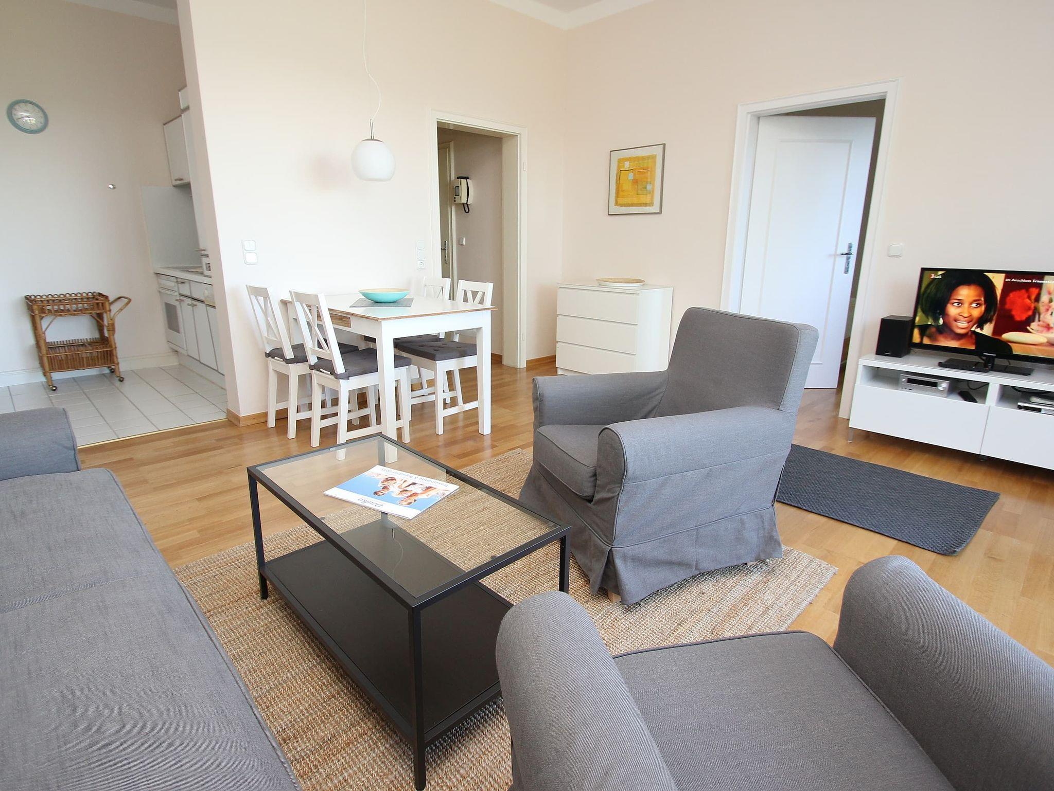 Terrasse, Außenjalousien, Küche, Geschirrspüler, Duschbad/WC, Fön, TV, Stereoanlage, kostenl. W-Lan, Aufzug, inkl. Tiefgaragenstellplatz (Einfahrtshöhe: 1,95 m).