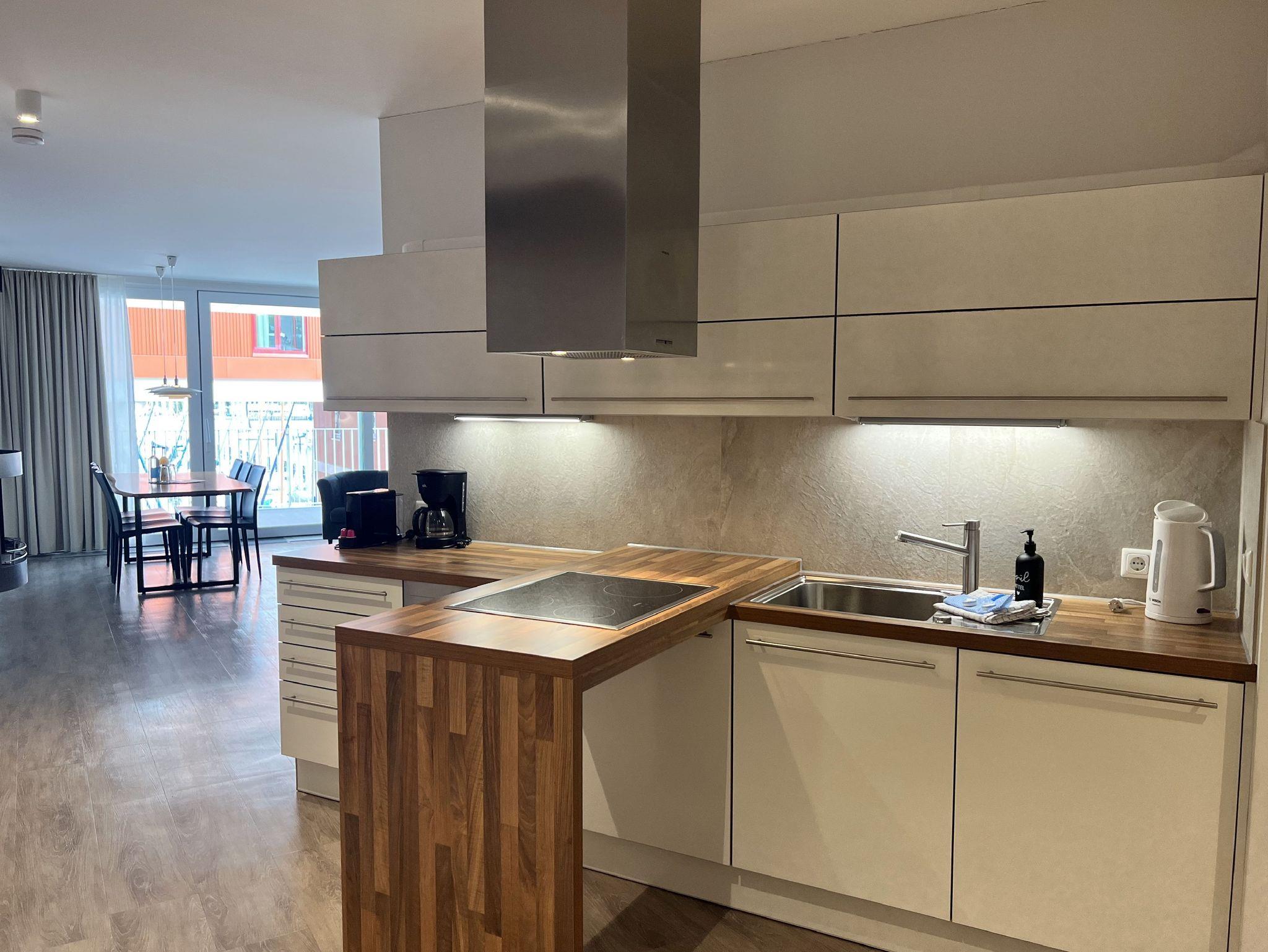 Regendusche. Im Wohnbereich sorgen am Abend die Flammen des Bioethanolkamins für eine gemütliche Atmosphäre, ebenso wie die vorbeifahrenden großen Schiffe mit ihrer eindrucksvollen nächtlichen Beleuchtung.