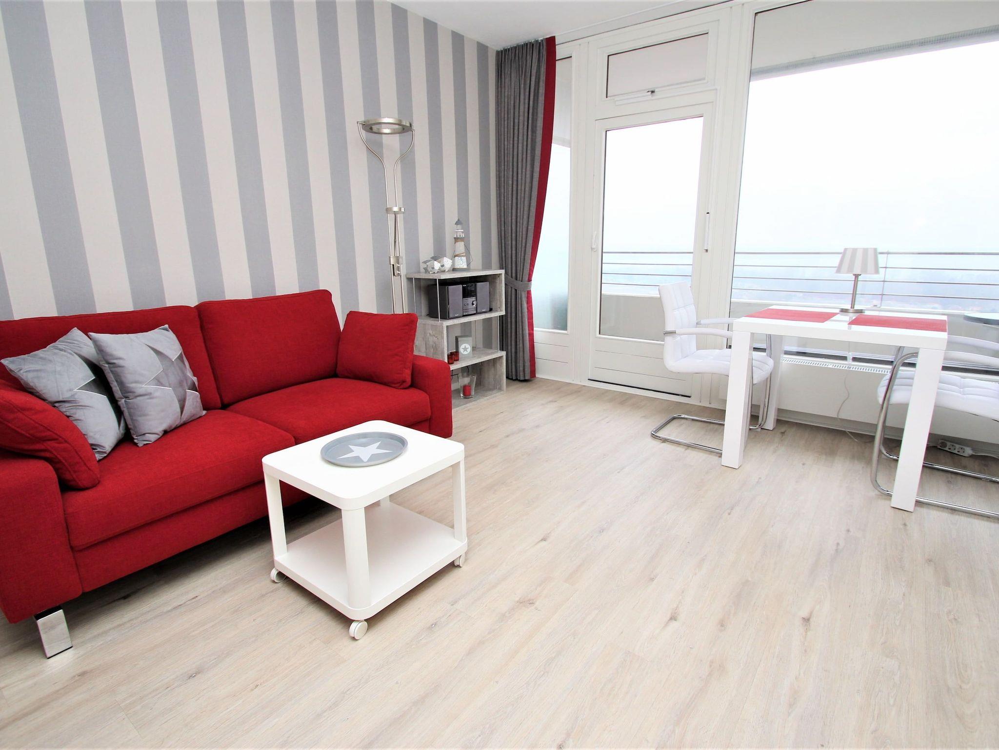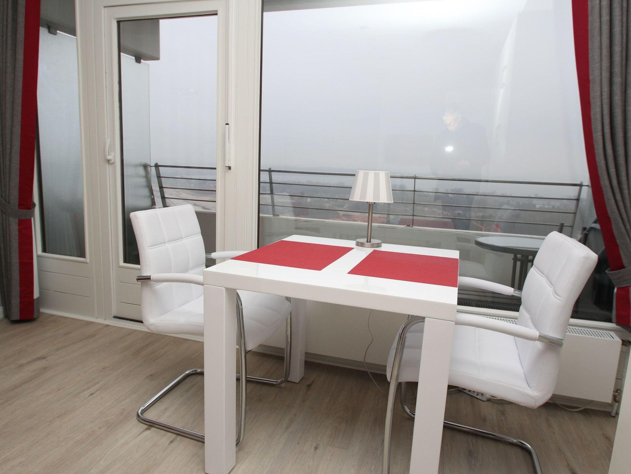 Dieses elegante Appartement mit hochwertiger Einrichtung entspricht allen Ansprüchen und lädt von Anfang an zum Wohlfühlen ein. Der helle Wohnraum besteht aus einer bequemen Couch mit Beistelltisch, einem schönen Essbereich am Fenster und einer exklusiven Nehl-Schrankwand mit zwei nebeneinander integrierten Einzelschrankbetten (je 90 cm x 200 cm). Des Weiteren gehören zu der geschmackvollen Einrichtung ein Sideboard sowie ein großer Eckschrank mit viel Stauraum. Die moderne Küche ist im Eingangsbereich integriert. Das Duschbad erreichen Sie vom Flur. Diese fantastische Wohnung bietet ideale Voraussetzungen für einen erholsamen Urlaub. Vom Balkon genießen Sie einen traumhaften Blick auf die Mecklenburger Bucht und auf die Trave mit ein- und ausfahrendem Schiffsverkehr.