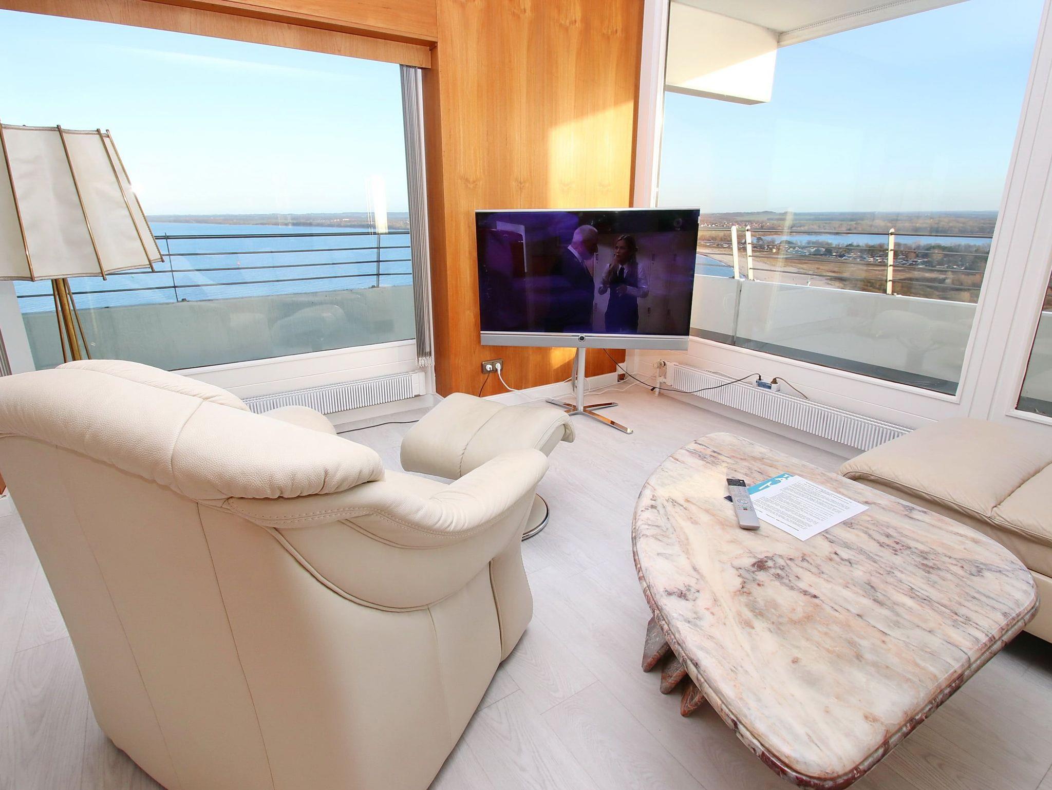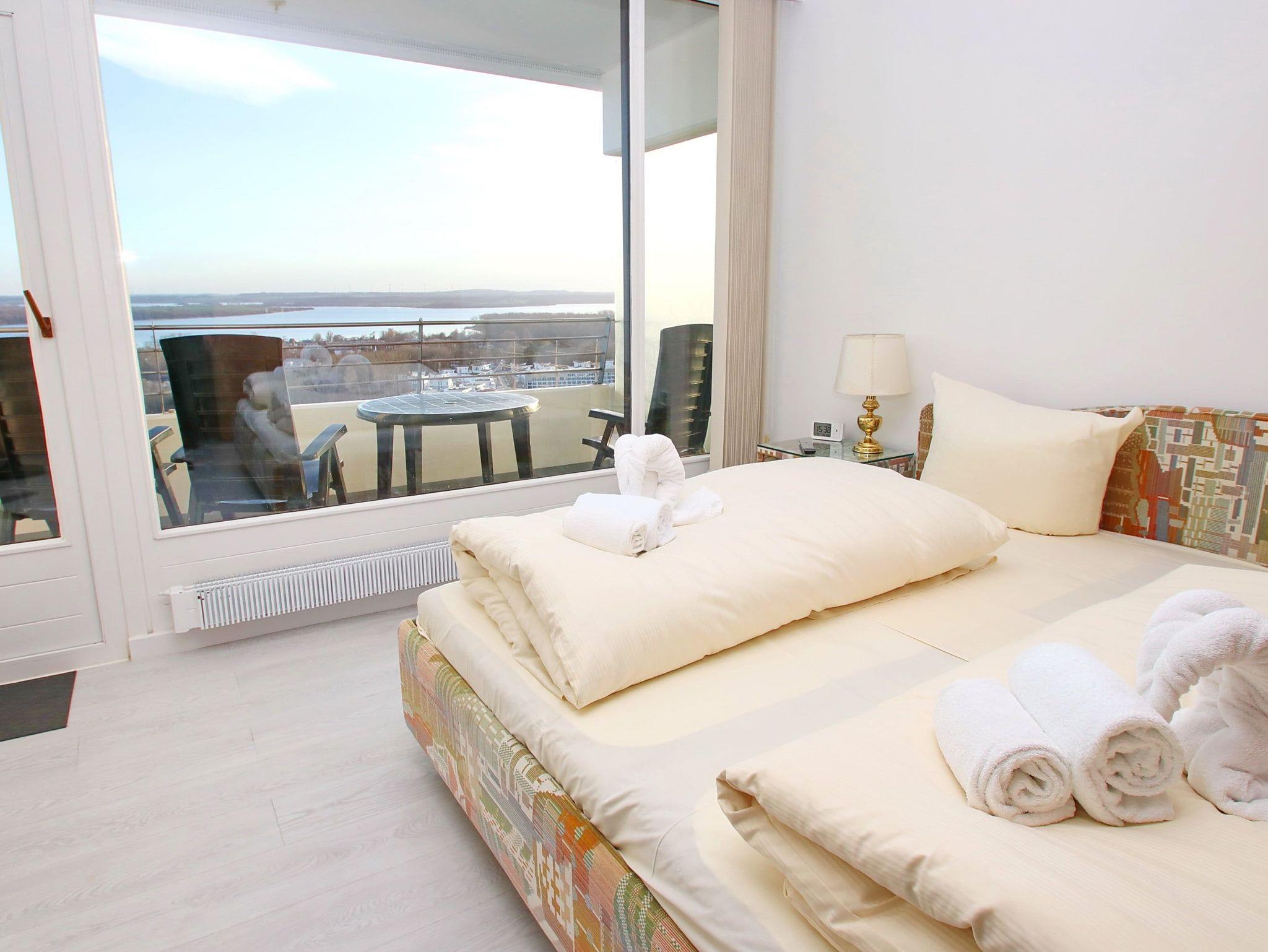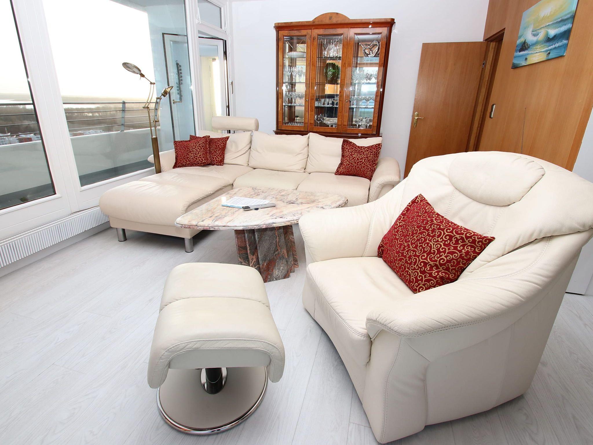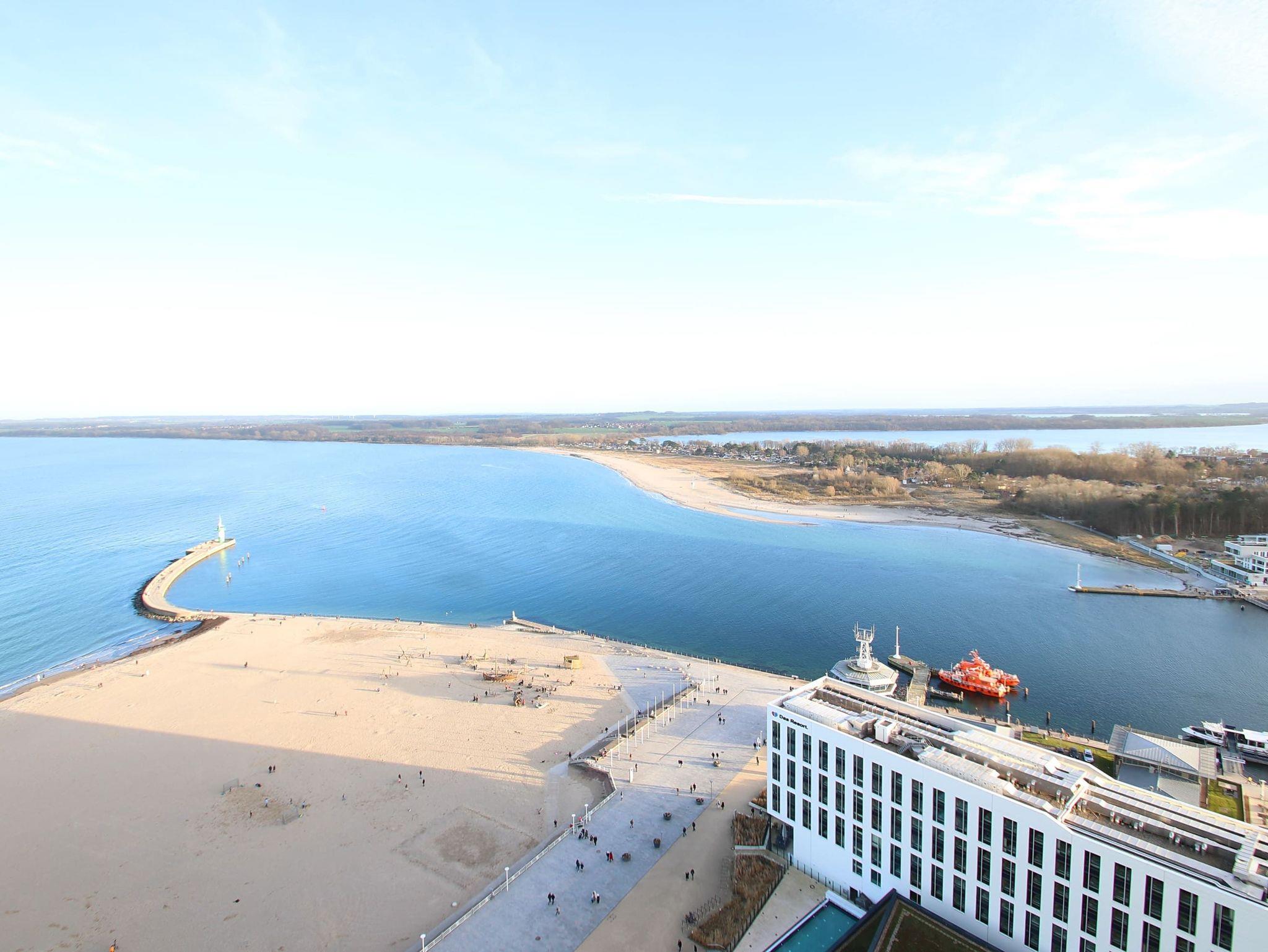 Highlight dieser komfortablen Ferienwohnung ist die traumhafte ost-süd-west ausgerichtete Lage mit Blick zum Strand und zur Ostsee sowie auf die Trave mit ein- und ausfahrendem Schiffsverkehr. Der großzügige Wohnraum besteht aus einer bequemen Rundcouch mit Tisch, einem Relaxsessel und Vitrinenschränken. Die Wohnung wurde 2025 komplett neu möbliert. Ein weiteres Highlight ist das moderne WLAN TV mit über 300 HD Sendern davon 70 Pay TV Sendern und Netflix HD. Des Weiteren finden Sie, neben der offenen Einbauküche (Durchreiche wurde 2021 entfernt), eine Essecke vor. Im hellen Schlafzimmer stehen ein Doppelbett (2x 100 cm x 200 cm) und ein großer Einbauschrank. Das weitere Schlafzimmer ist mit einem bequemen Doppelbett (2x 100 cm x 200 cm) und einem Kleiderschrank ausgestattet. Das Bad, welches vom Flur abgeht, ist 2021 modernisiert worden. Den überdimensionalen Eckbalkon zur Ostsee und zur Trave erreichen Sie von allen Wohnräumen, um den tollen Panoramablick zu genießen.