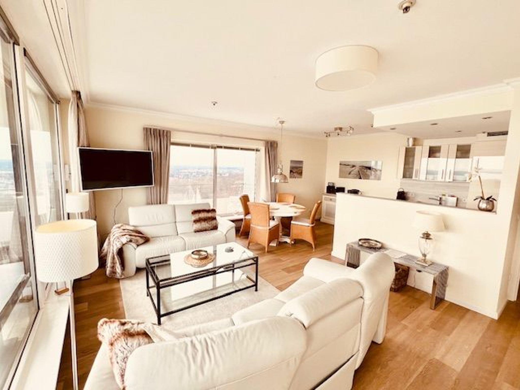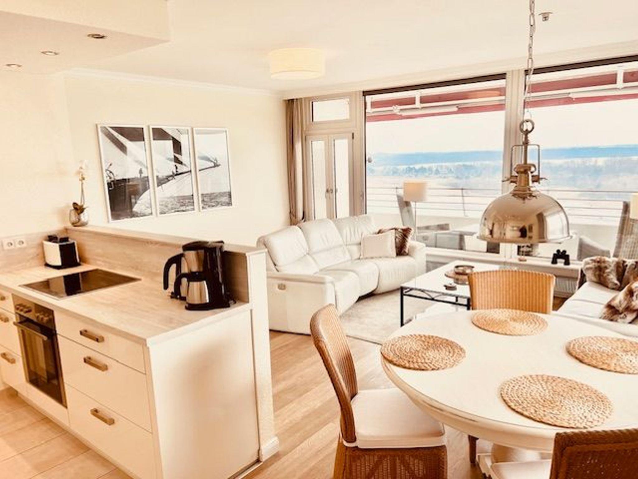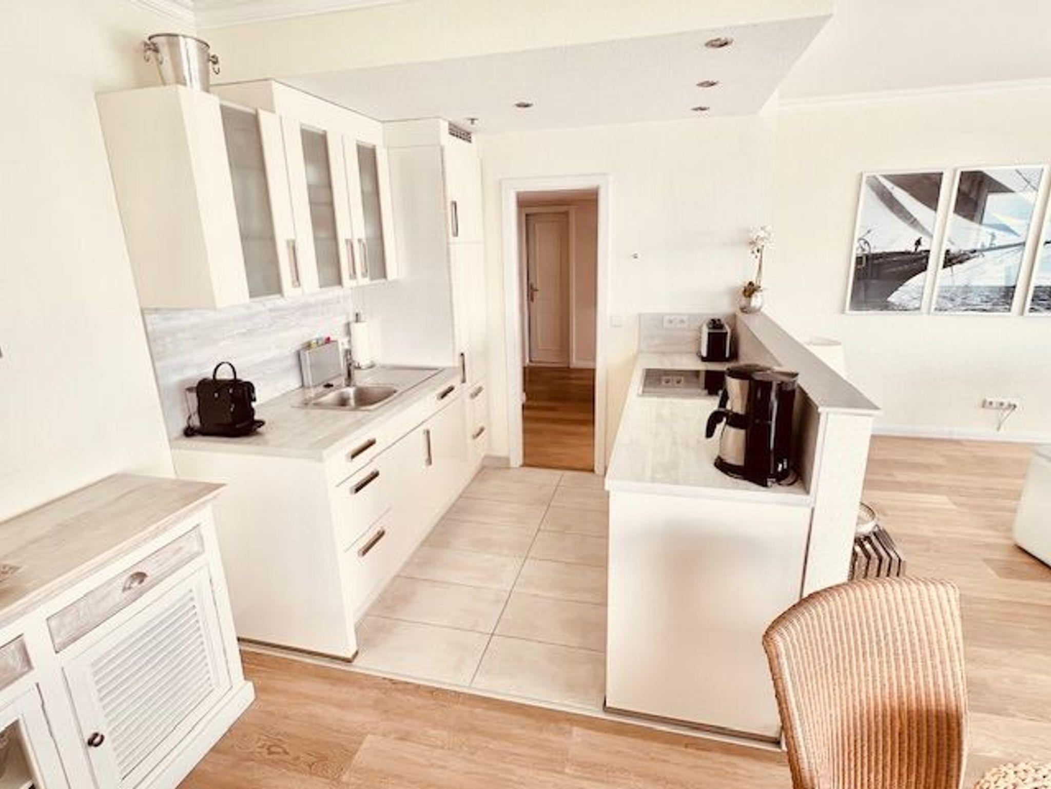 Dieses schöne Appartement in traumhafter Lage mit einer hochwertigen und stilvollen Inneneinrichtung ist einmalig. Hier verbringen Sie eine unvergessliche Zeit und können sich, fern vom stressigen Alltag, wunderbar entspannen. Der Wohnraum ist mit einer zweiteiligen Couchgarnitur, einem Couchtisch sowie einem Esstisch mit vier Stühlen ausgestattet. Gegenüber befindet sich die voll ausgestattete, offene Küche. Im Schlafzimmer befinden sich ein bequemes Boxspringbett (2x 100 cm x 200 cm) und eine großzügige Schrankwand mit spektakulärem Fotomotiv. Vom Flur abgehend gelangen Sie in das moderne Duschbad. Den sonnigen Balkon erreichen Sie vom Wohn- und Schlafzimmer. Hier genießen Sie den Ausblick zur Mecklenburger Bucht, zur Altstadt und zur Trave mit lebhaftem Schiffsverkehr.