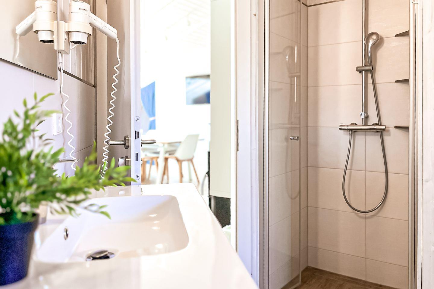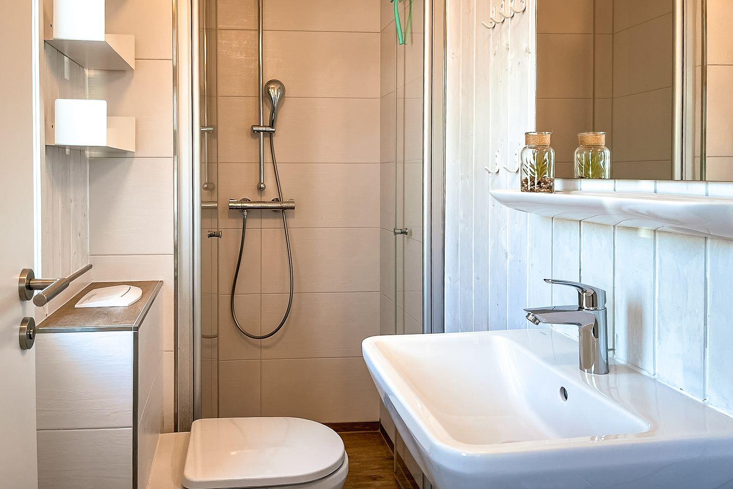 Zusätzlich gibt es ein top modernes Gäste-WC mit Dusche.