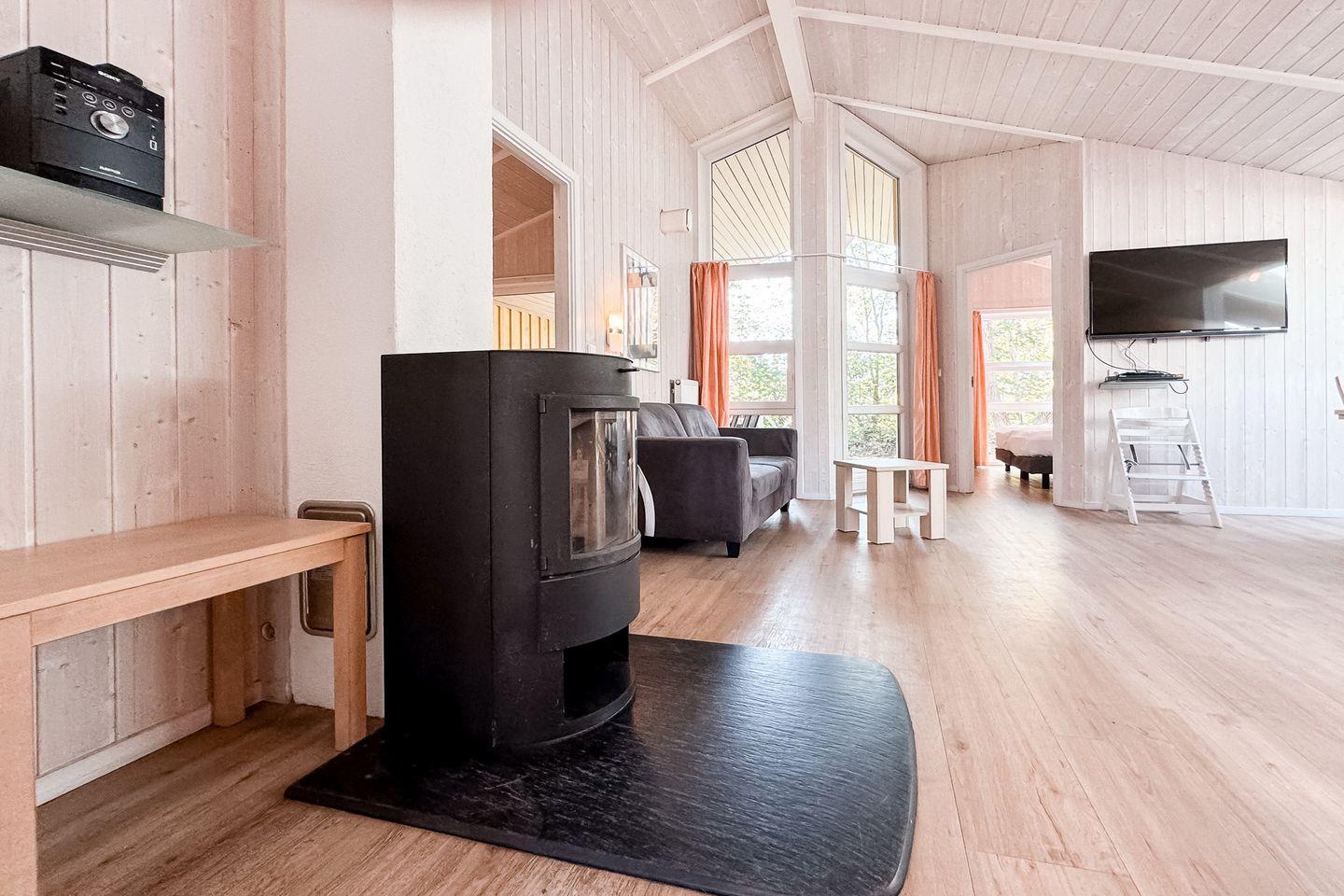 Der offene Wohn- und Essbereich ist der perfekte Ort, um zusammenzukommen. Ein modernes Sofa und ein einladender Essbereich schaffen eine gemütliche Atmosphäre. Der Kaminofen sorgt für wohlige Wärme, während der Flachbild-TV, das Radio mit CD-Spieler und der DVD-Player für Unterhaltung sorgen. Große Fenster mit Vorhängen garantieren eine angenehme Privatsphäre.