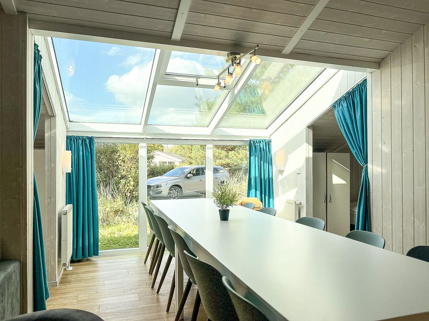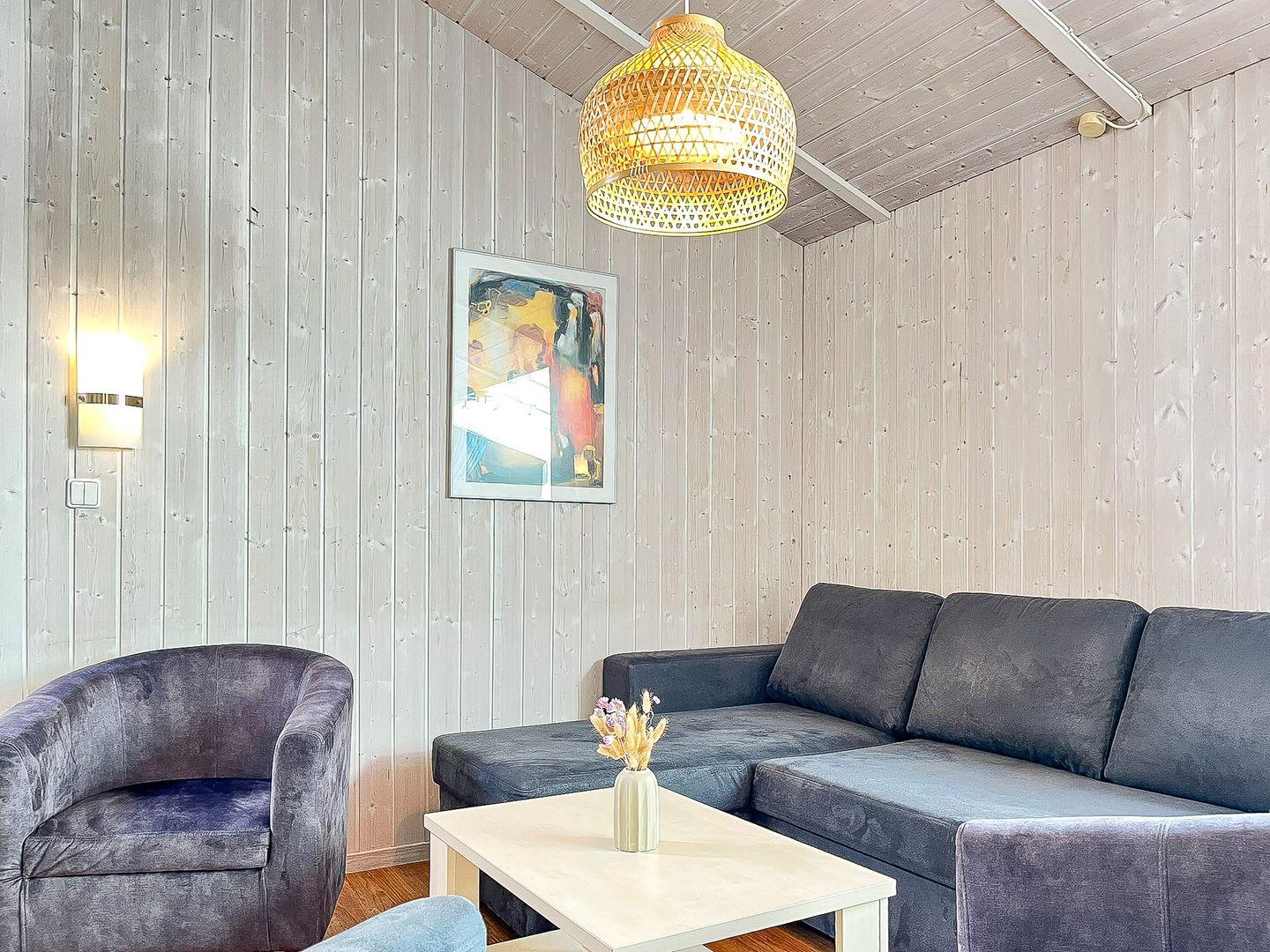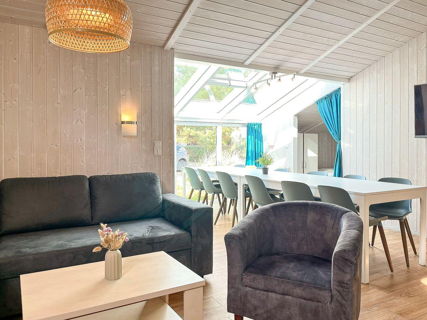 Zum Zusammenkommen laden der großzügige Essbereich und die offene Küche ein. Zwei Sofas schaffen eine gemütliche Atmosphäre. Der Kaminofen ermöglicht in der kälteren Jahreszeit besonders gemütliche Aufenthalte, während der Flachbild-TV, das Radio mit CD-Spieler und der DVD-Player für Unterhaltung sorgen. Große Fenster mit Vorhängen garantieren eine angenehme Privatsphäre.
