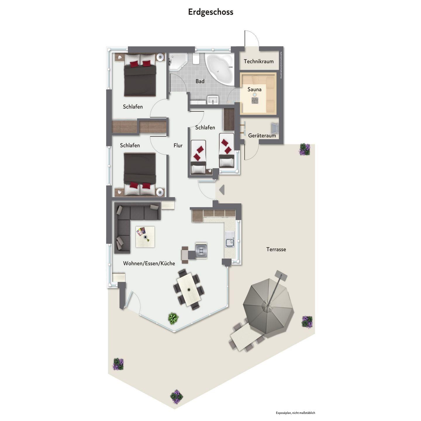 Die riesige Terrasse ist ein echtes Highlight! Ausgestattet mit Gartenmöbeln und einem Grill, ist sie der perfekte Ort für gesellige Grillabende und entspannte Sonnenstunden. Ob ein Buch auf der Terrasse lesen oder toben im Garten: Aktive und passive Erholung findest Du auf diesem fantastischen Grundstück.