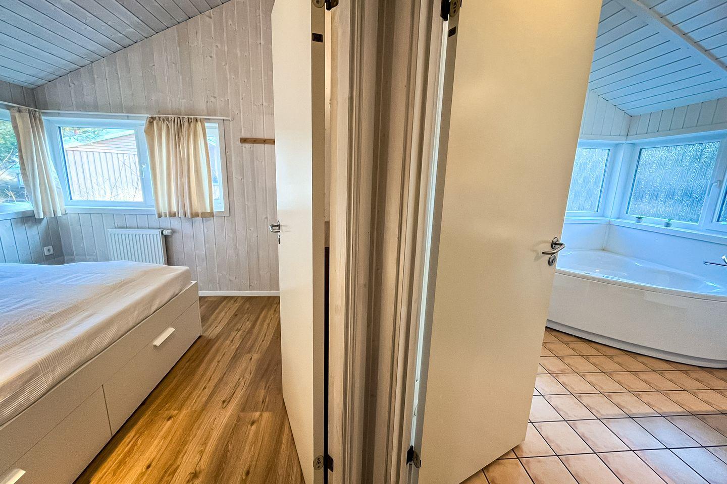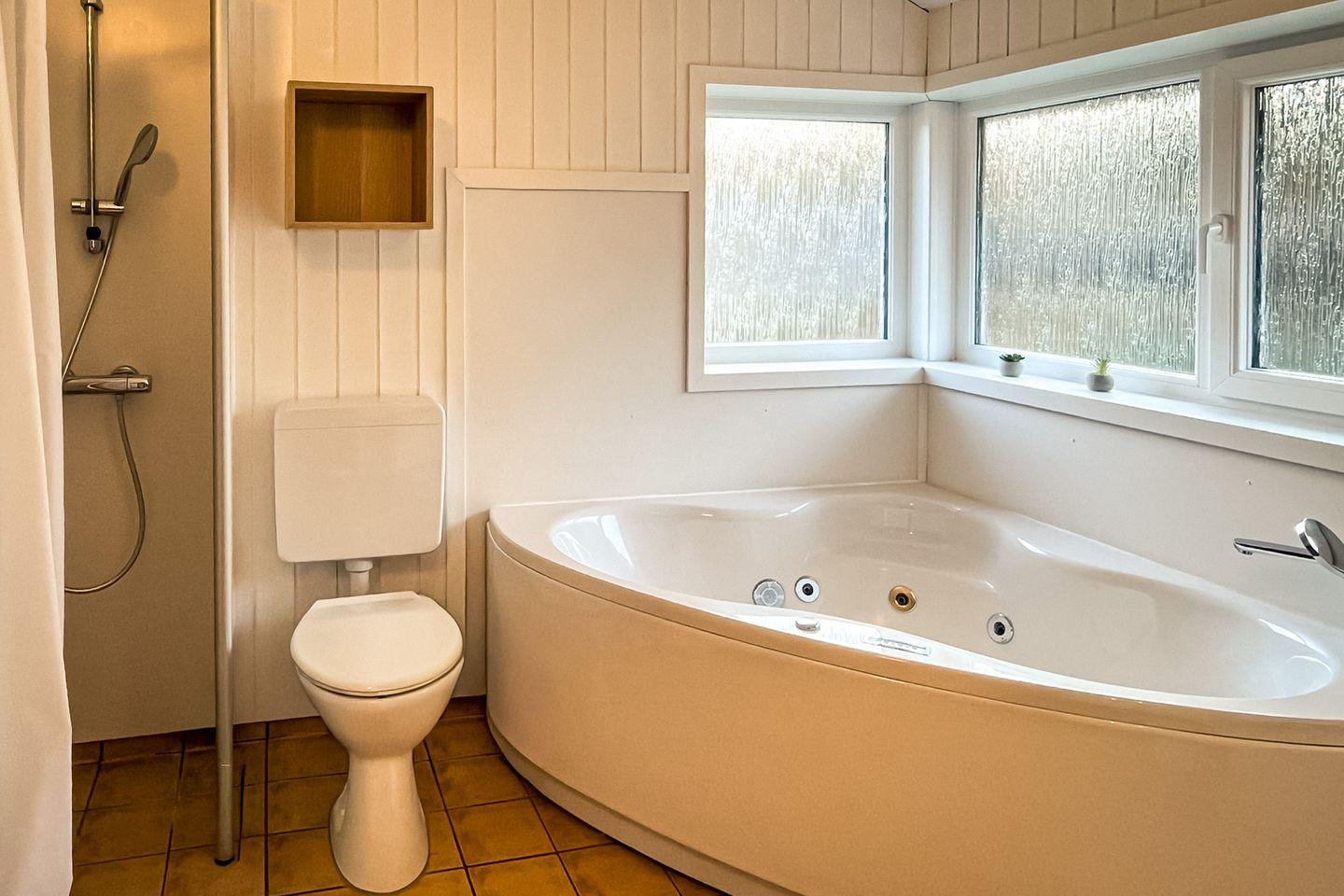 Das Badezimmer bietet eine Sauna, einen Whirlpool (für bis zu 2 Personen), eine bodengleiche Dusche, ein WC und ein Waschbecken.