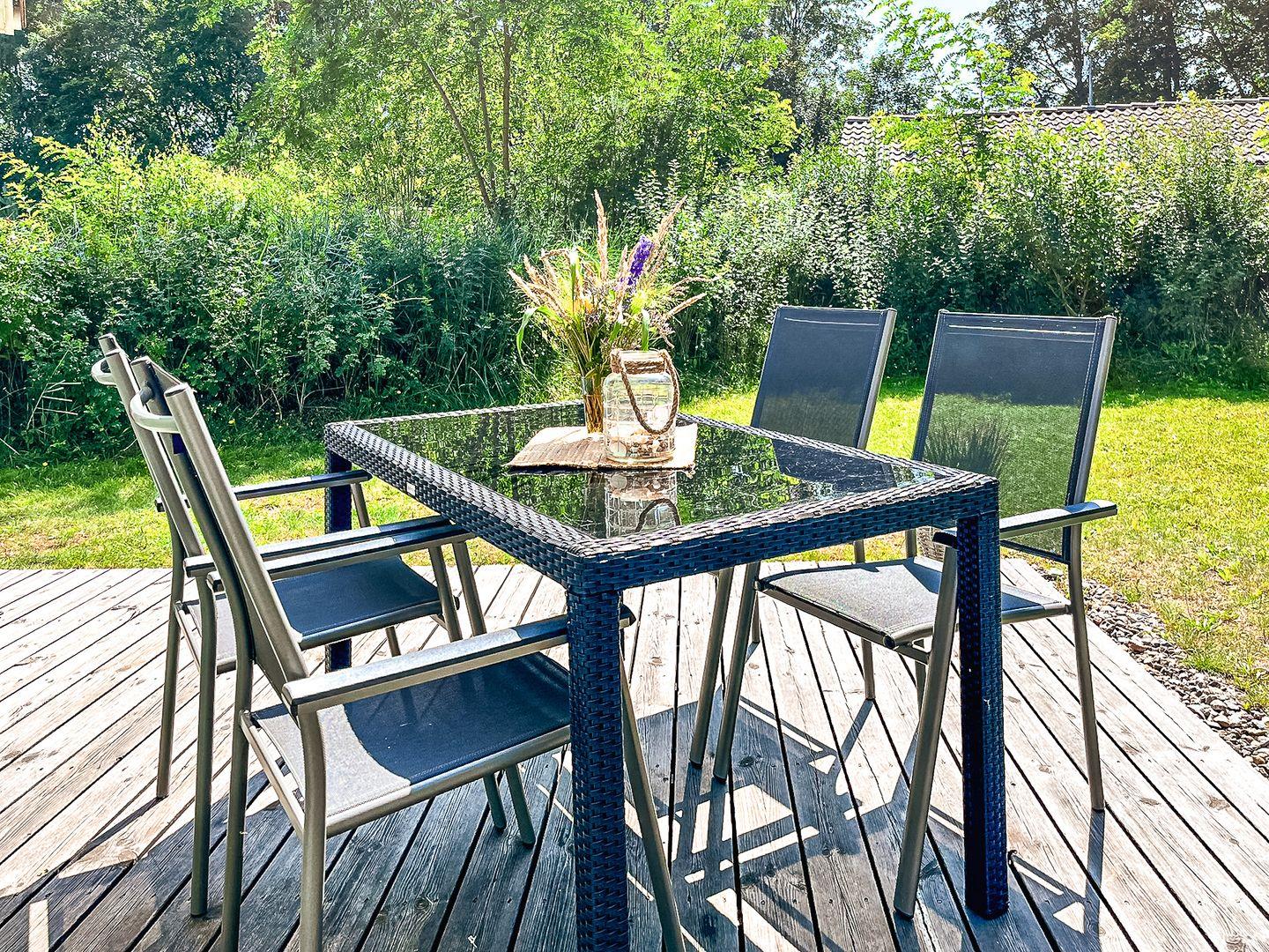 Die möblierte Terrasse mit Sonnenschirm ist Dein persönlicher Platz im Freien. Beginne hier entspannt Deinen Tag oder genieße am Abend ein gemeinsames Essen. Ein Holzkohlegrill lädt zu geselligen Grillabenden ein. Für zusätzlichen Komfort sorgt das Anfang 2025 frisch sanierte Badezimmer, das mit moderner Ausstattung überzeugt.