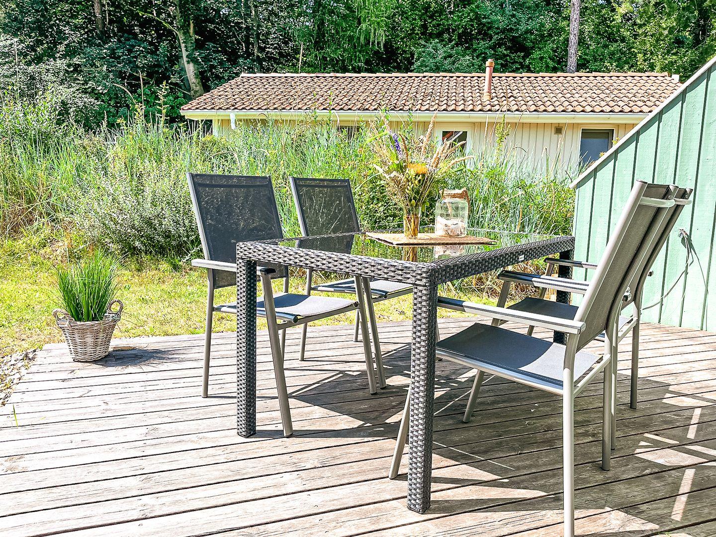 Freue Dich auf die sonnige Terrasse mit Gartenmöbeln sowie einen privaten Stellplatz direkt am Haus. Fahrräder kannst Du sicher auf dem dafür vorgesehenen Abstellplatz unterbringen.