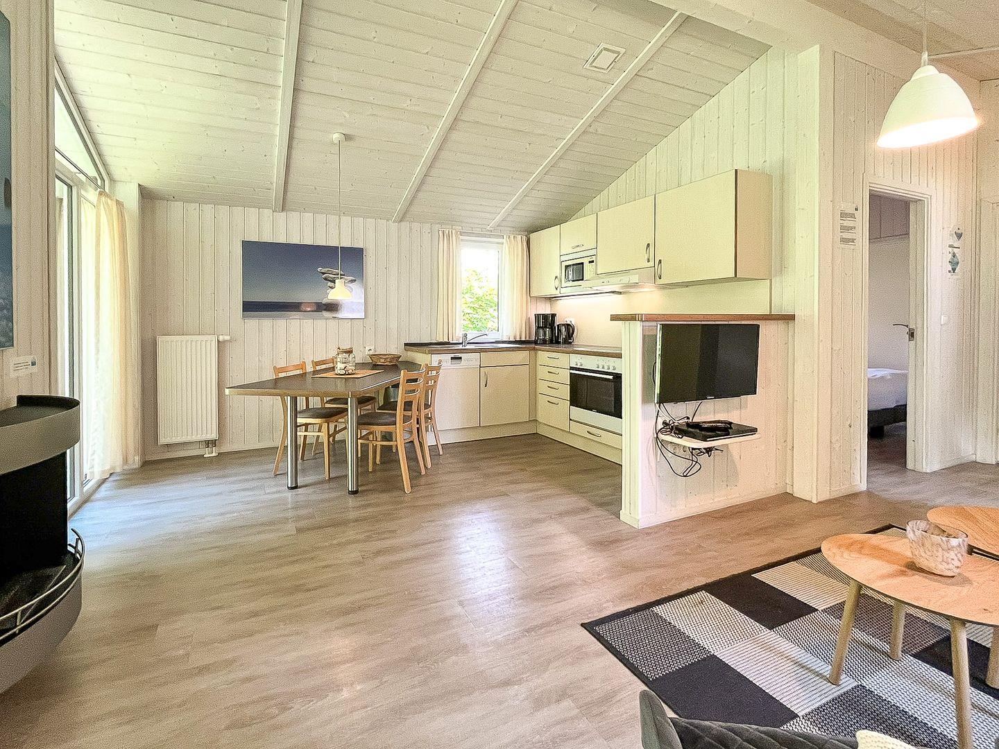 Der offene Wohn- und Essbereich ist freundlich und modern eingerichtet. Ein bequemes Sofa, ein Sessel sowie ein Flachbild-TV (Satellitenempfang), DVD-Player, CD-Player und Radio sorgen für Unterhaltung. Große Fenster lassen viel Licht herein und schaffen eine einladende Atmosphäre.