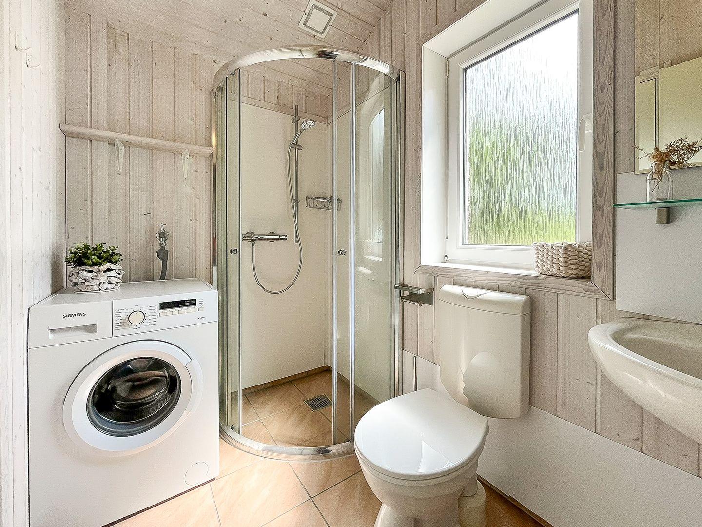 Das Badezimmer ist modern und verfügt über eine bodengleiche Dusche, ein Waschbecken und ein WC. Die Waschmaschine steht Dir zur Eigennutzung zur Verfügung. Ein Haartrockner ist ebenfalls vorhanden.