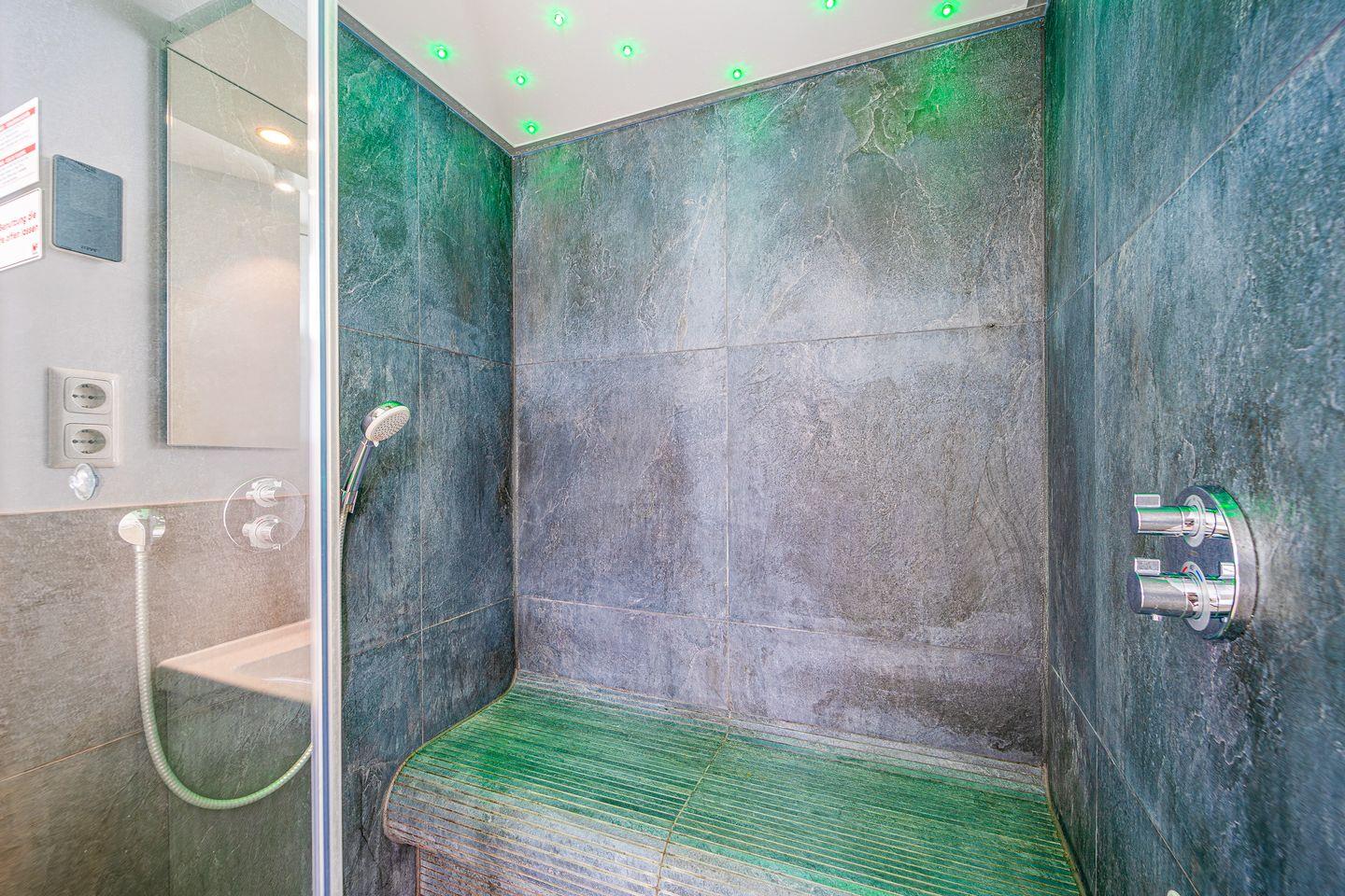 Ein besonderes Highlight ist das Badezimmer, das als private Wellnessoase ausgestattet ist: moderne Badewanne mit wohltuender Whirlpool-Funktion und ein Dampfbad mit integrierter Doppelregendusche, ergänzt durch eine Sauna sorgen für pure Erholung.