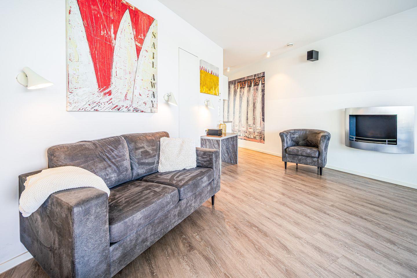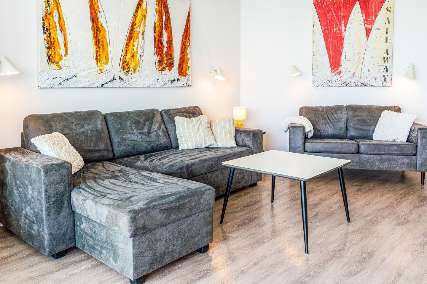 Der Wohnbereich ist hochwertig eingerichtet mit Sofa, Sesseln, HiFi-Anlage, Blu-ray-Player und zwei Flachbild-TVs. Für behagliche Stunden sorgt der Bioethanolkamin, der den Raum in warmes Licht taucht. Dank der großen Panoramafenster genießt Du von hier aus den außergewöhnlich schönem Meerblick.