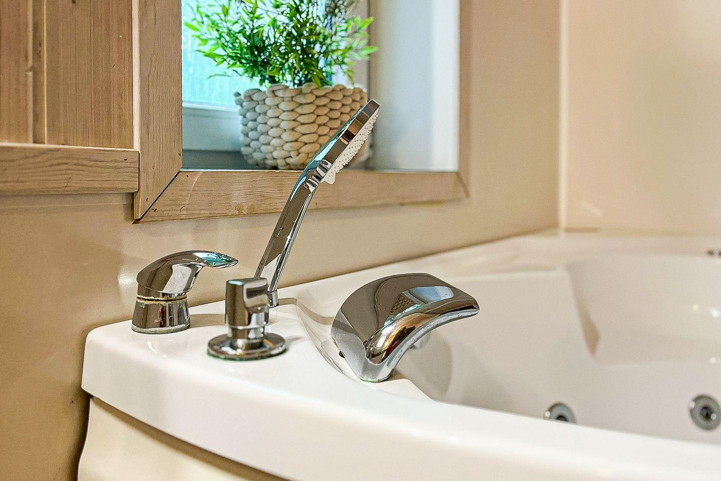 Das Badezimmer bietet eine Sauna, einen Whirlpool (für bis zu 2 Personen), eine bodengleiche Dusche, ein WC und ein Waschbecken.