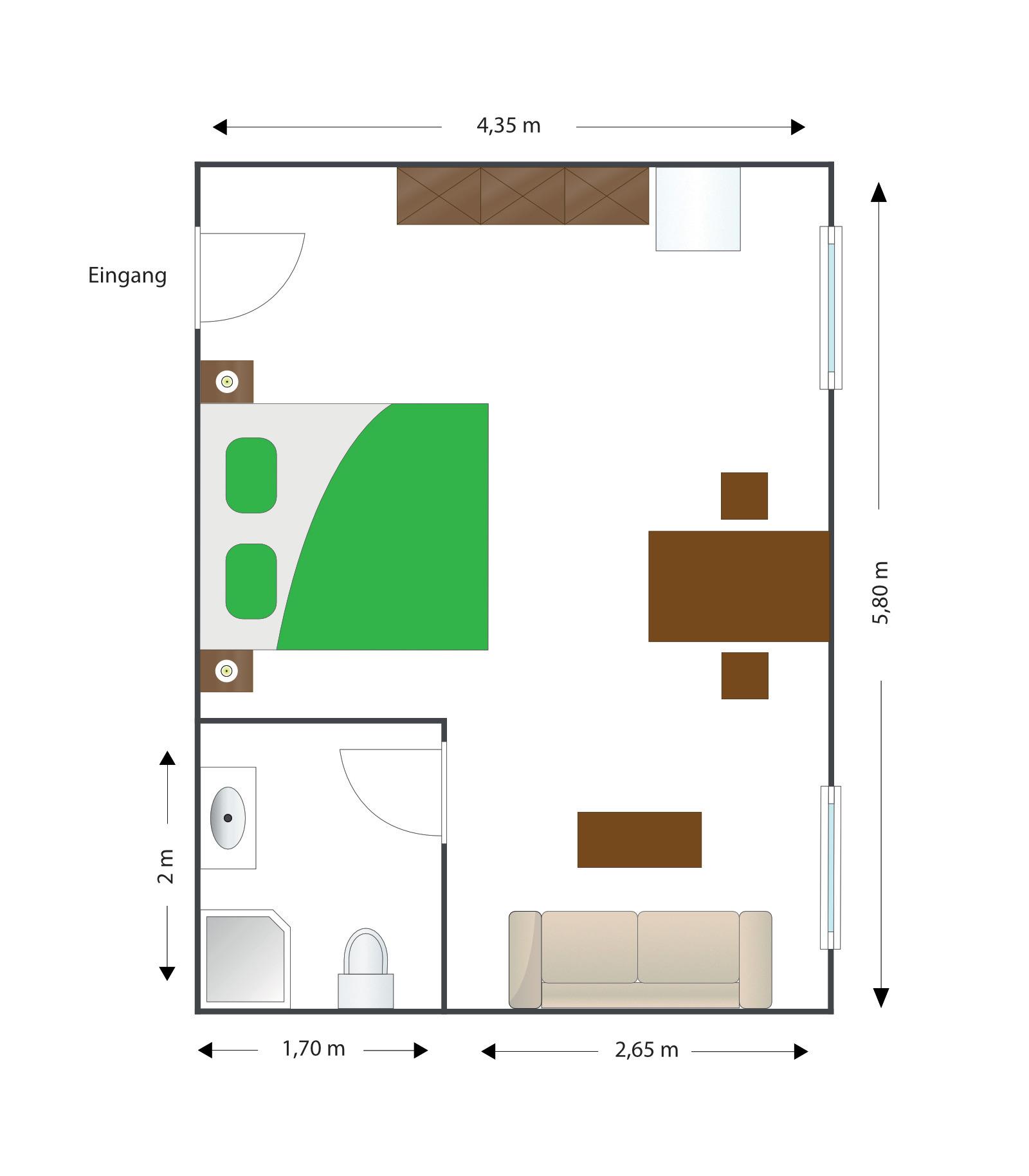 - Wohn-/Schlafzimmer, 21 m², 2 Personen