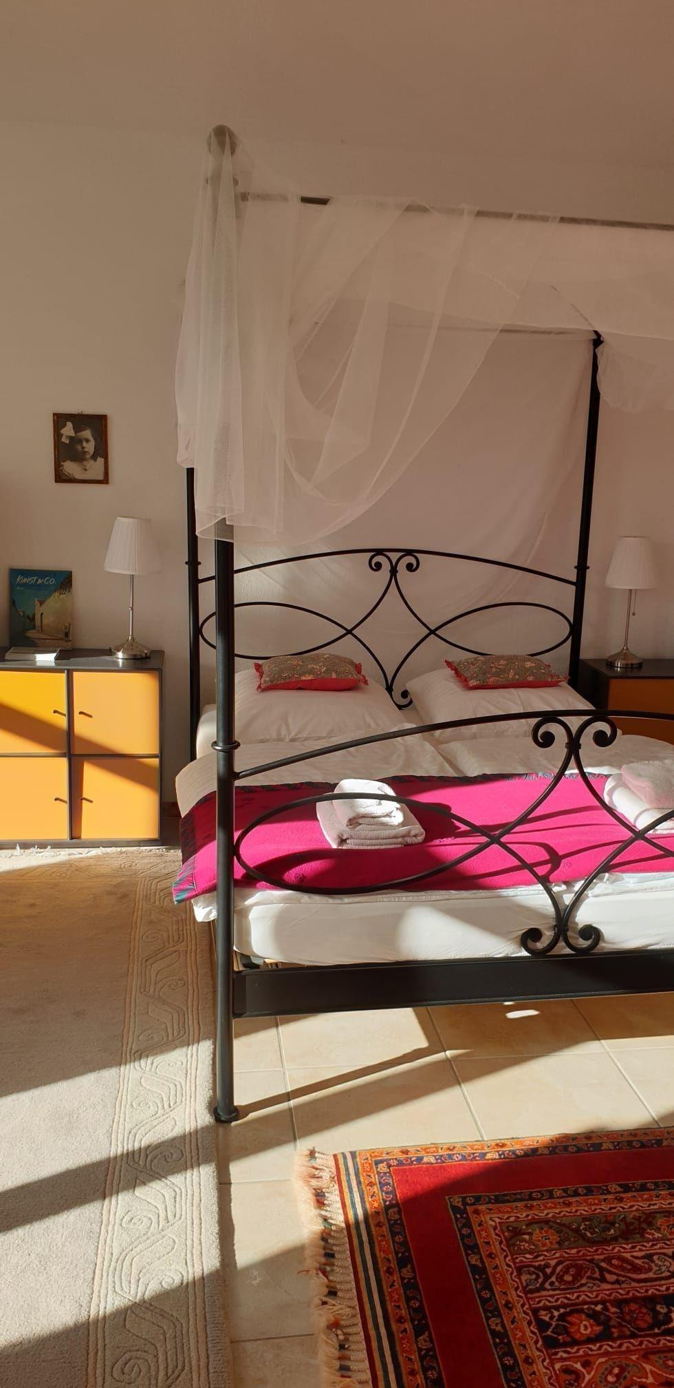 Wohnschlafraum, Doppelbett 2,00 m x 1,80 m mit 2 verschiedene harten Matratzen und verstellbaren Lattenrosten