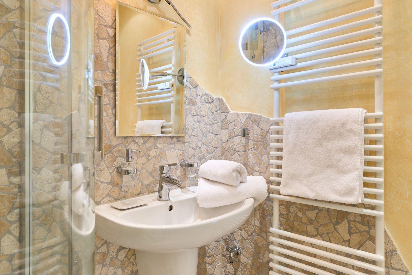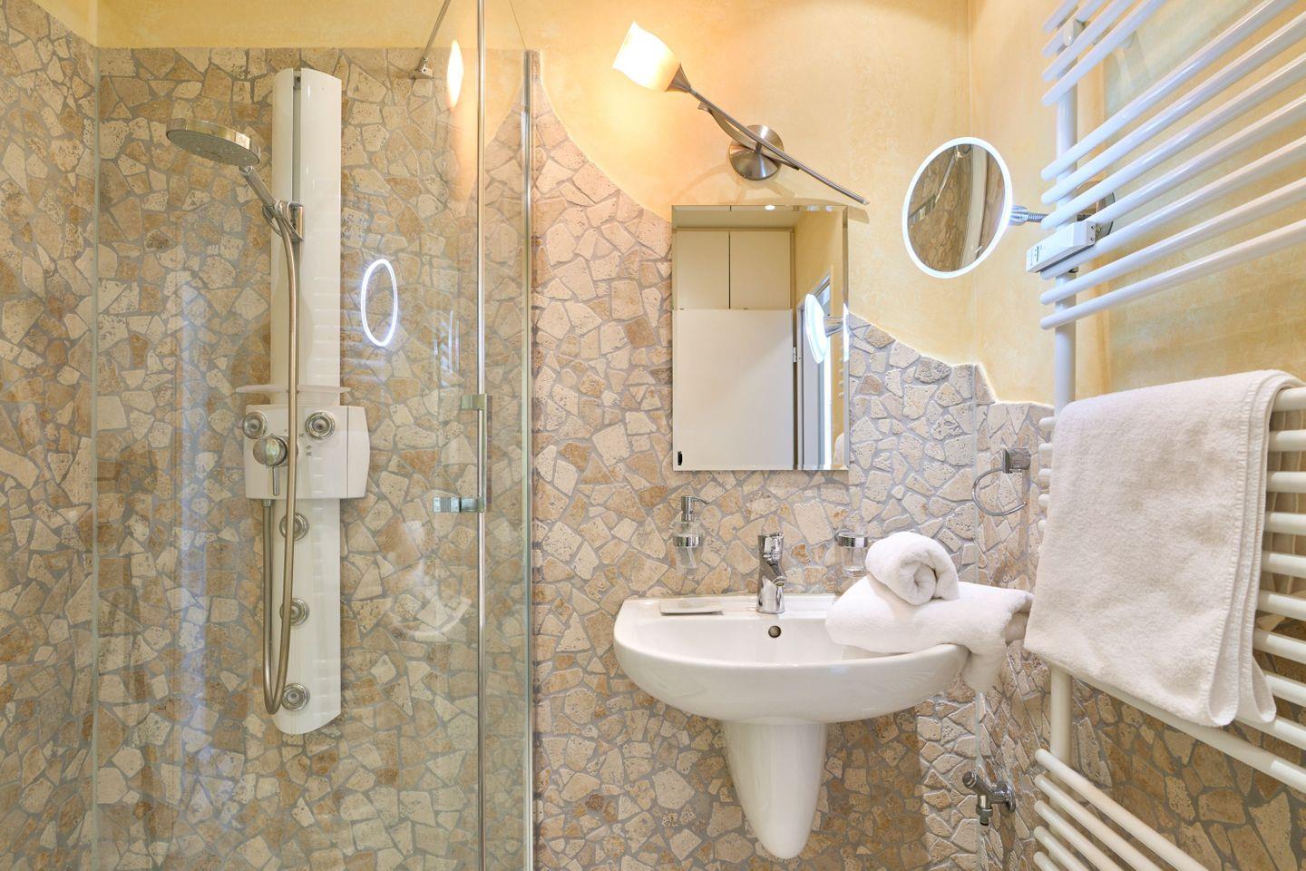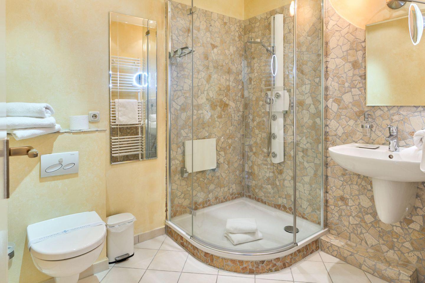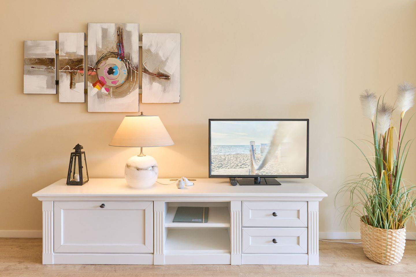 Das geräumige Badezimmer ist mit einer fast ebenerdigen Wellnessdusche für entspanntes Relaxen nach einem sonnigen Urlaubstag an der Ostsee genau das Richtige. Dort befindet sich auch ein zusätzlicher Einbauschrank mit viel Stauraum, so dass alle mitgebrachten Dinge ihren Platz finden.