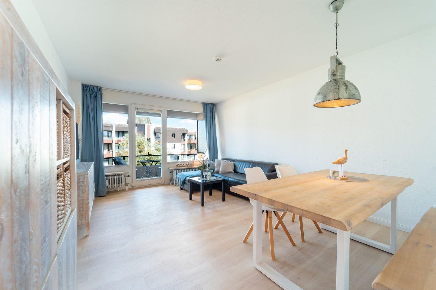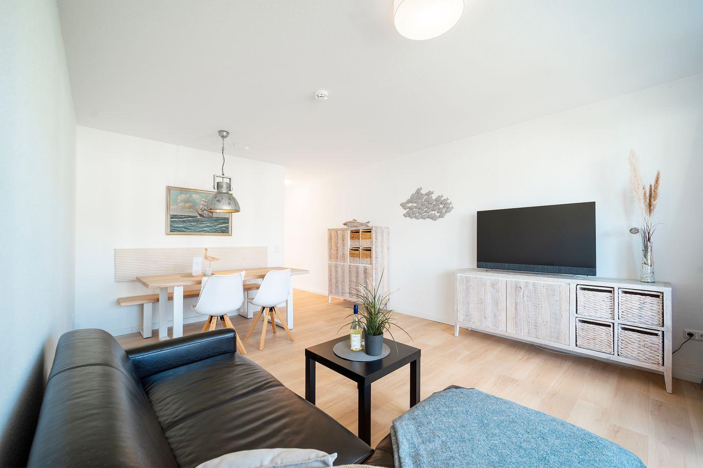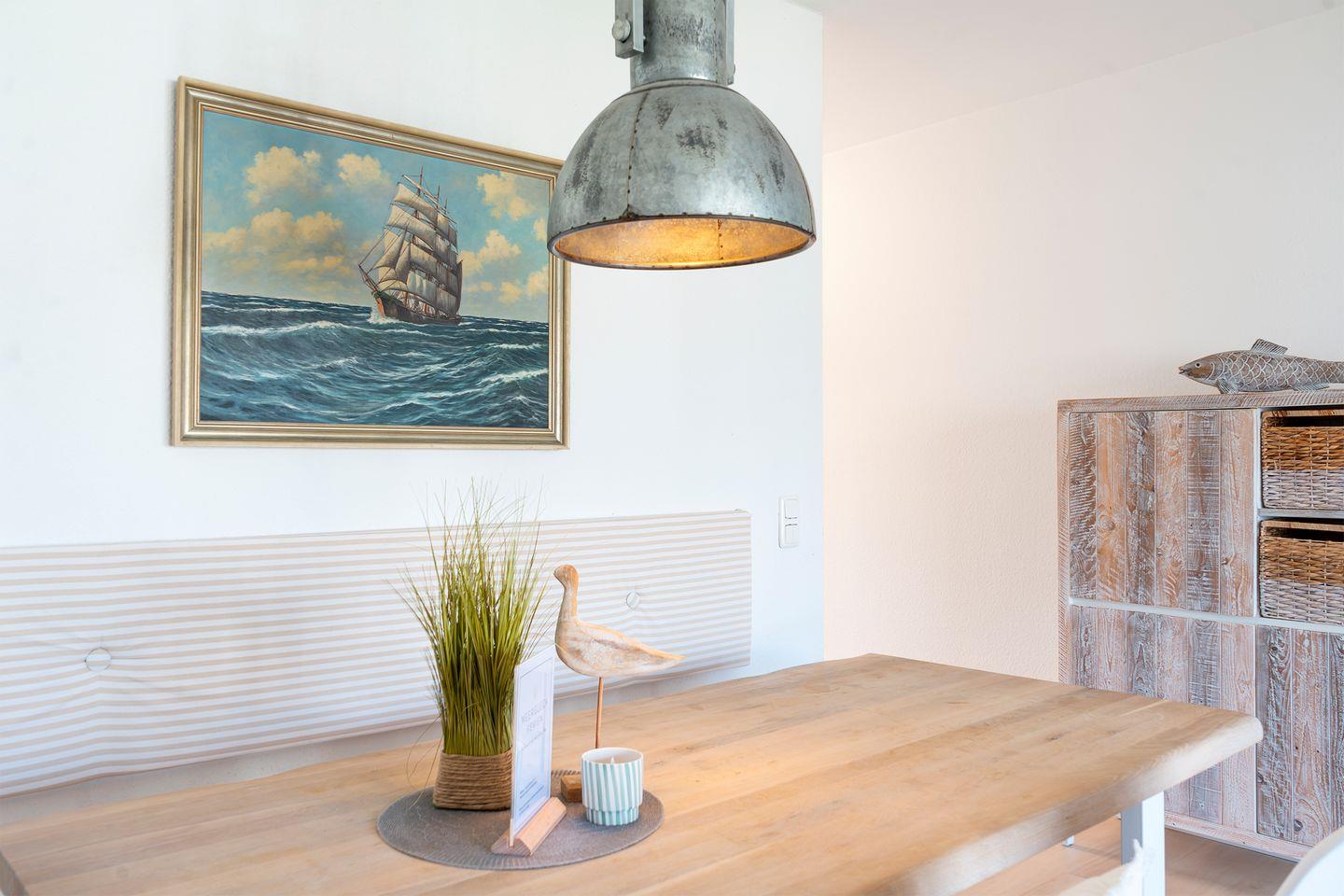 Die helle Wohnung liegt im 2. Obergeschoss eines gepflegten Hauses und empfängt Sie mit einer freundlichen, modernen Einrichtung im maritimen Stil. Der offene Wohn- und Essbereich mit gemütlichem Sofa und einladendem Esstisch schafft eine wohnliche Atmosphäre – ideal für gemeinsame Stunden mit Familie oder Freunden. Die gut ausgestattete Küche bietet alles, was Sie für die Zubereitung Ihrer Lieblingsgerichte brauchen.
