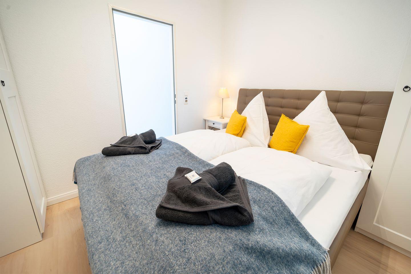 Erholsamen Schlaf finden Sie im komfortablen Doppelbett. Das Schlafzimmer ist ein gemütlich abgetrennter Raum, der direkt an Flur und Wohnzimmer anschließt – es gibt keine Tür.