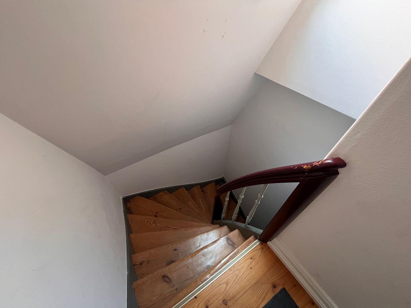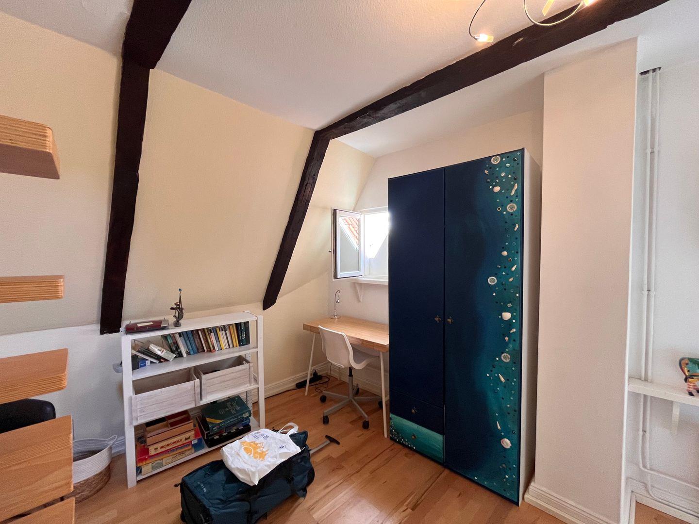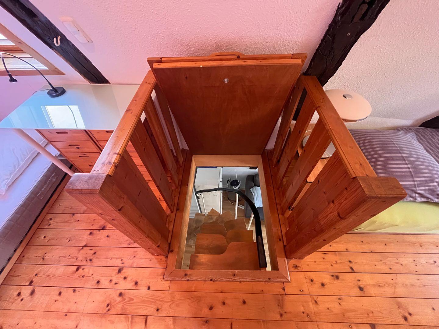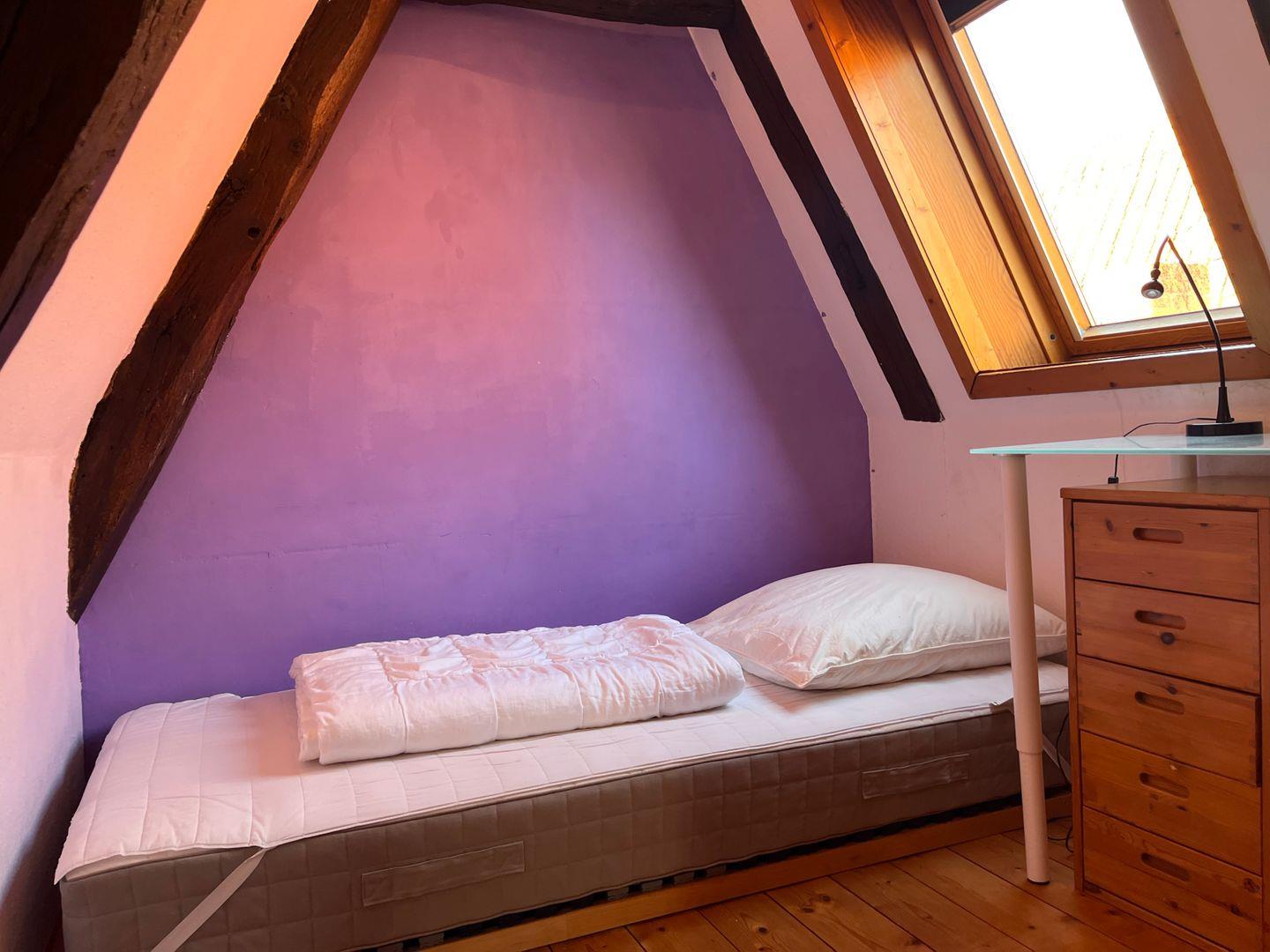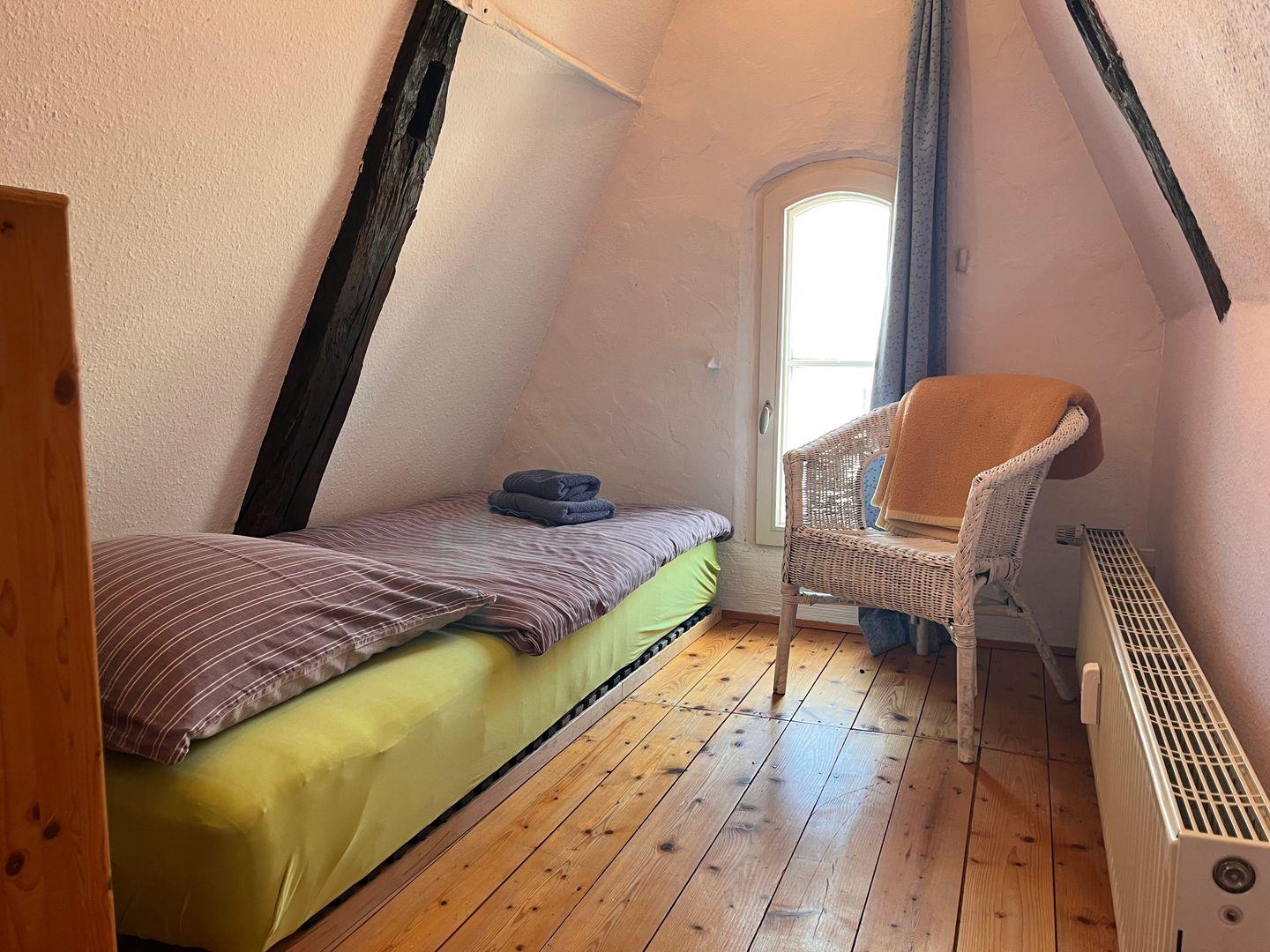 Die beiden separaten Schlafzimmer sind ruhig gelegen. Das Schlafzimmer im Spitzboden ist über eine steile Treppe erreichbar und hat zwei Einzelbetten. Das andere Schlafzimmer hat eine Doppelbett. Für Kleinkinder und Babys ist dies nicht geeignet! Auch für Menschen mit einer Gehbehinderung ist die Wohnung nicht gut zu erreichen, da der Treppenaufgang auch sehr steil ist!