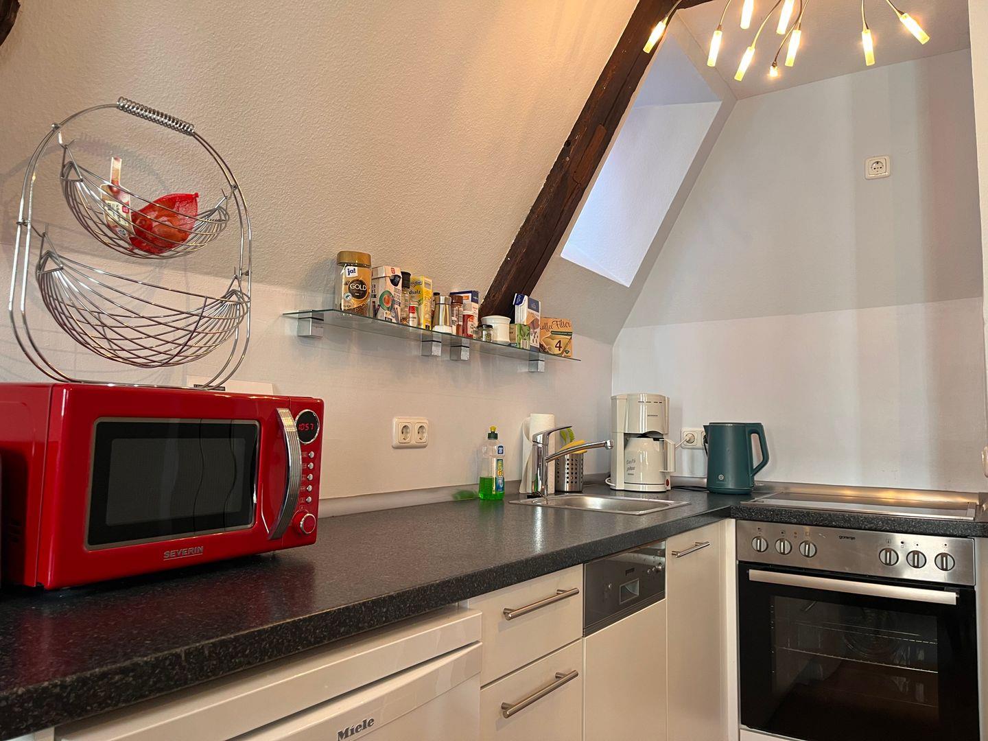 Die offene Küche ist direkt in den Wohnbereich integriert und überzeugt mit einer komfortablen Ausstattung: Mikrowelle, Ceranherd, Backofen (elektrisch), Kühlschrank, Spülmaschine, Kaffeemaschine, Wasserkocher, Toaster sowie notwendige Küchenutensilien, Geschirr und Besteck stehen bereit.