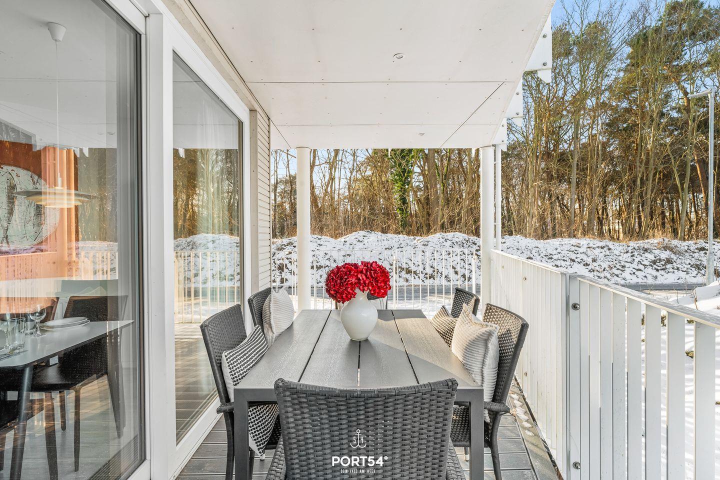 Der große Balkon ist mit Balkonmöbeln ausgestattet und lädt zum Entspannen an der frischen Seeluft ein – zum Frühstück im Freien oder zum Tagesausklang. Ein kostenloser Stellplatz in einem überdachten Parkhaus ist direkt in der Nähe verfügbar. Das gesamte Objekt ist mit Sichtschutz an allen Fenstern ausgestattet und als Nichtraucherwohnung ausgewiesen.