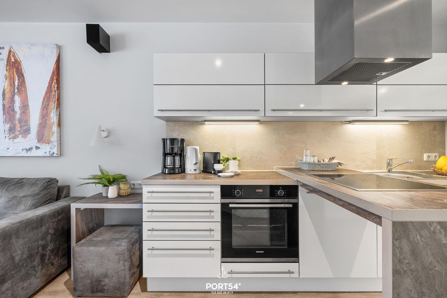 Die Küche ist modern und offen gestaltet und bietet alles, was du für die Selbstversorgung brauchst: Induktionskochfeld, Backofen, Mikrowelle, Geschirrspüler, Kühlschrank mit Gefrierfach, Nespresso-Espressomaschine, Kaffeemaschine, Wasserkocher, Toaster sowie sämtliches Koch- und Essgeschirr.