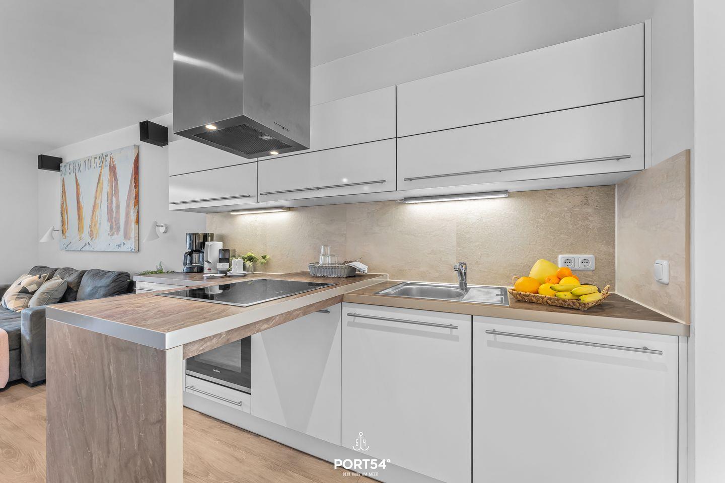 Die offene Küche ist komplett ausgestattet: Ceranherd, Backofen, Mikrowelle, Geschirrspüler, Kühlschrank mit Gefrierfach, Nespresso-Maschine, Kaffeemaschine, Wasserkocher, Toaster sowie sämtliches Koch- und Essgeschirr – perfekt für Snacks oder umfangreiche Mahlzeiten.