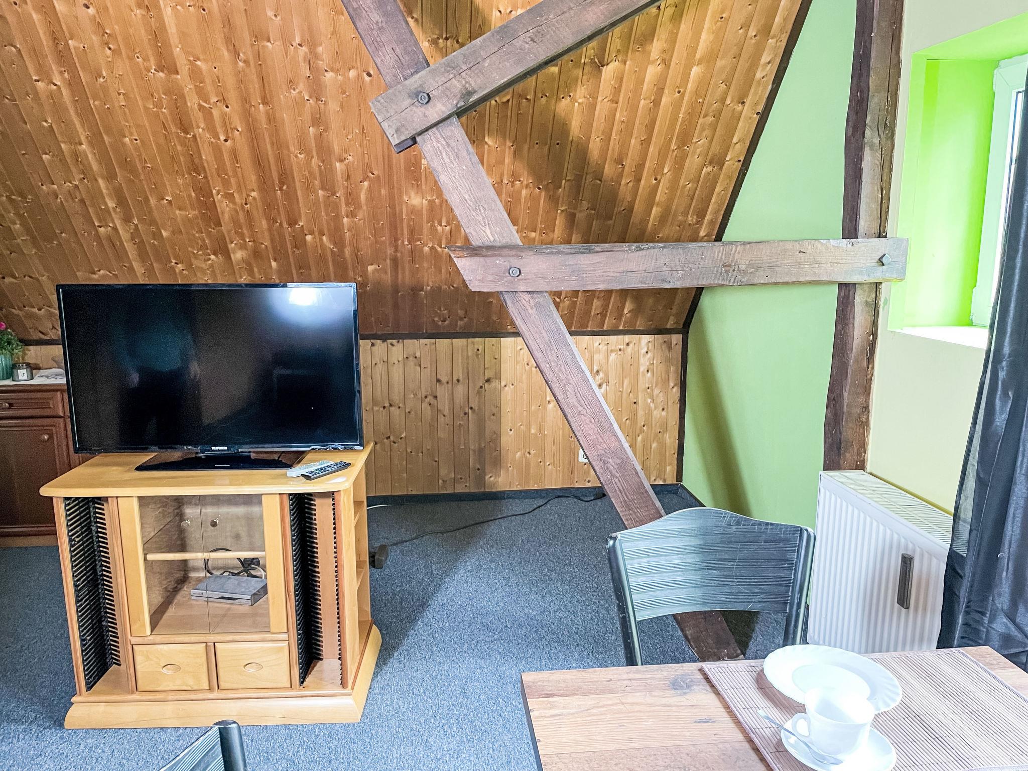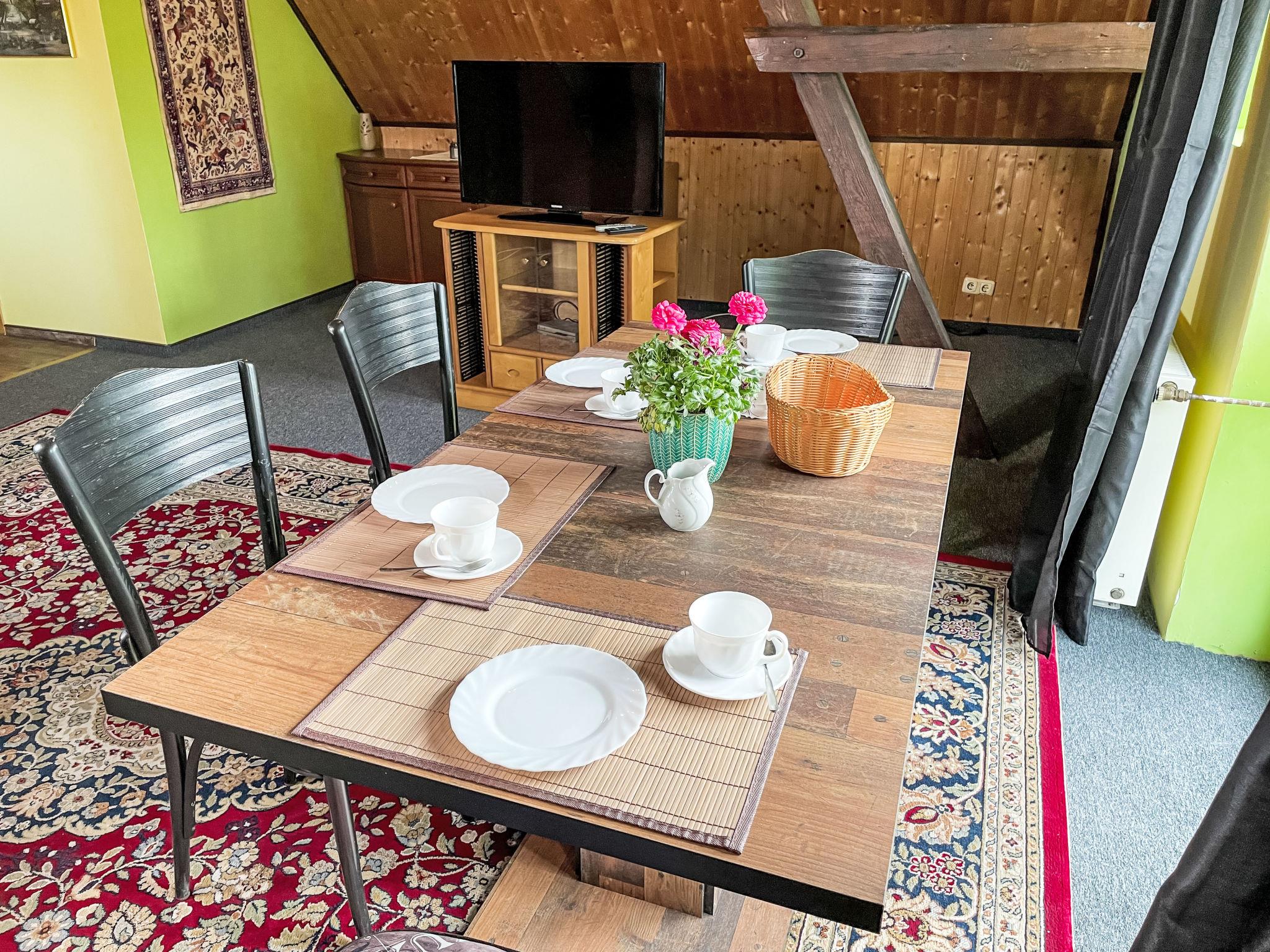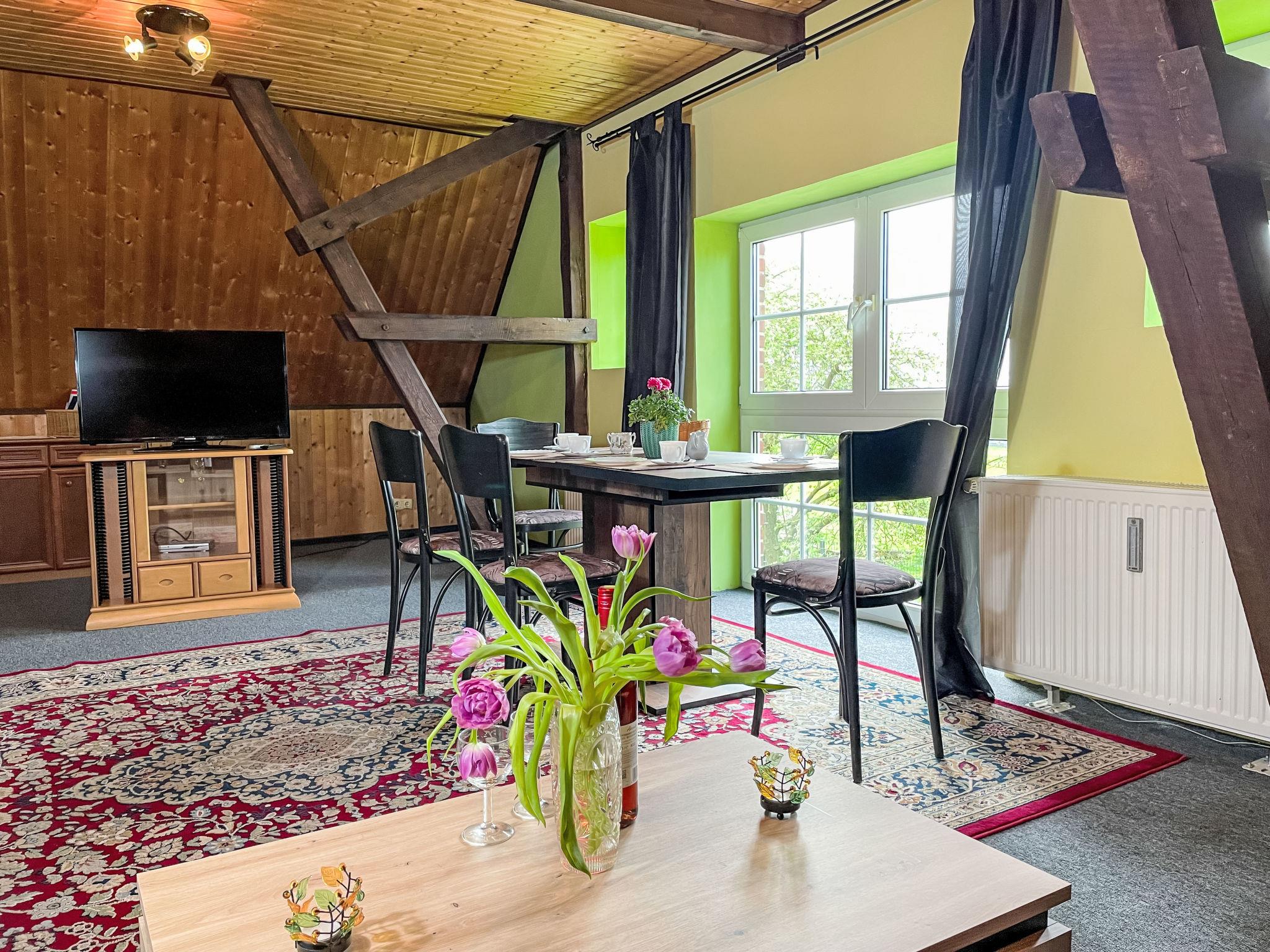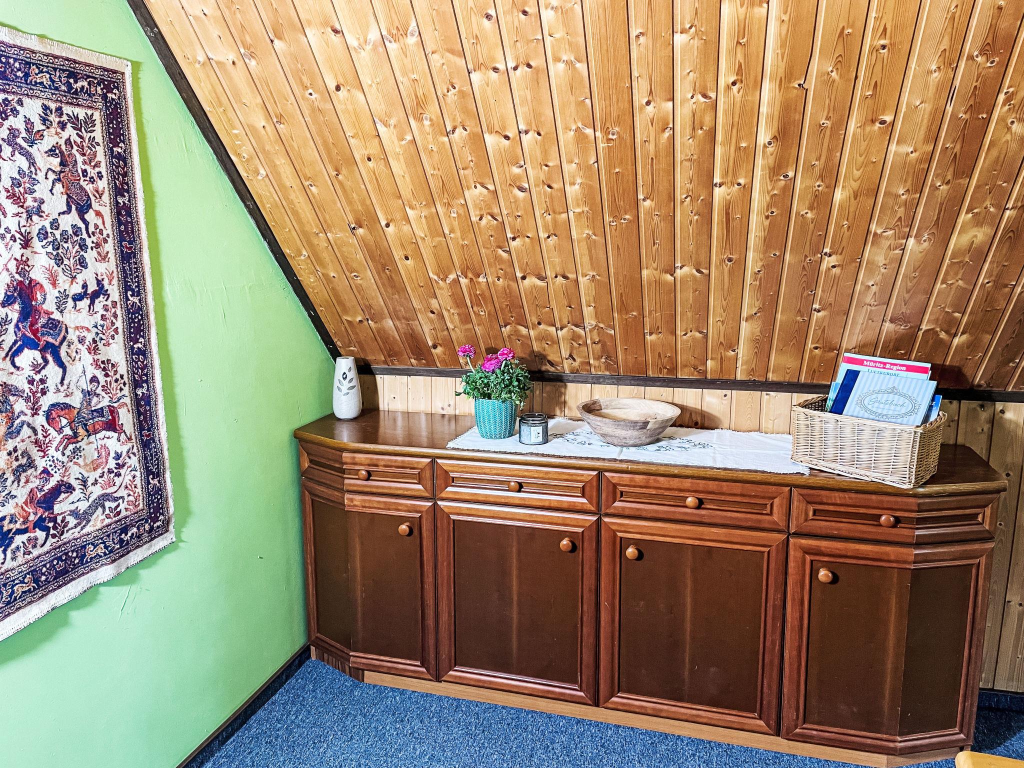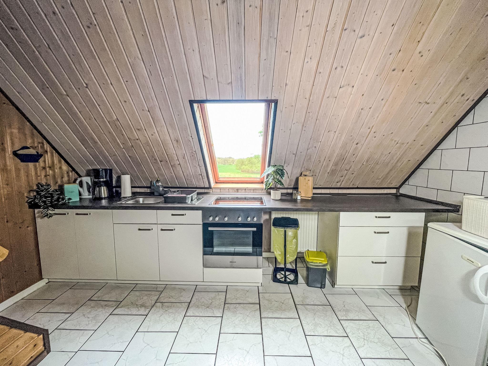 2-room apartment 60 m2, on the top floor. Spacious and bright, with sloping ceilings, renovated in 2022, cosy and wooden furniture furnishings: open living/dining room with sloping ceilings with panoramic window with 1 sleeping facility (145 cm, length 200 cm), dining table, satellite TV and flat screen. Open kitchen (oven, 4 ceramic glass hob hotplates, toaster, kettle, electric coffee machine). Bath/shower/WC. Upper floor: (steep stair), 1 double bedroom 12 m2, with sloping ceilings with 2 beds (90 cm, length 200 cm). Beautiful view of the countryside. Facilities: children's high chair, baby cot for up to 3 year olds. Internet (WiFi, free). Please note: suitable for families. Non-smokers only. Maximum 1 pet/ dog allowed. Private entrance, smoke alarm. Attention steep internal staircase!
