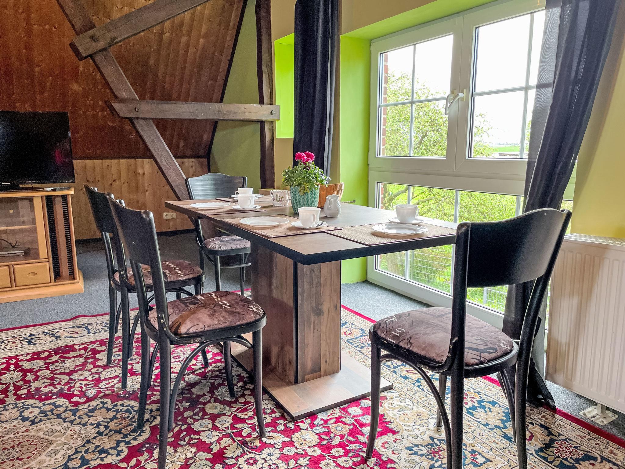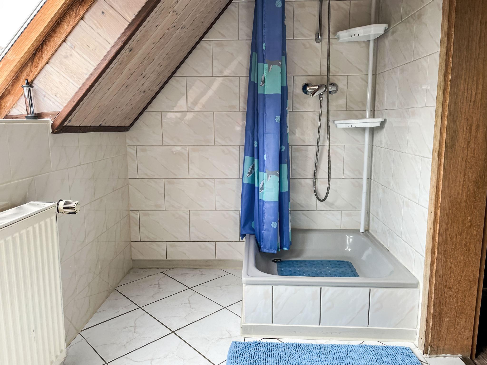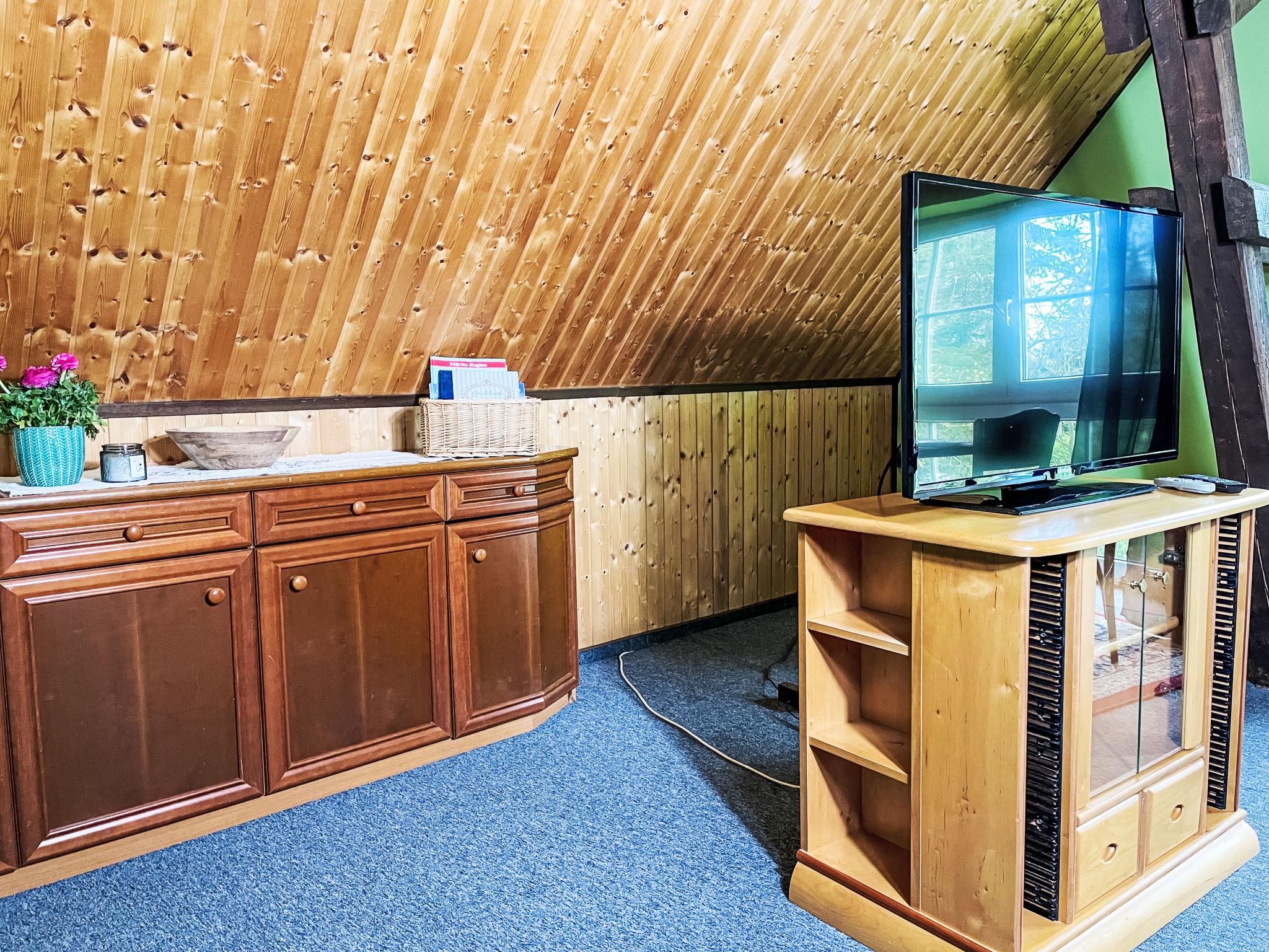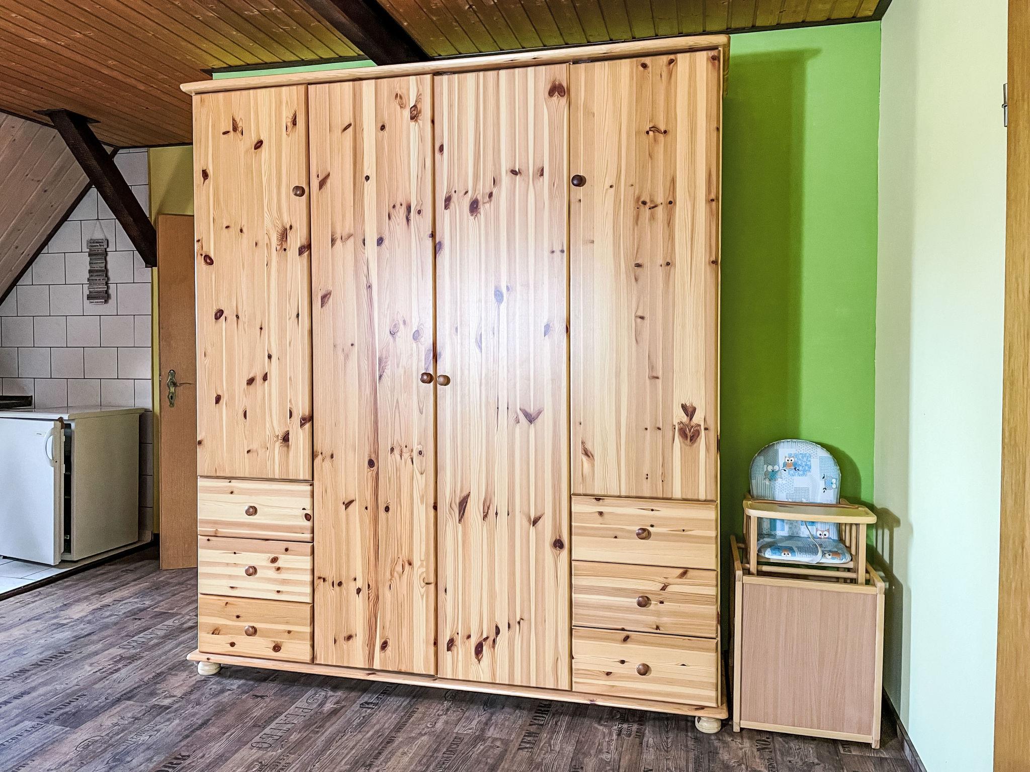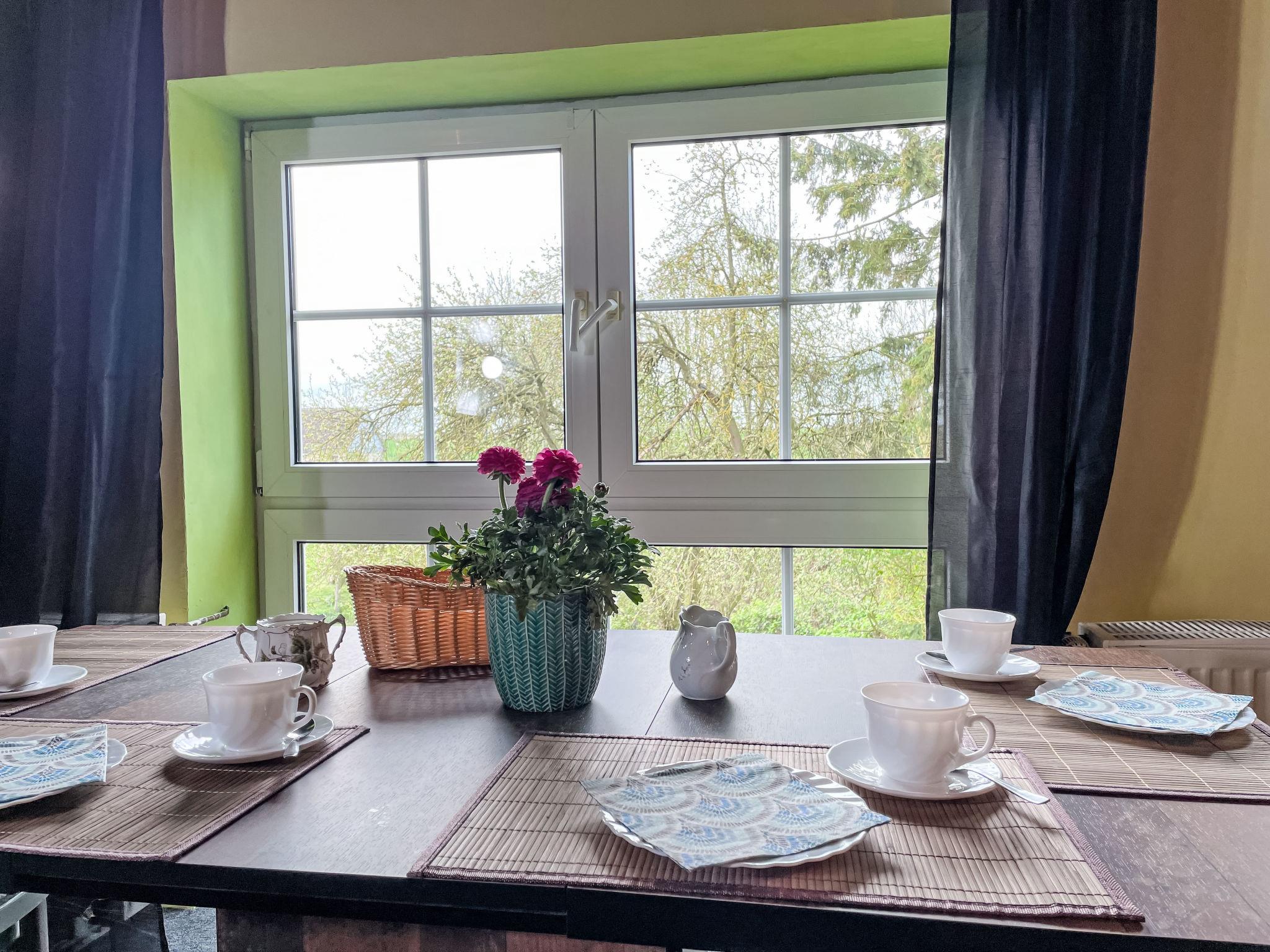 2-room apartment 60 m2, on the top floor. Spacious and bright, with sloping ceilings, renovated in 2022, cosy and wooden furniture furnishings: open living/dining room with sloping ceilings with panoramic window with 1 sleeping facility (145 cm, length 200 cm), dining table, satellite TV and flat screen. Open kitchen (oven, 4 ceramic glass hob hotplates, toaster, kettle, electric coffee machine). Bath/shower/WC. Upper floor: (steep stair), 1 double bedroom 12 m2, with sloping ceilings with 2 beds (90 cm, length 200 cm). Beautiful view of the countryside. Facilities: children's high chair, baby cot for up to 3 year olds. Internet (WiFi, free). Please note: suitable for families. Non-smokers only. Maximum 1 pet/ dog allowed. Private entrance, smoke alarm. Attention steep internal staircase!