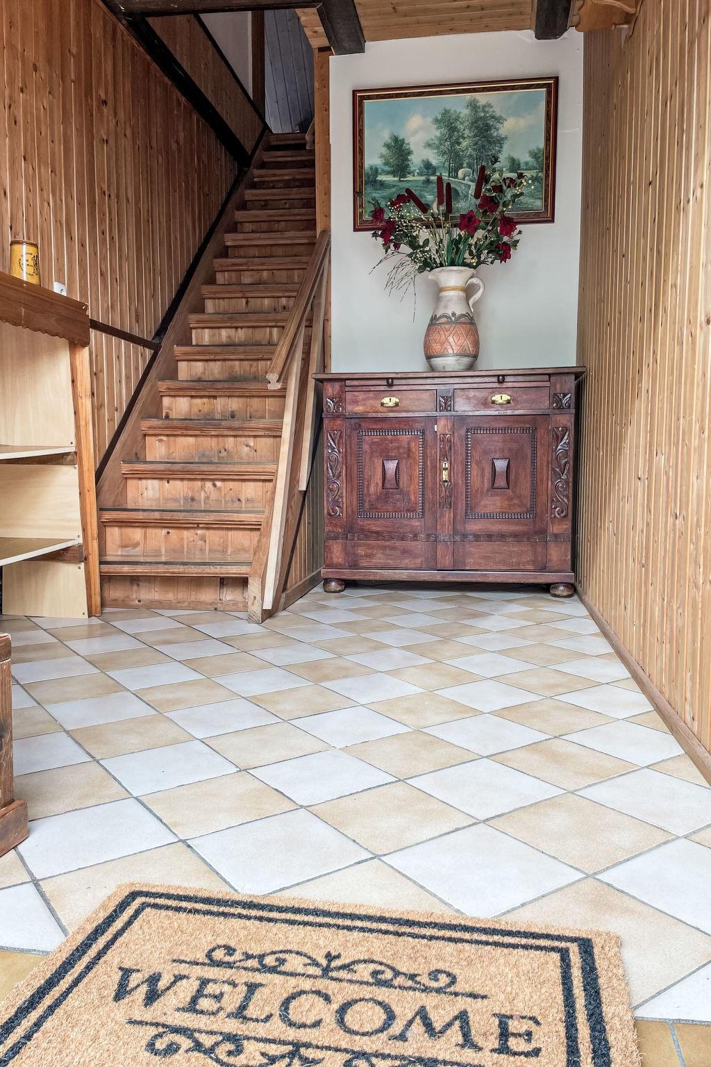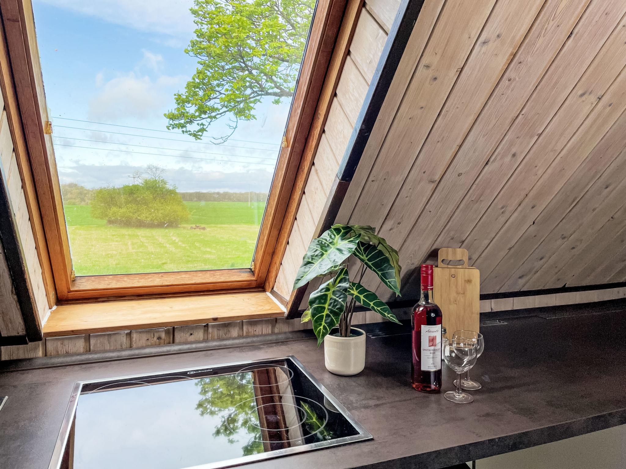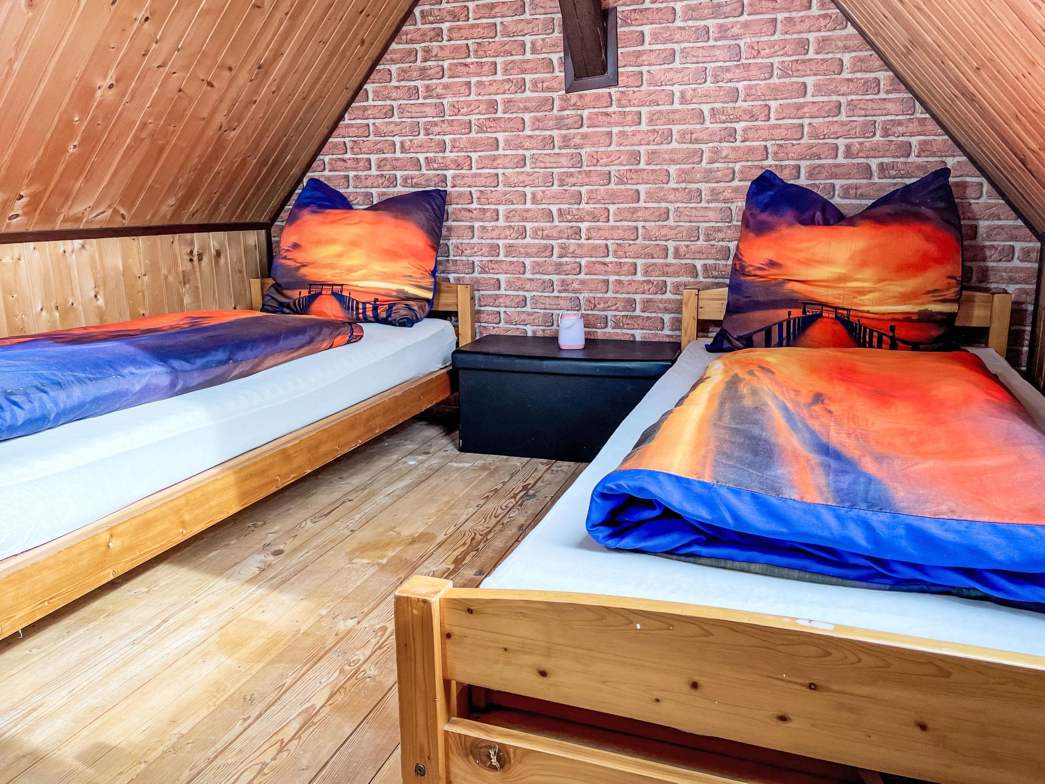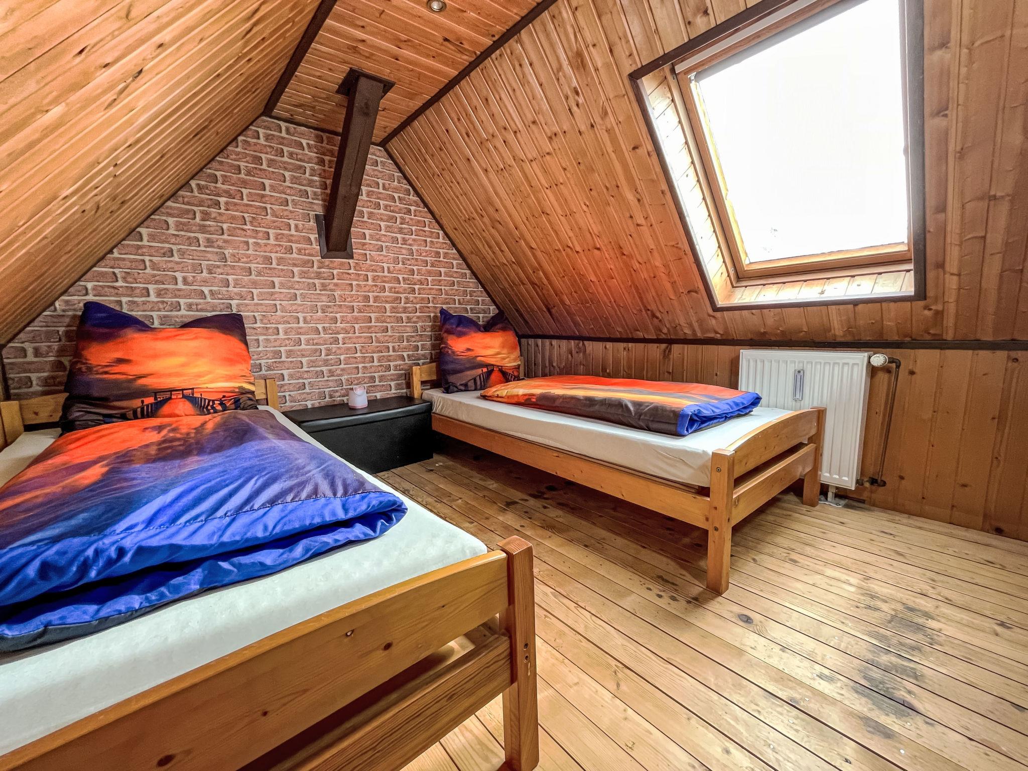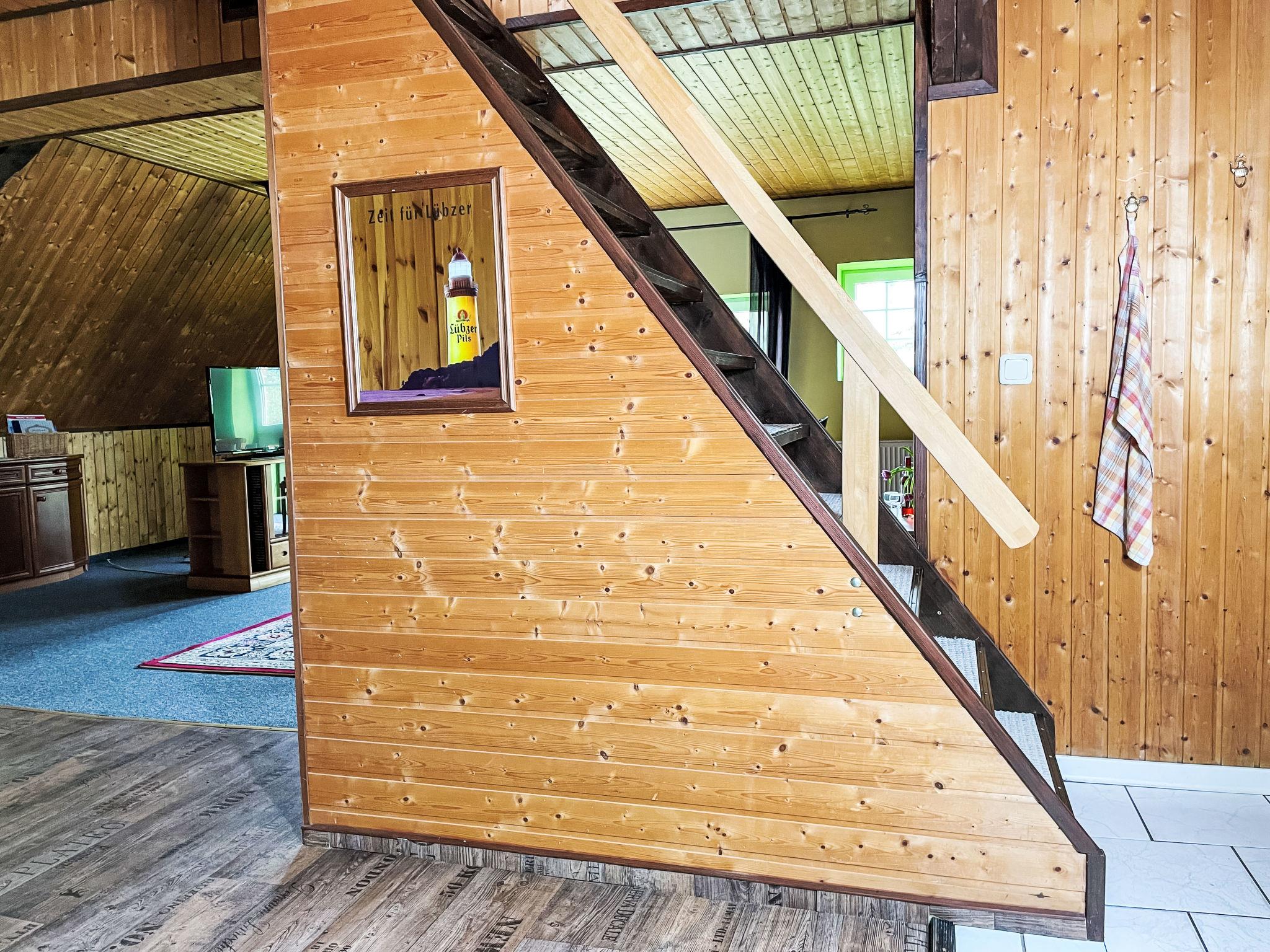 2-room apartment 60 m2, on the top floor. Spacious and bright, with sloping ceilings, renovated in 2022, cosy and wooden furniture furnishings: open living/dining room with sloping ceilings with panoramic window with 1 sleeping facility (145 cm, length 200 cm), dining table, satellite TV and flat screen. Open kitchen (oven, 4 ceramic glass hob hotplates, toaster, kettle, electric coffee machine). Bath/shower/WC. Upper floor: (steep stair), 1 double bedroom 12 m2, with sloping ceilings with 2 beds (90 cm, length 200 cm). Beautiful view of the countryside. Facilities: children's high chair, baby cot for up to 3 year olds. Internet (WiFi, free). Please note: suitable for families. Non-smokers only. Maximum 1 pet/ dog allowed. Private entrance, smoke alarm. Attention steep internal staircase!