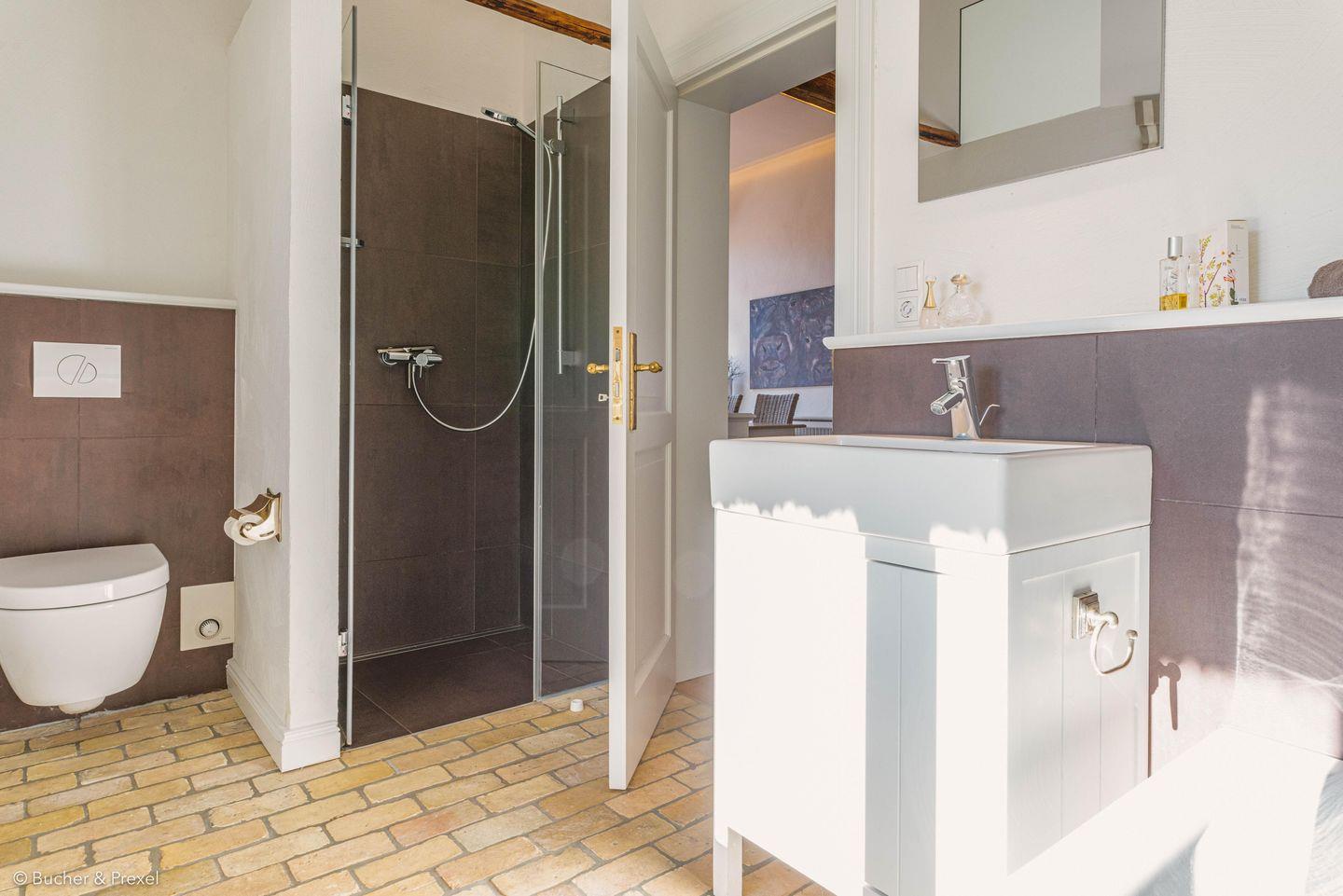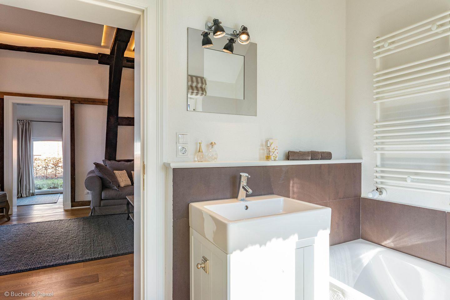 Das in erdnahen Tönen gestaltete Badezimmer mit Dusche und Badewanne verfügt über eine Handtuchheizung und ausreichend Ablagemöglichkeiten für deine persönlichen Kosmetikprodukte. Handtücher und einen Haartrockner bekommst du von uns gestellt. Das Apartment bietet außerdem ein zusätzliche kleine Gästetoilette.