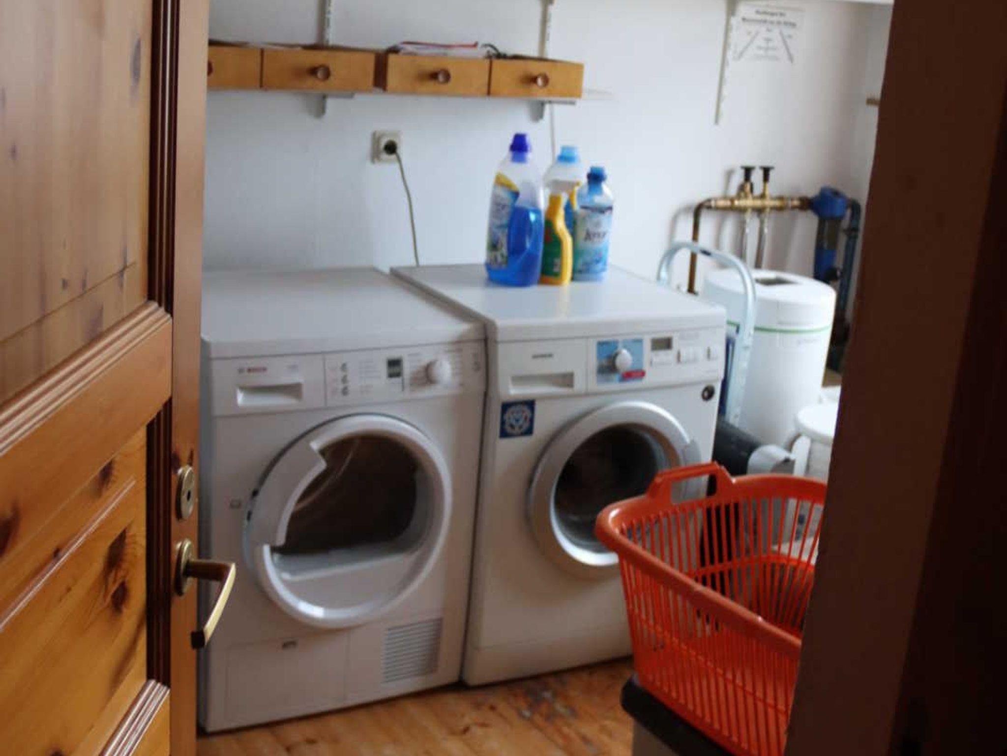 Im Hauswirtschaftsraum befinden sich eine Waschmaschine, ein Trockner und ein Bügelbrett.