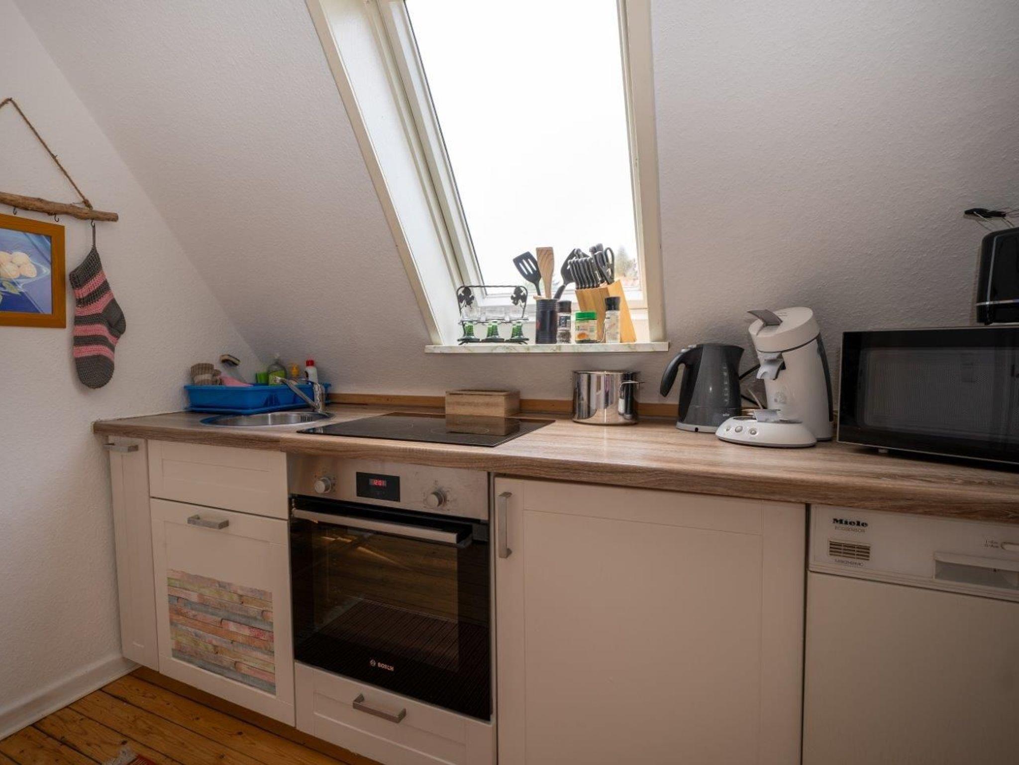 Die Unterkunft ist weiterhin ausgestattet mit einer kleinen Küche in der die wichtigsten Dinge, wie ein 4-Plattenherd, Geschirrspüler, Kaffeemaschine, Senseo Pad Mascine, Toaster, Mikrowelle, Wasserkocher, Sandwichmaker, Kühlschrank mit Gefrierfach und Geschirr vorhanden sind.