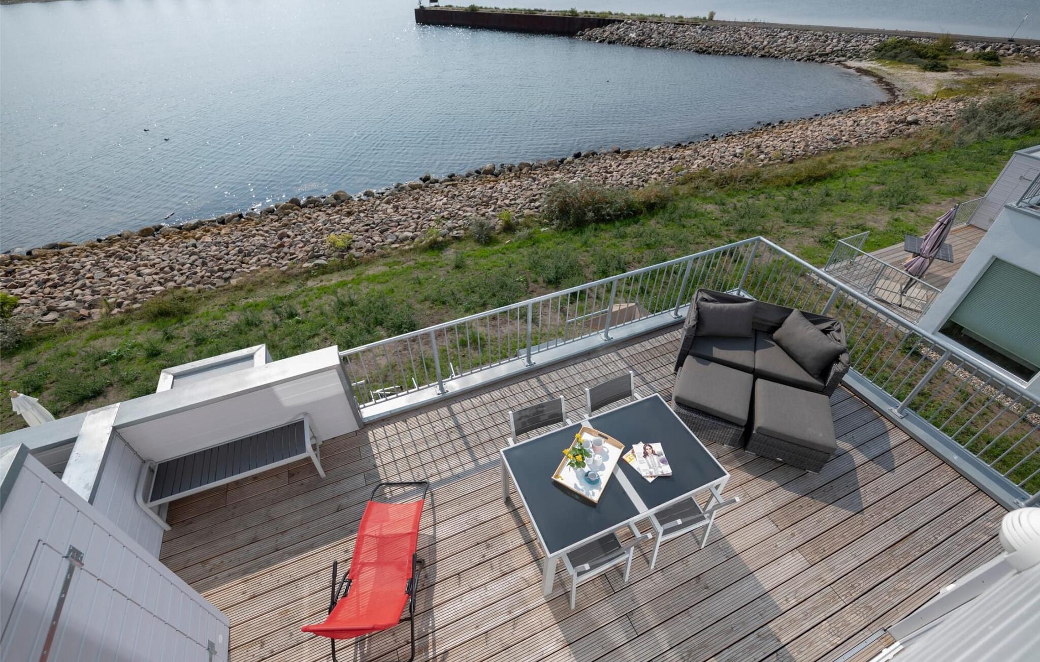 En fantastisk udsigt åbner op på terrassen ved siden af ??spisepladsen med udsigt over sejler- og sportsbådshavnen i OstseeResort Olpenitz. Uanset om det er en romantisk middag i levende lys eller en hyggelig grillfest, er en havnebiograf og en fantastisk solrig udsigt garanteret. Komfortable havemøbler og en elektrisk grill er til rådighed til feriebrug.