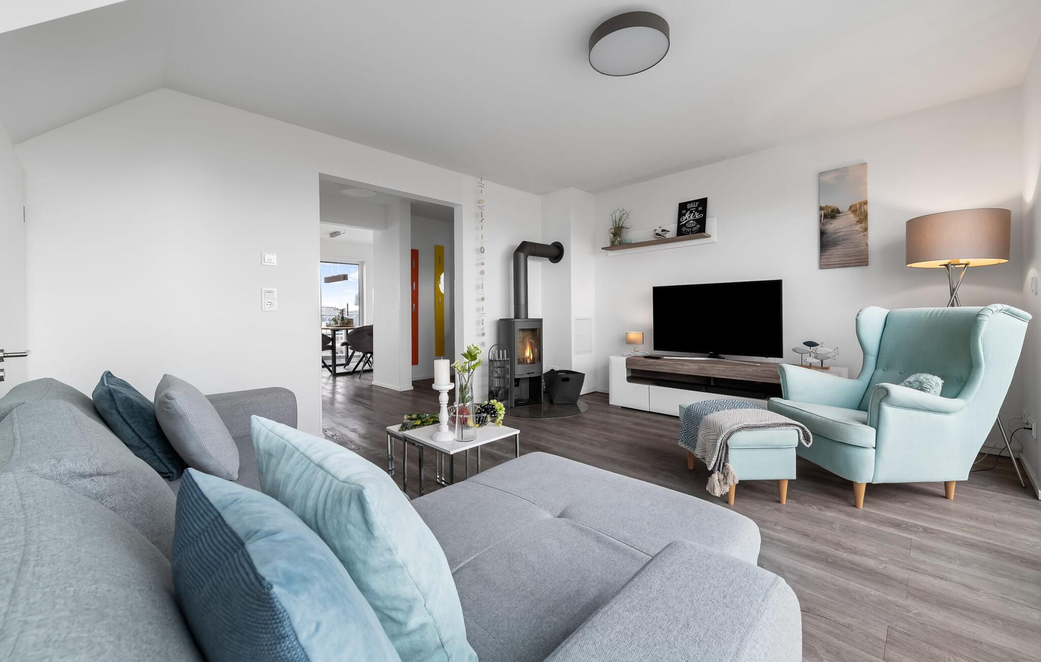 Der bliver hyggeligt i stuen, hvor en hyggelig siddegruppe indbyder til at nyde en aften ved pejsen på dårlige vejrdage. Det store Smart TV med soundbar, subwoofer og Bluetooth sørger også for indendørs underholdning.