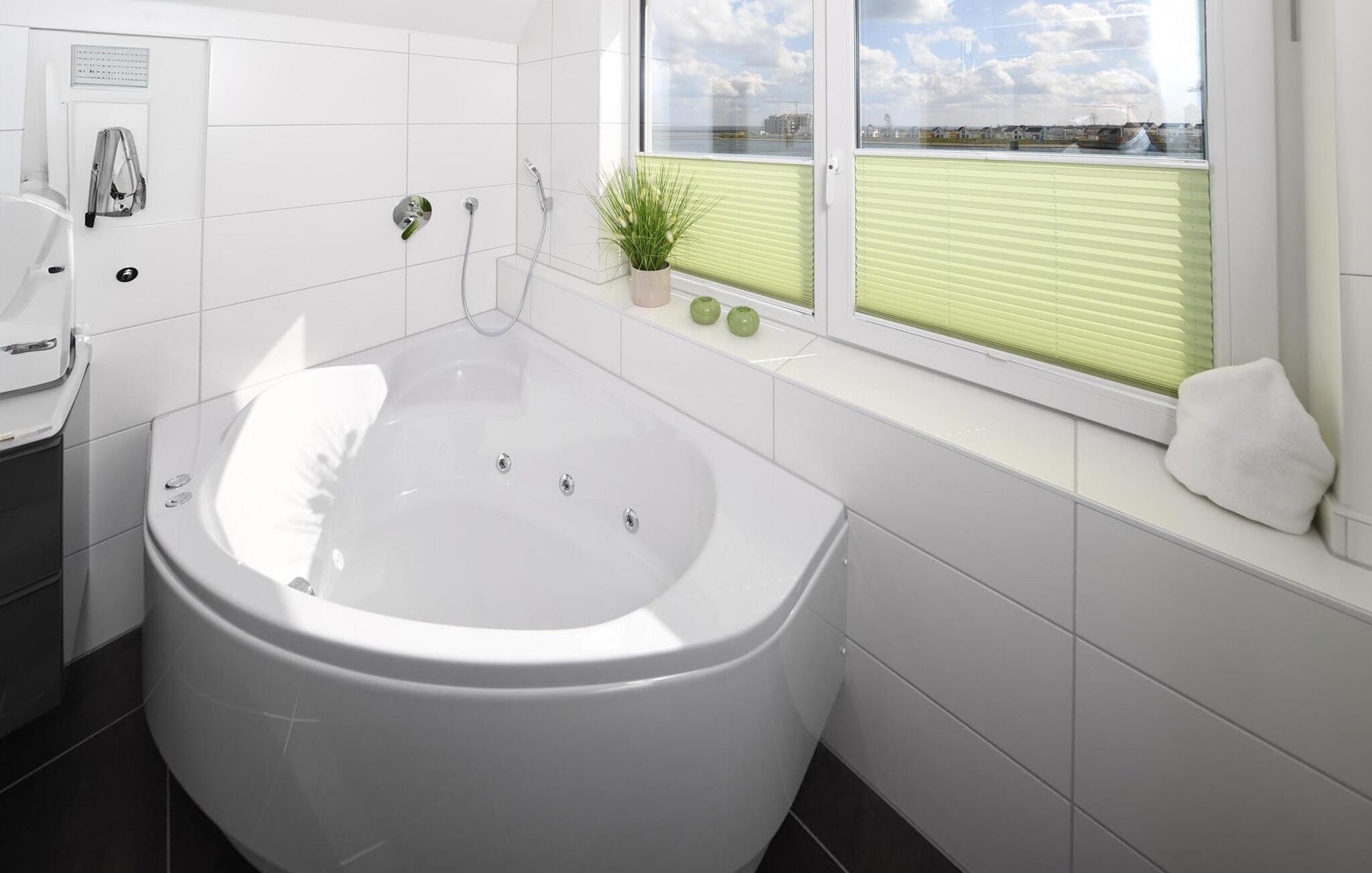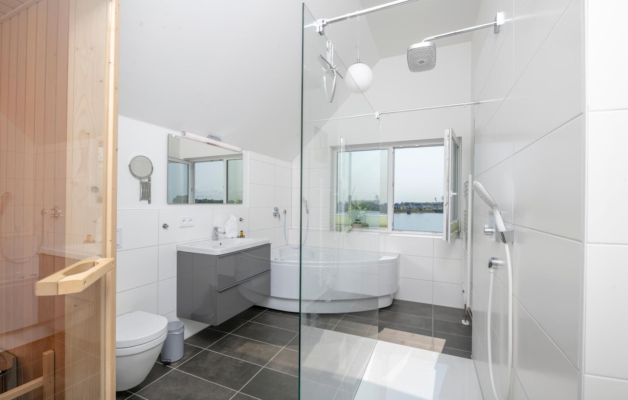 Det private wellness-område inviterer jer til at slappe af: en finsk sauna og et afslapningsboblebad med udsigt over vandet er til rådighed til at slappe af i efter en gåtur på stranden. Den store, åbne bruser på gulvniveau giver fri udsigt over havet.
